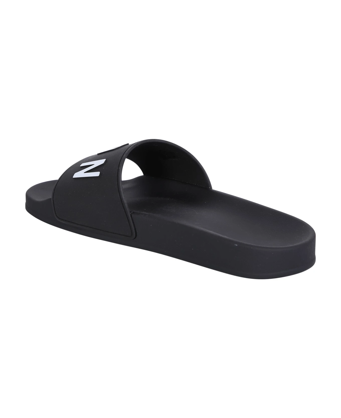 Roundtoe. Open toe. Slip-on style. Embossed logo to the front. Embossed logo to the side. Flat rubber sole. Color: black