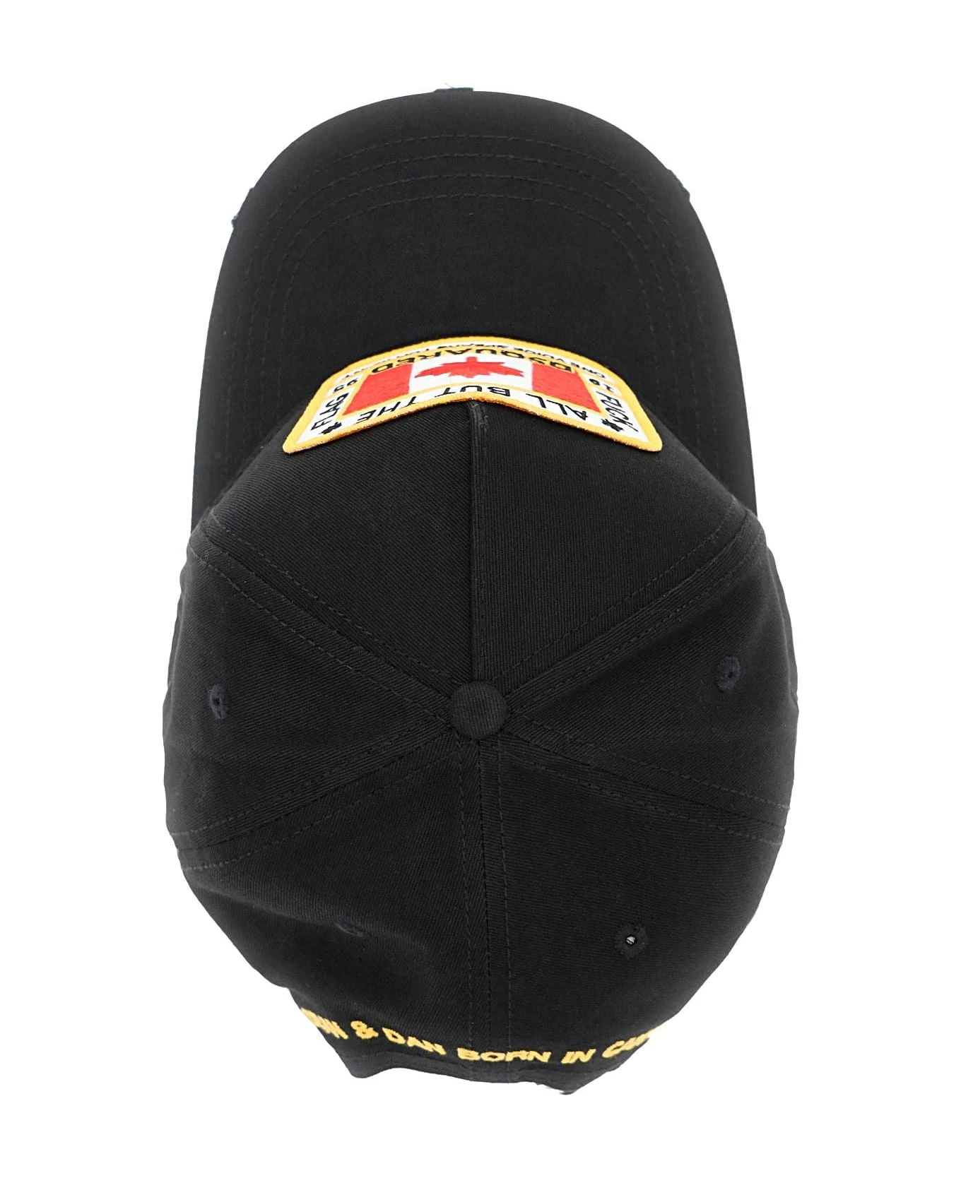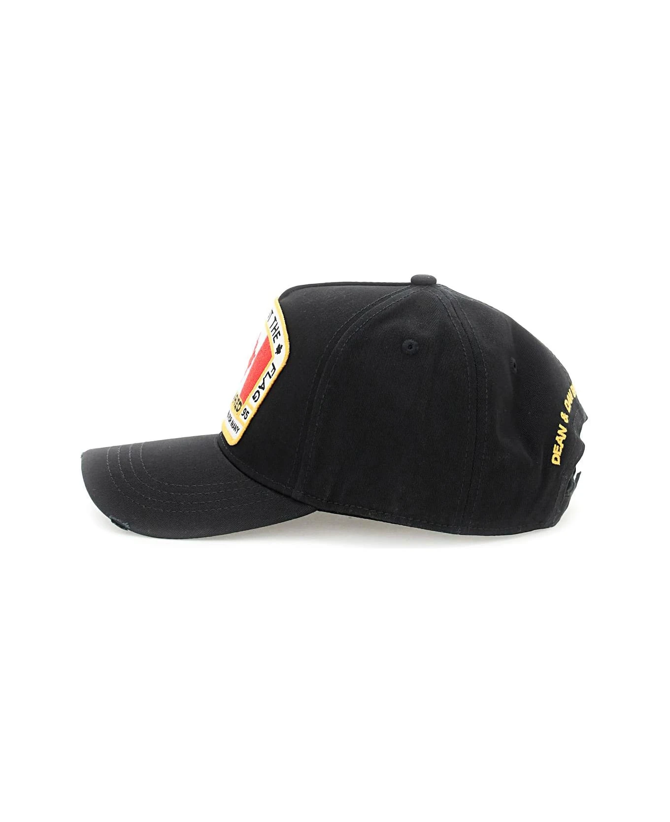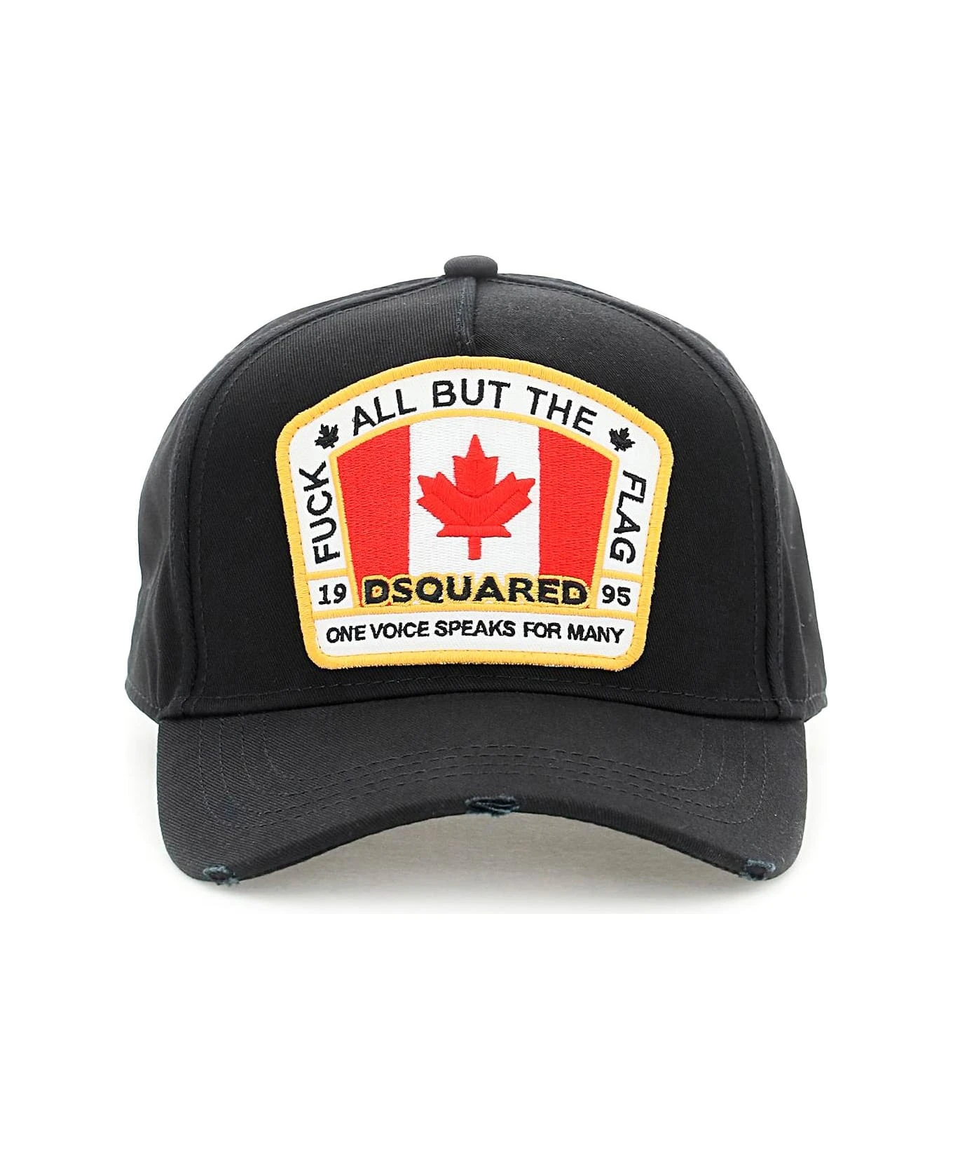Dsquared2 baseball cap in cotton twill with used-effect details on the visor. Decorated with maxi Canadian Flag patch on the front and embroidered lettering on the back. Embroidered ventilation eyelets, top button, adjustable backstrap with sliding buckle, unlined interior.