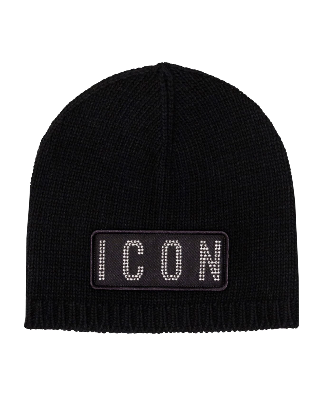 Black beanie. Icon patch with studs.