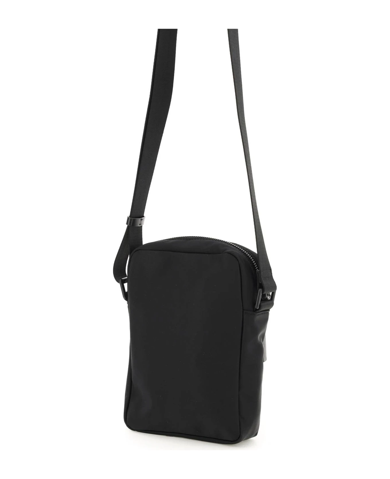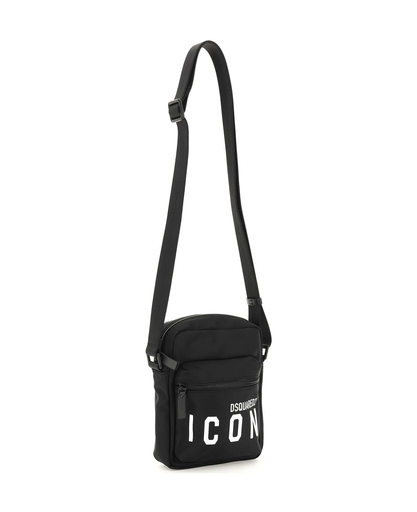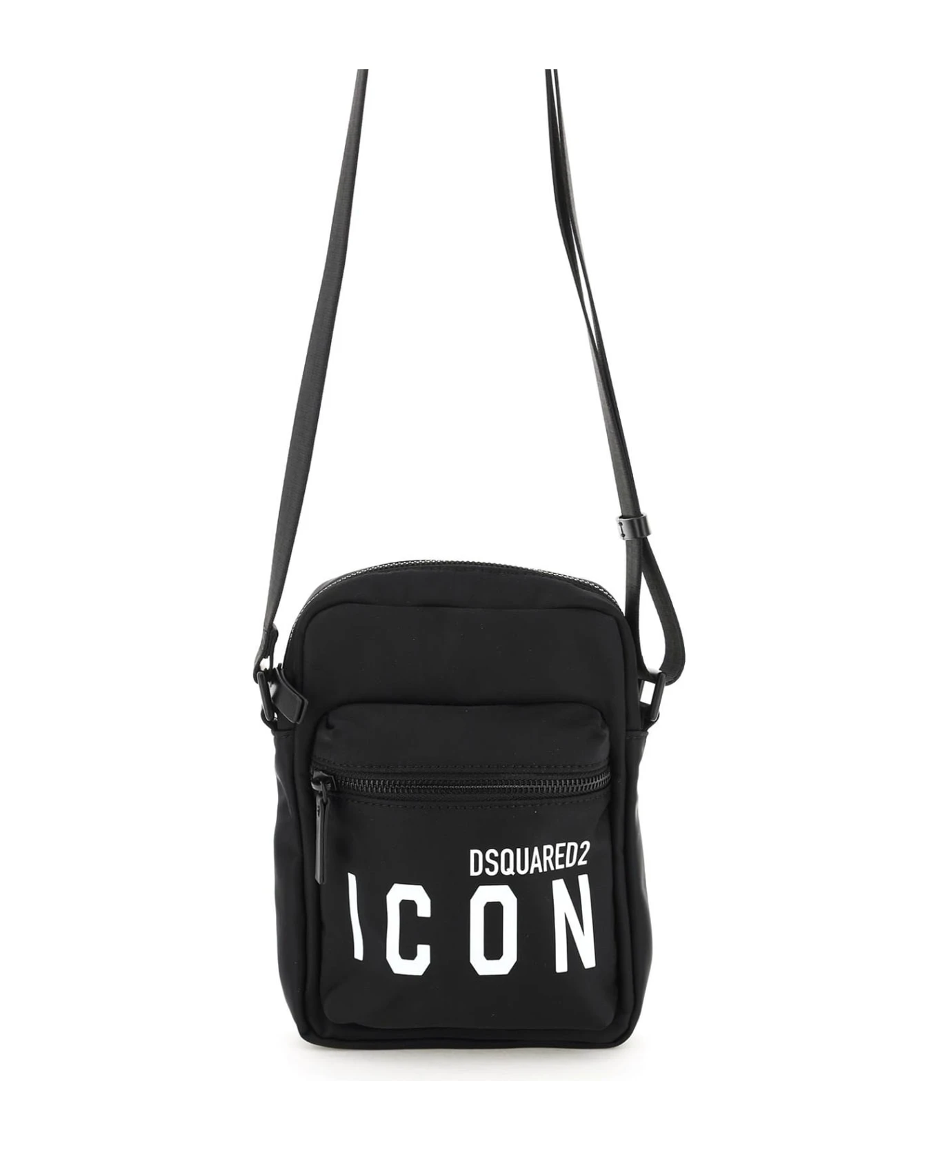 DSquared2 crossbody bag crafted in nylon with contrasting ‘ICON’ logo print on front, adjustable webbing strap with leather details and front zipped pocket. Main compartment with zip closure, nylon lining and one inner open flat pocket. Tone-on-tone painted metalware.