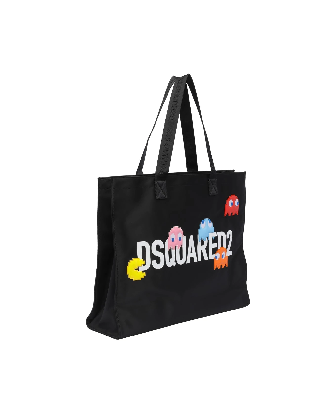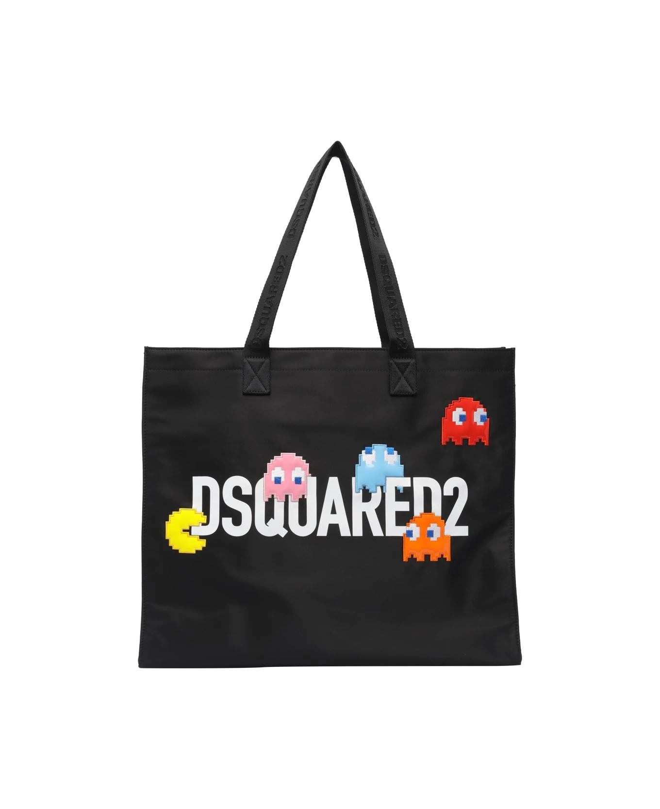 Dsquared2 black Pac-Man tote bag, inner zipped and open pocket, 2 handles, frontal logo and print