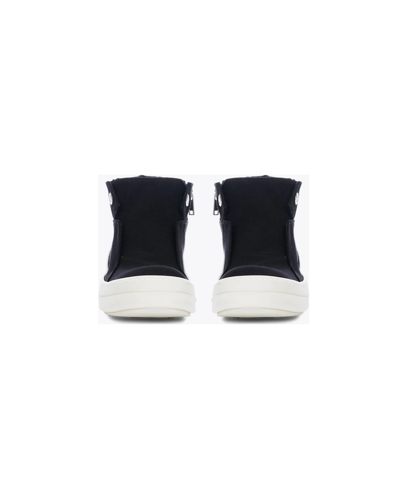Black canvas mid sneaker with metal zip closure. Metal eyelets detail. Off white rubber sole. Made in Italy.
