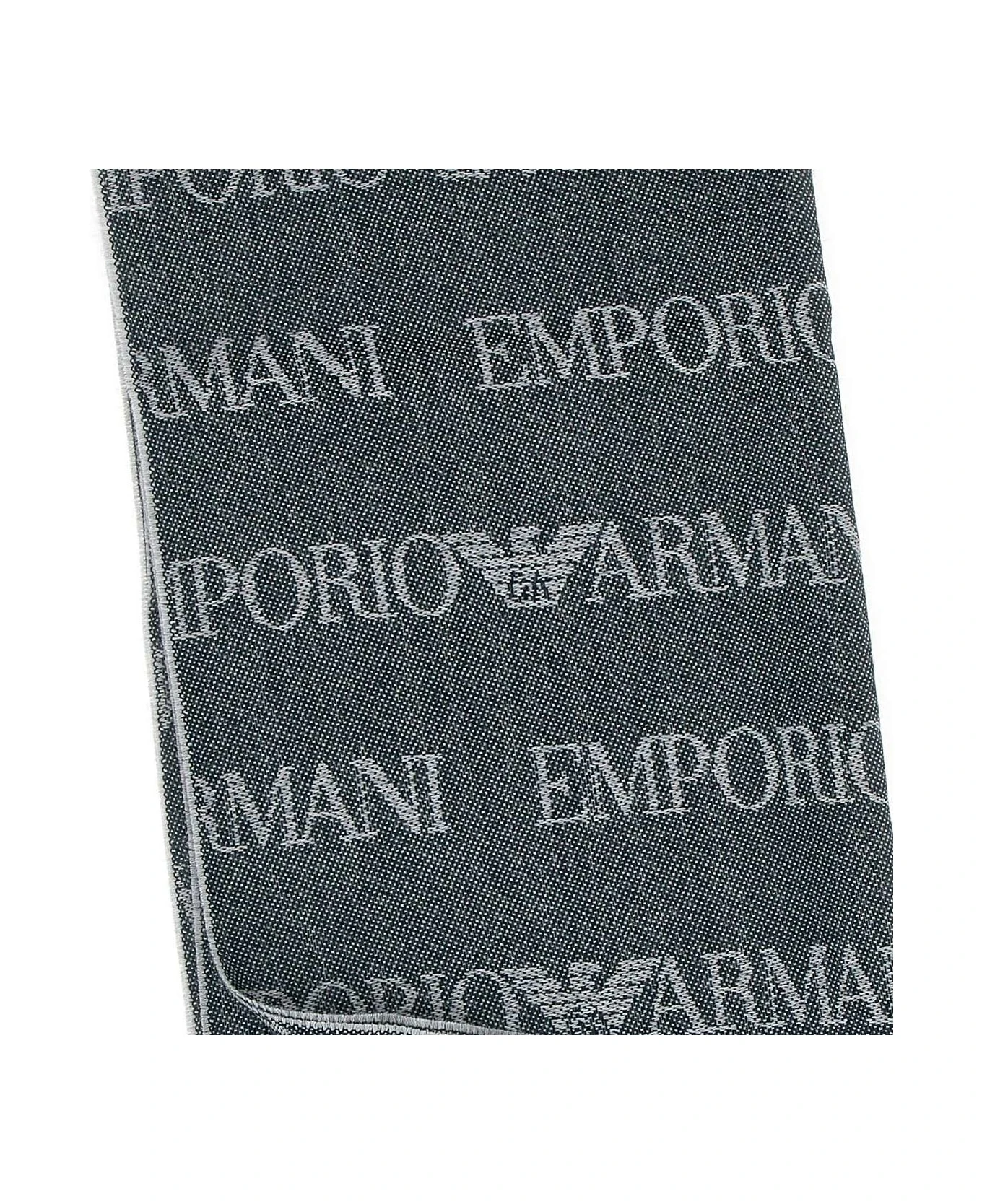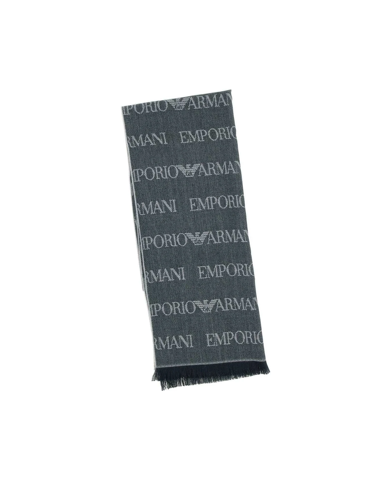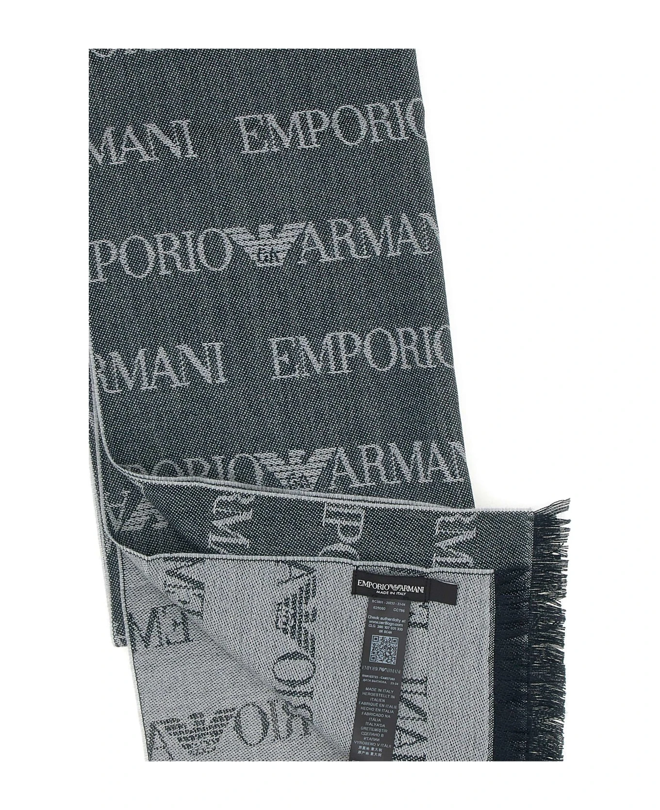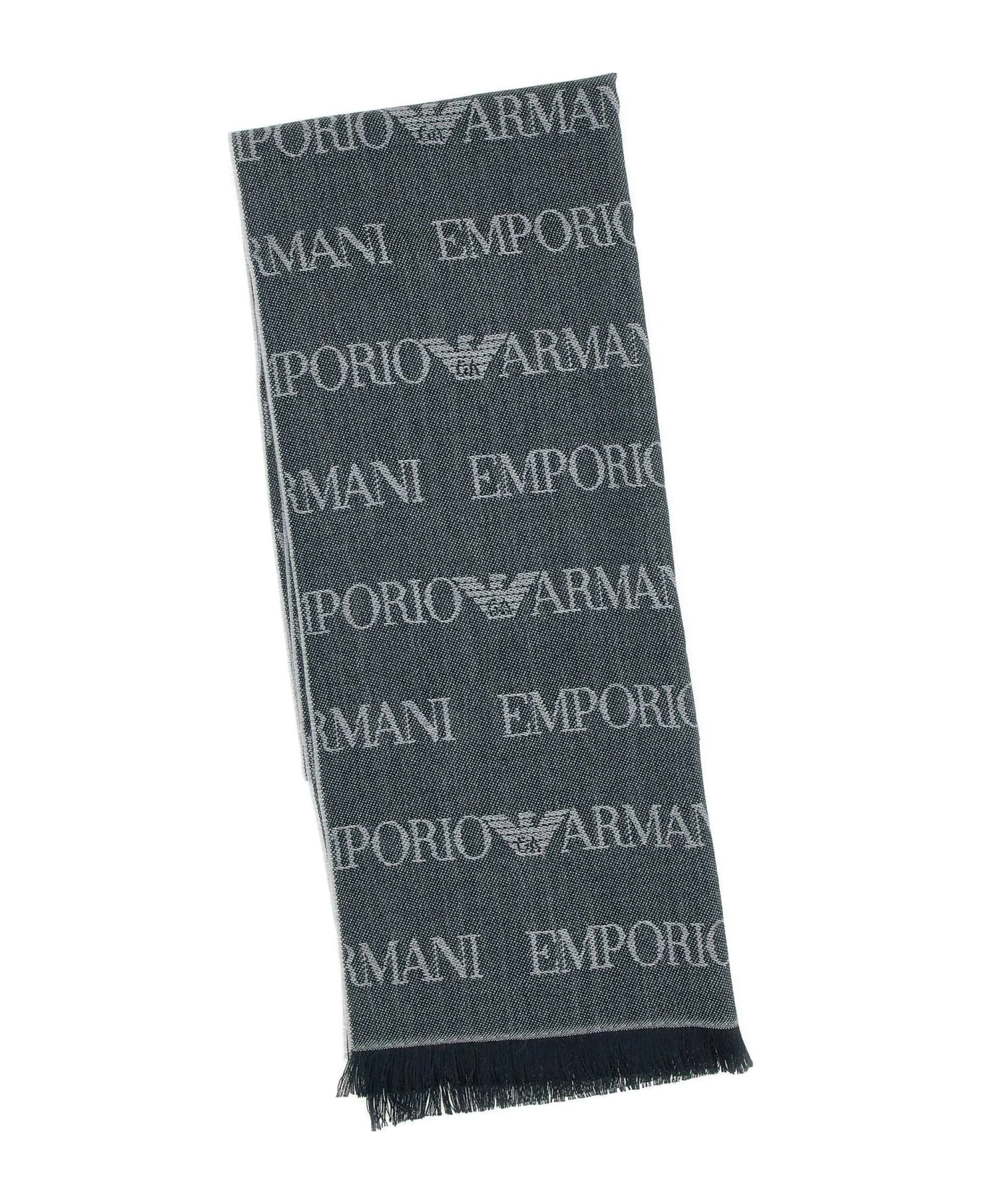 Emporio Armani wool blend stole, grey color, black color, all over logo, fringed edges. Dimensions: 150 x 43 cm. One size. Made in Italy.