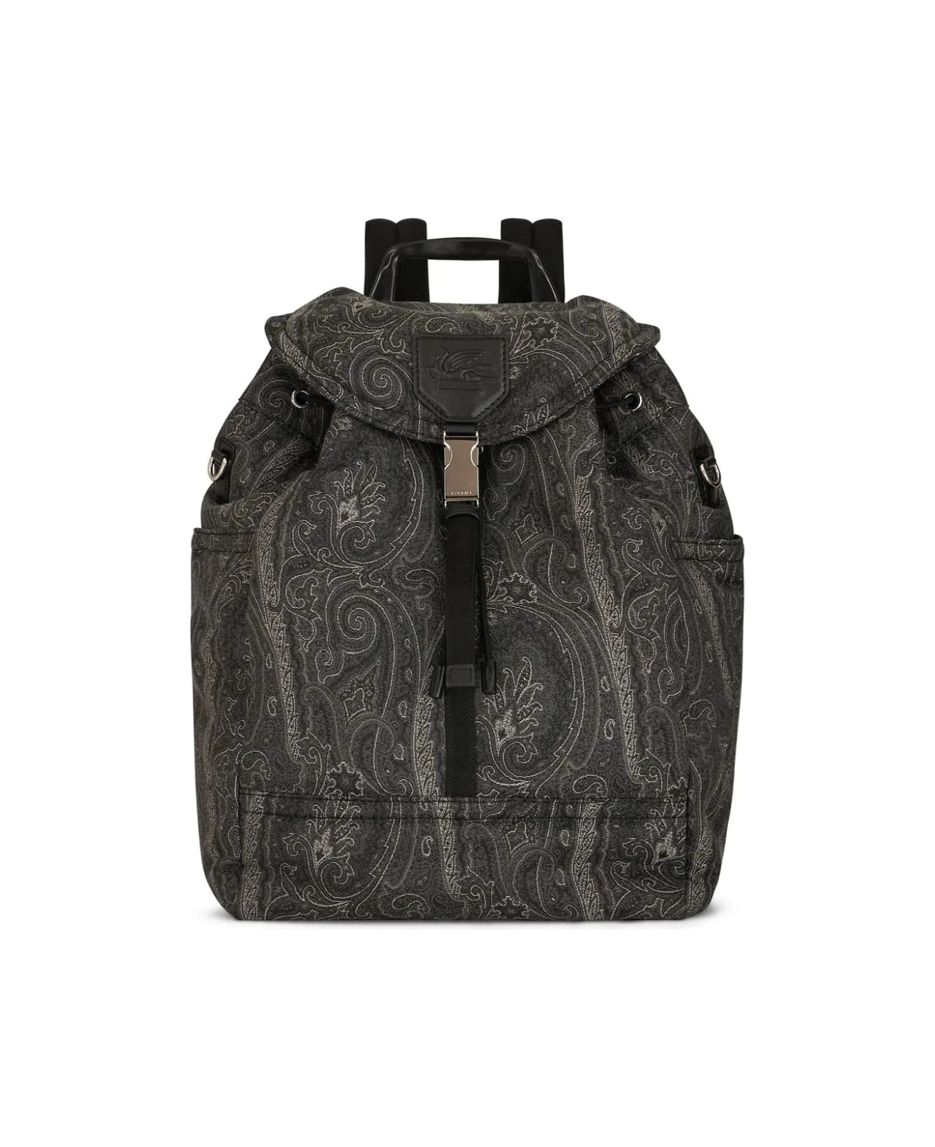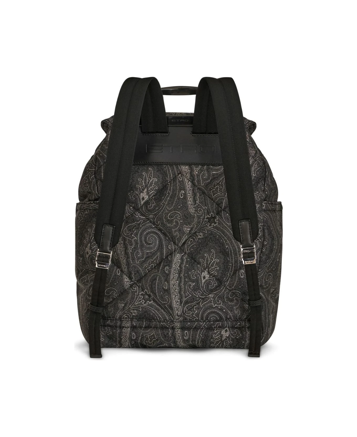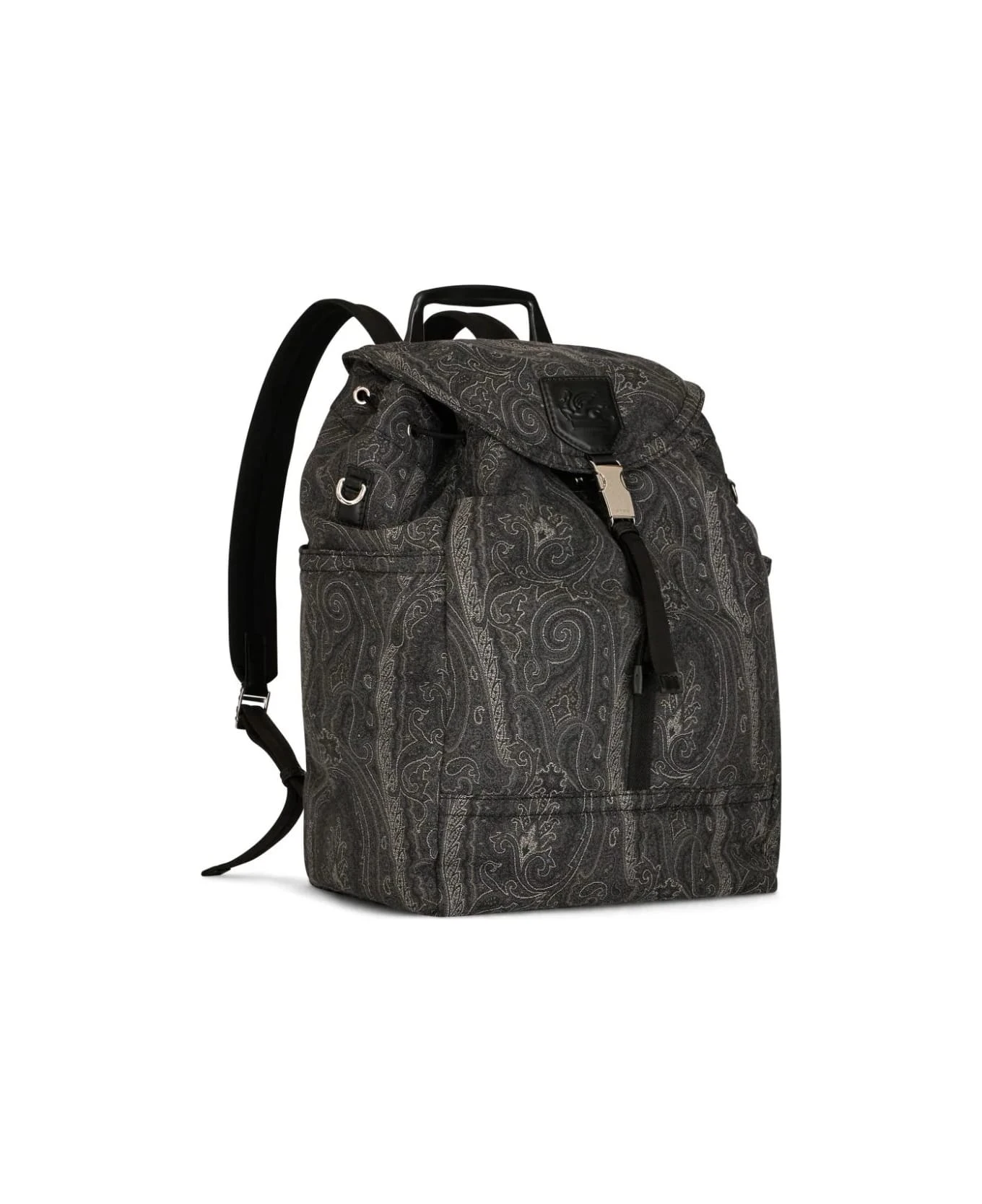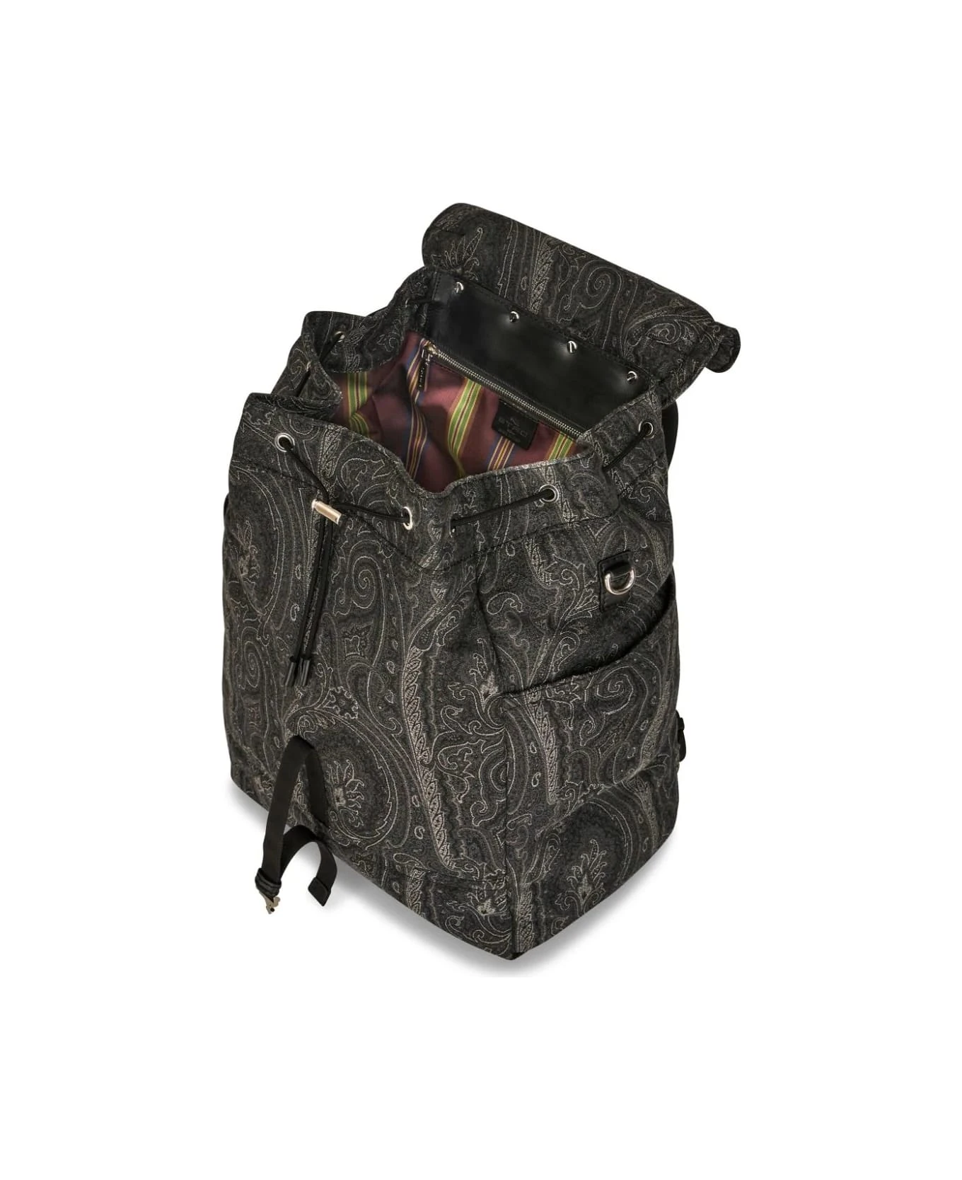 Etro backpack crafted from the iconic black Paisley jacquard canvas and featuring adjustable shoulder straps (49 cm), a handle (33 cm), side pockets, an internal zipped pocket, a clip and drawstring closure, a leather label with Etro and Pegaso logos and ruthenium-coloured metal hardware. Inside, the backpack reveals a jacquard striped lining.