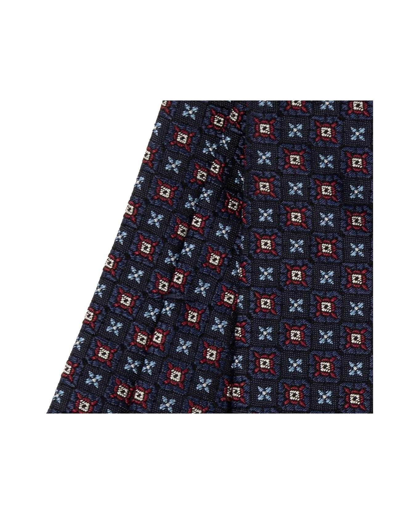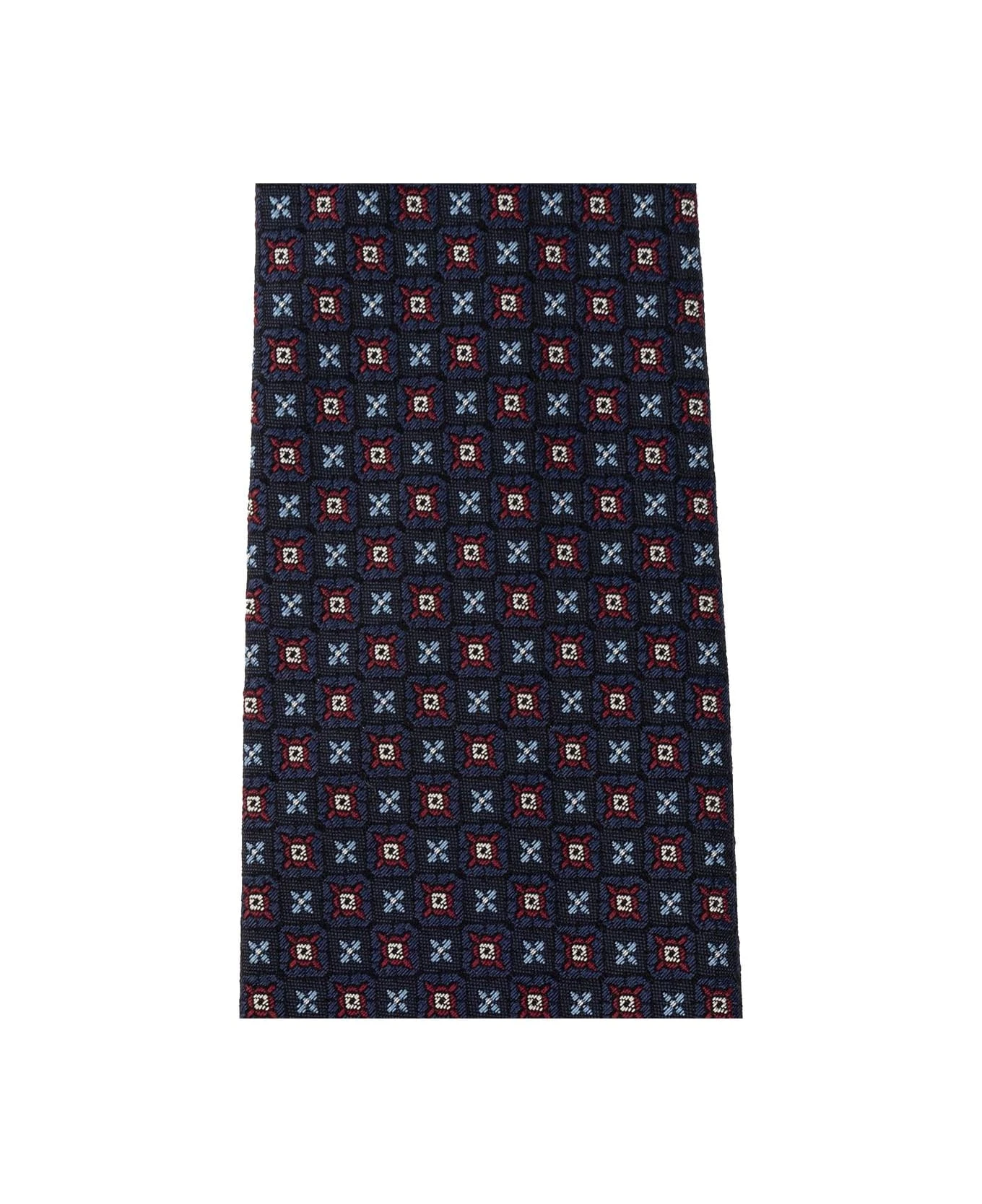 Navy tie from Etro. Made of silk decorated with a multicolored geometric and floral pattern.
