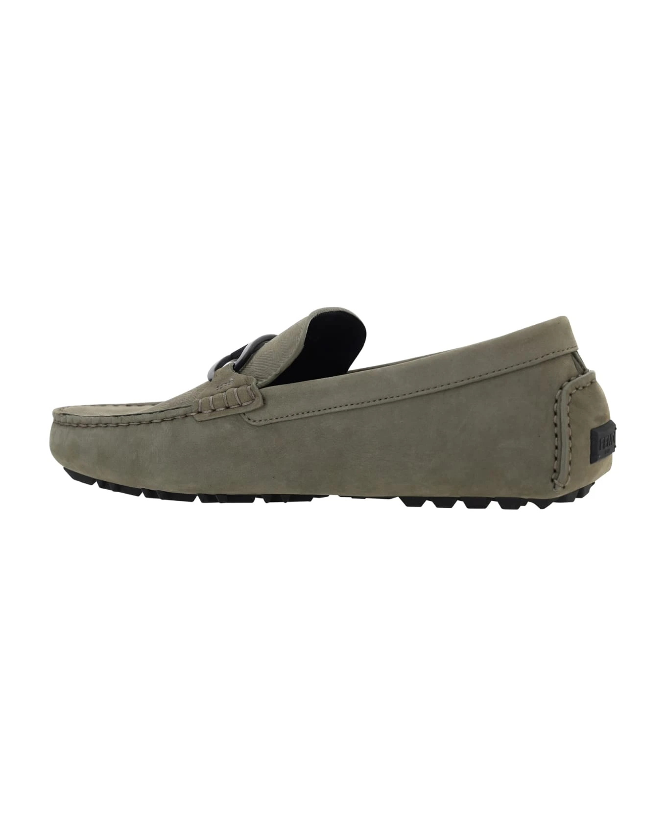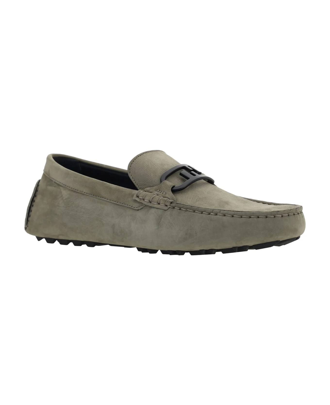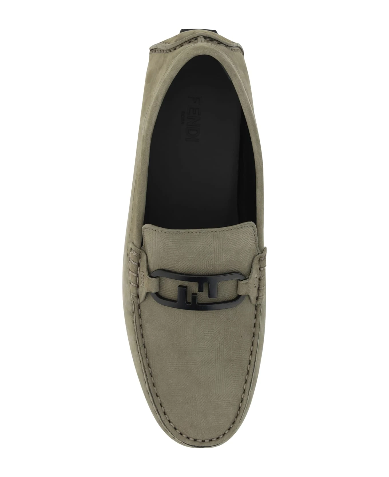 Calfskin driver loafers by fendi, slightly elongated round toe, textured and knurled sole, front tray embellished with iconic ff baguette plate, pressure logoed insole, embossed logoed heel.