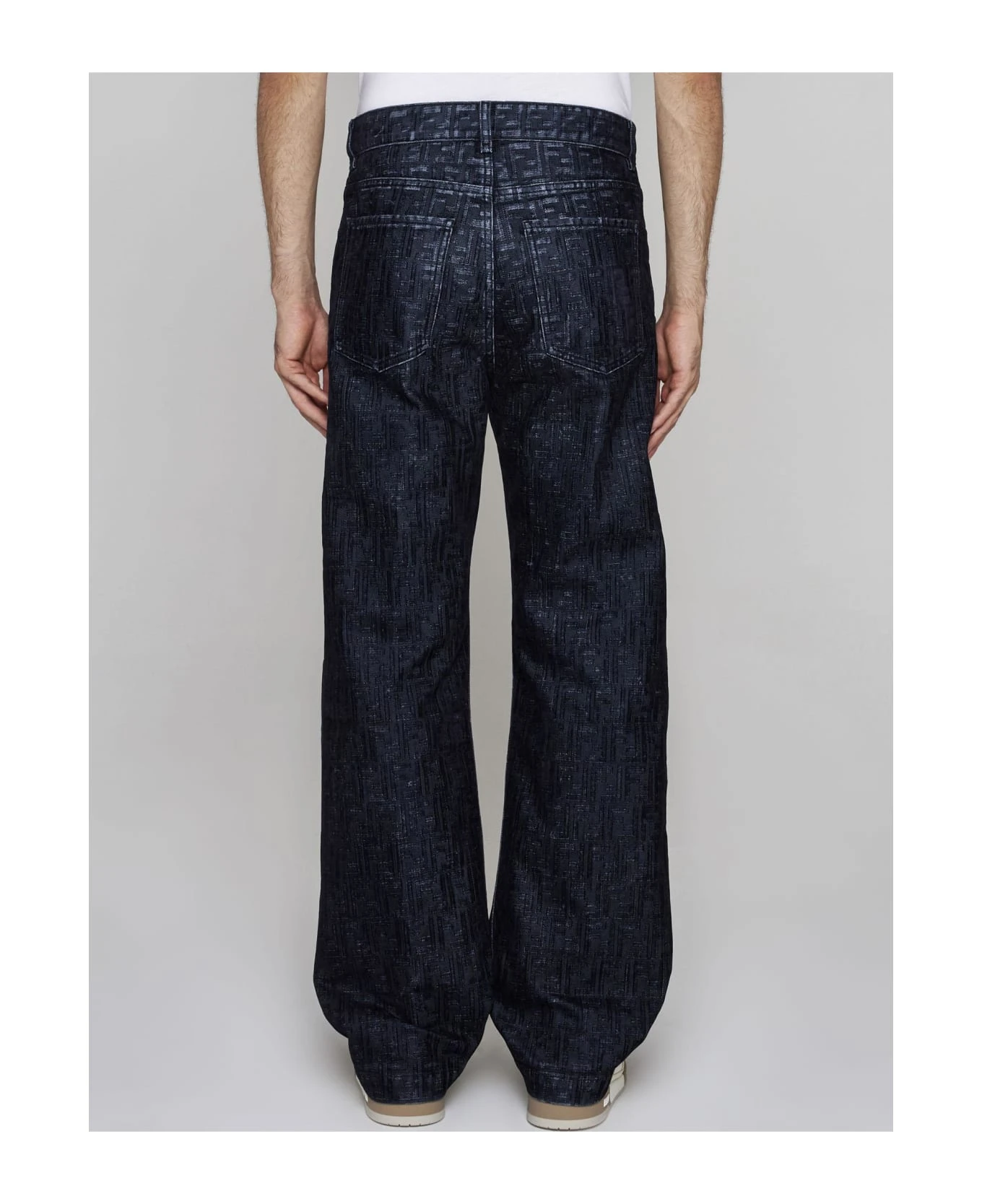 Fendi’s blue lame’ jacquard denim jeans featuring all-over FF motif, belt loops, button and zip fly, five-pocket cut and wide, straight leg.