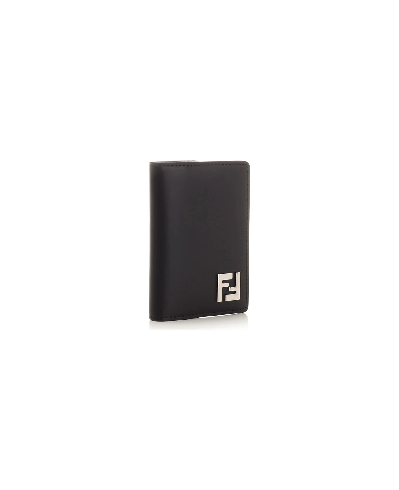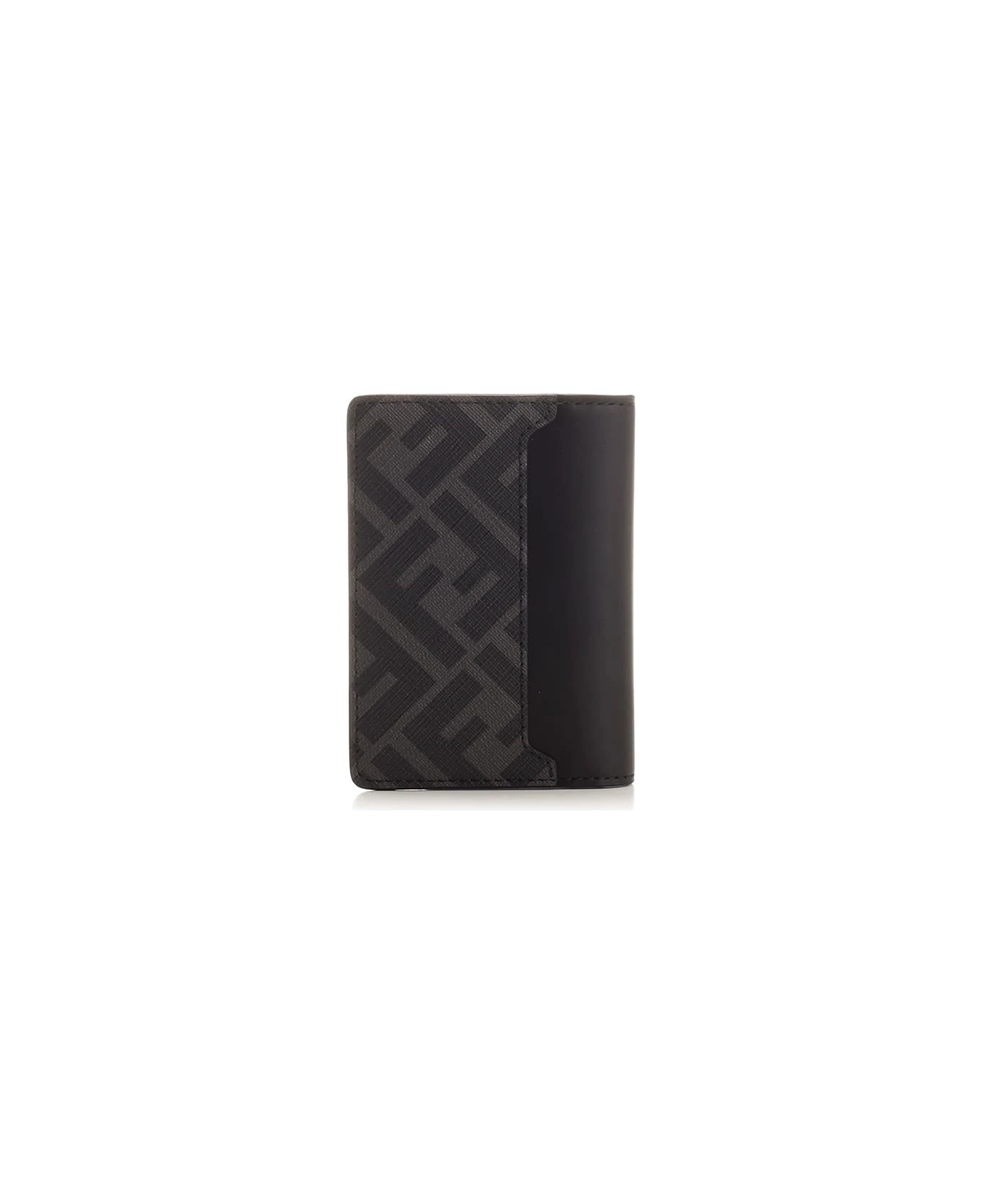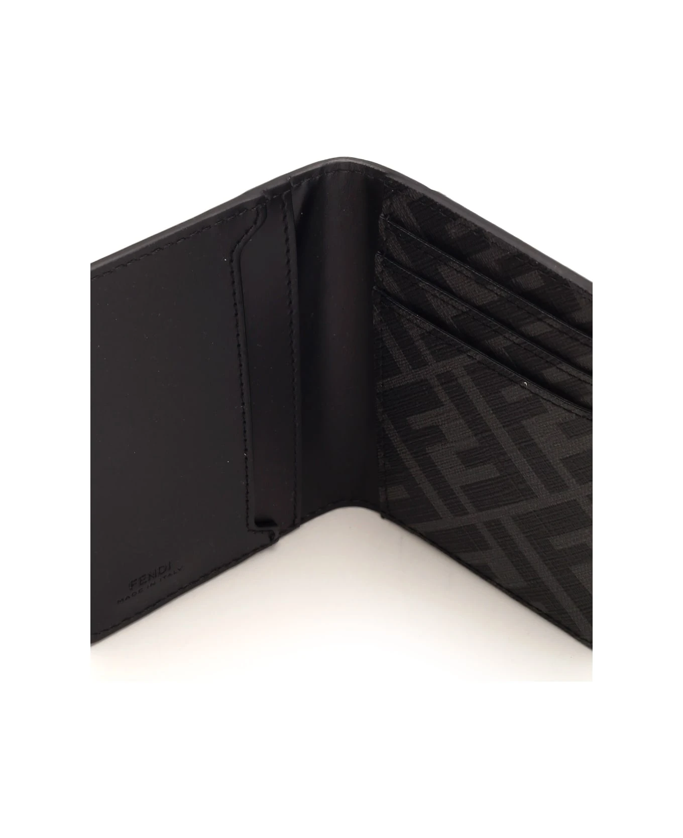 Black ‘FF Squared’ bifold card holder from Fendi in leather, three card slots, three side slots, finished with FF fabric detail in shades of gray and black, FF Squared metal accessory with palladium finish.