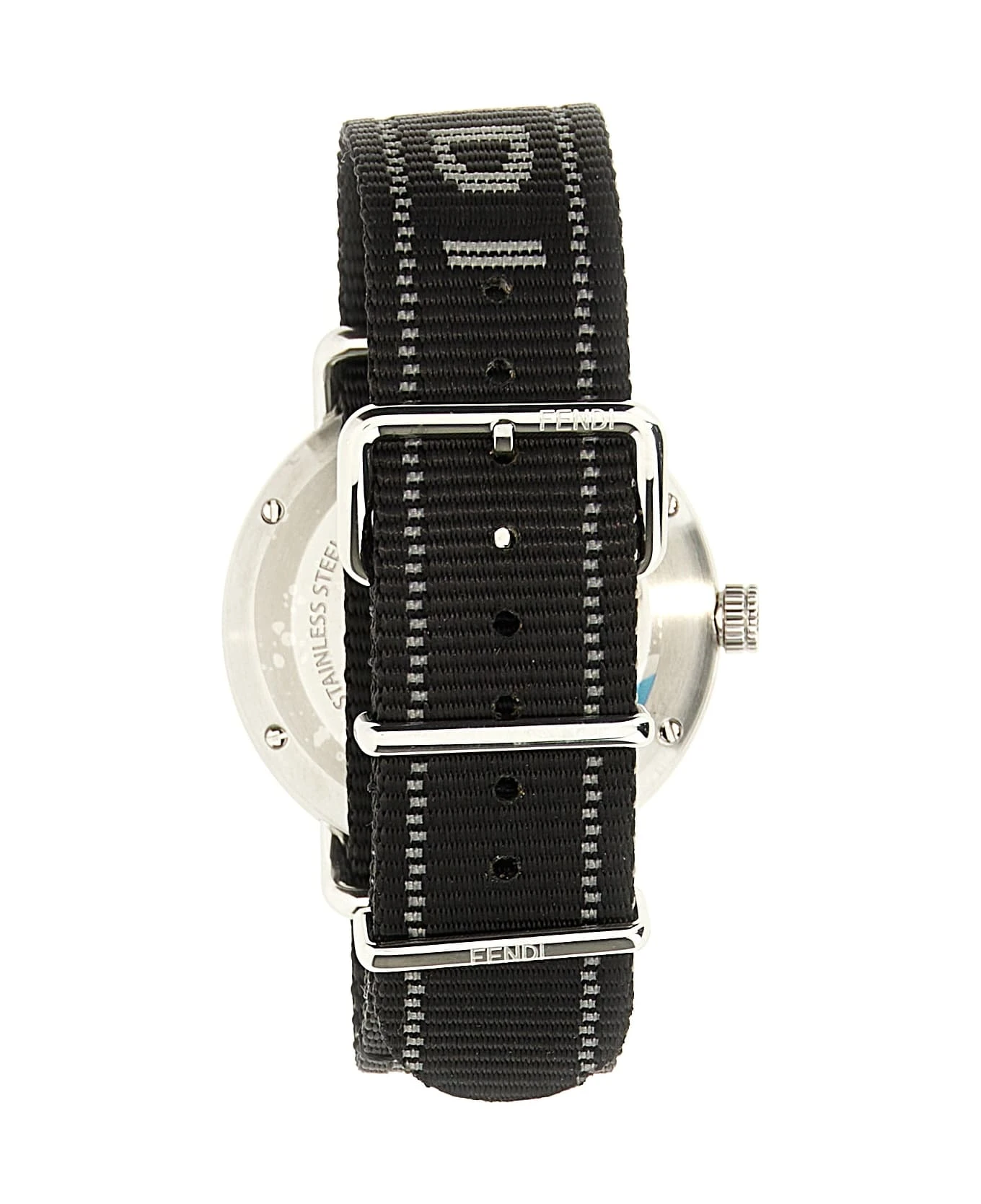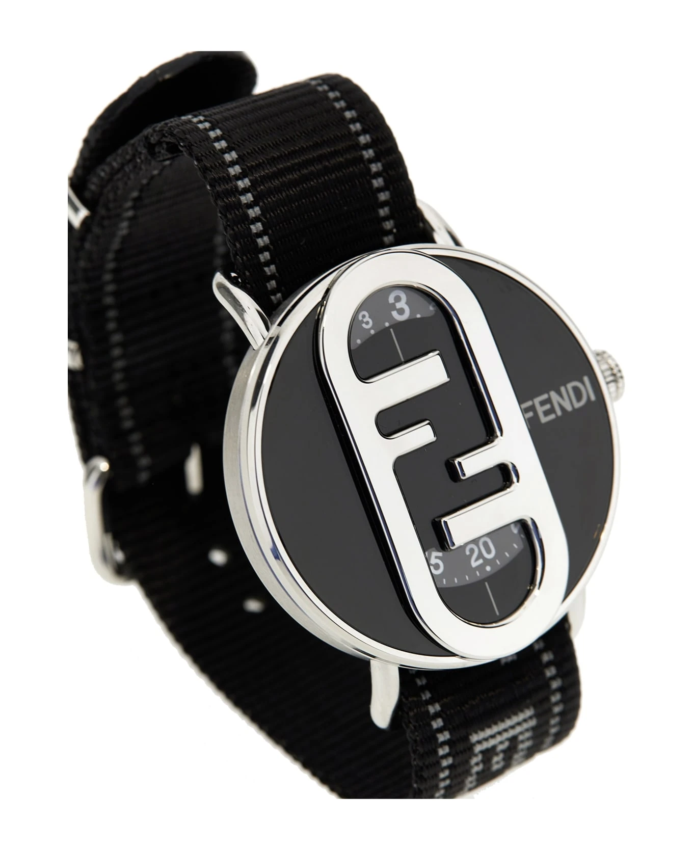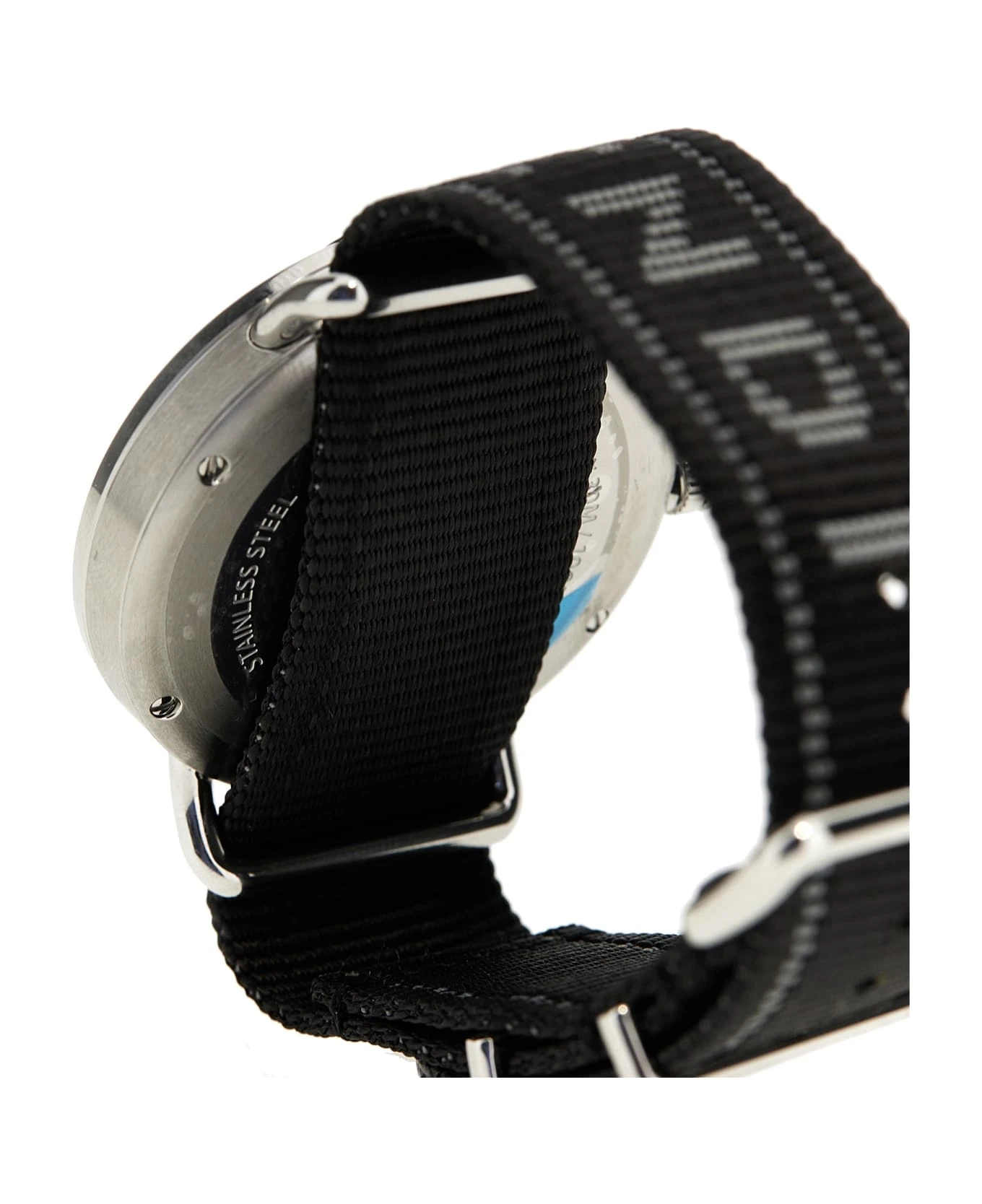 ‘O’Lock roud’ watch with 42 mm round stainless steel case and logo detail. Matte sapphire glass dial with logo. Nylon bracelet with jacquard logo.