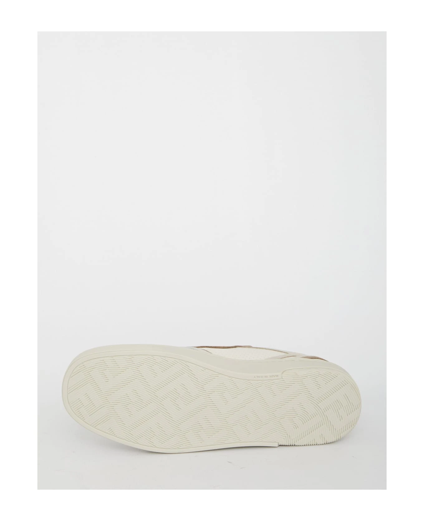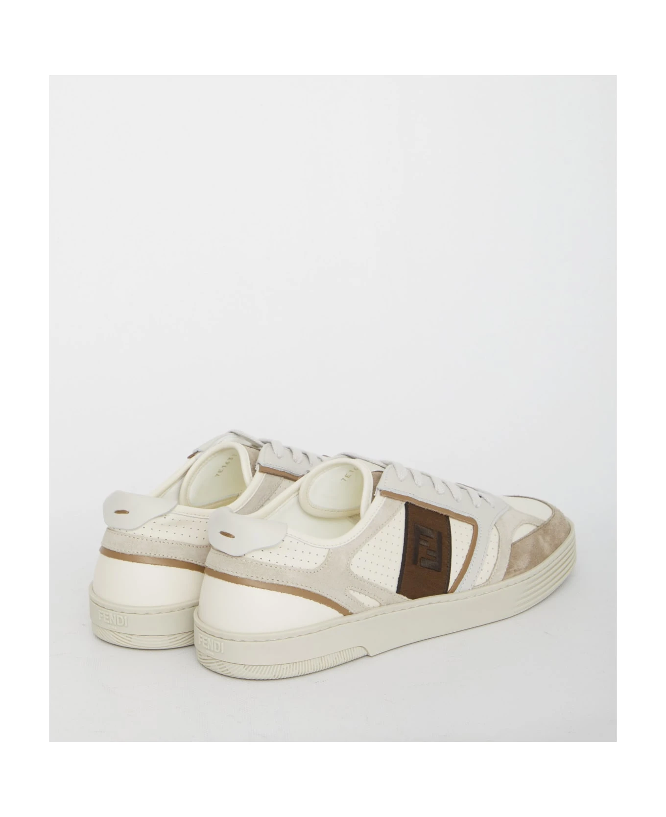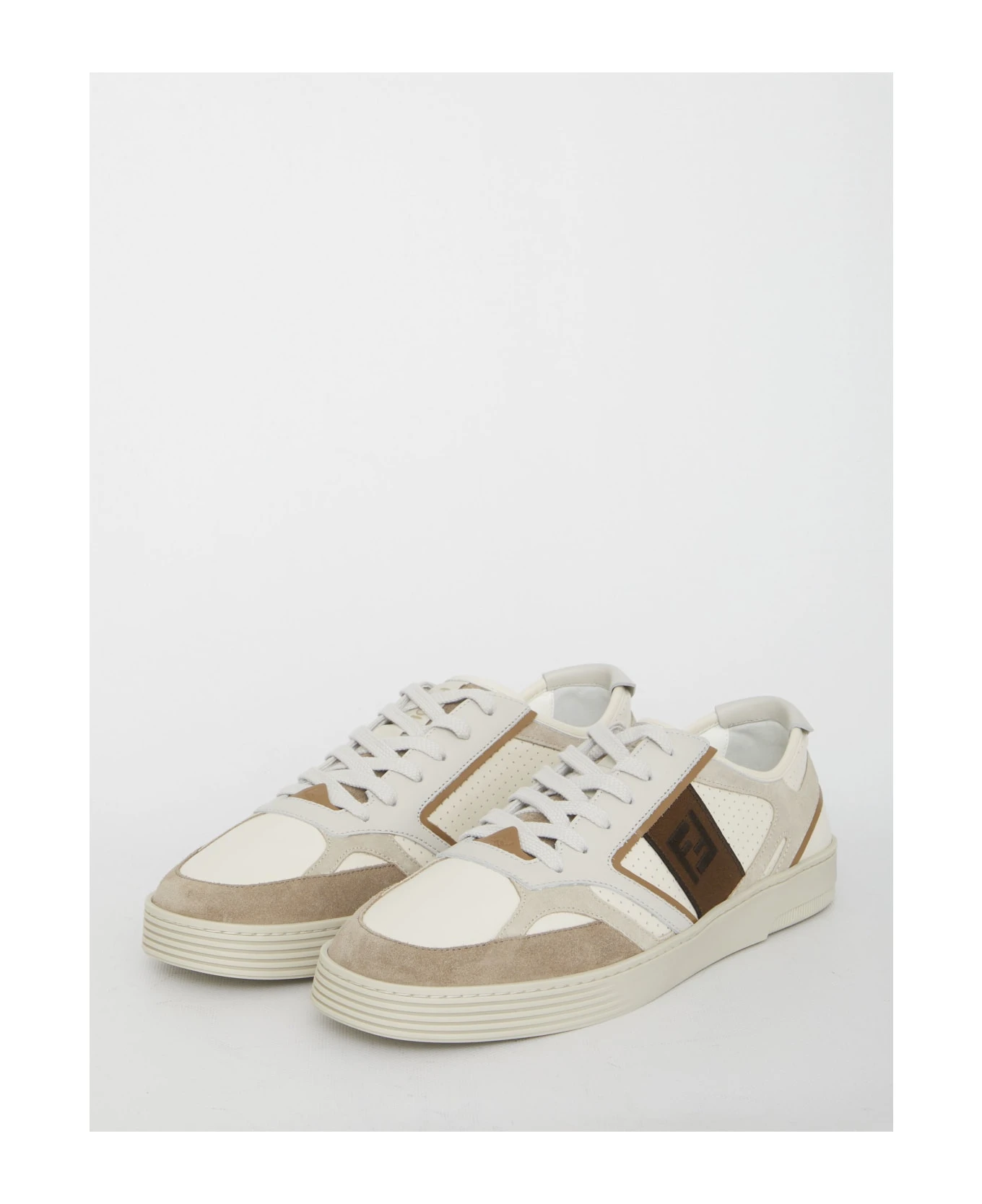 Fendi Step sneakers crafted from leather and suede in the shades of beige, brown and grey. Lace-up closure, micro perforations at the sides and ribbon with FF embroidery. Rubber sole with Fendi Roma lettering at the back.