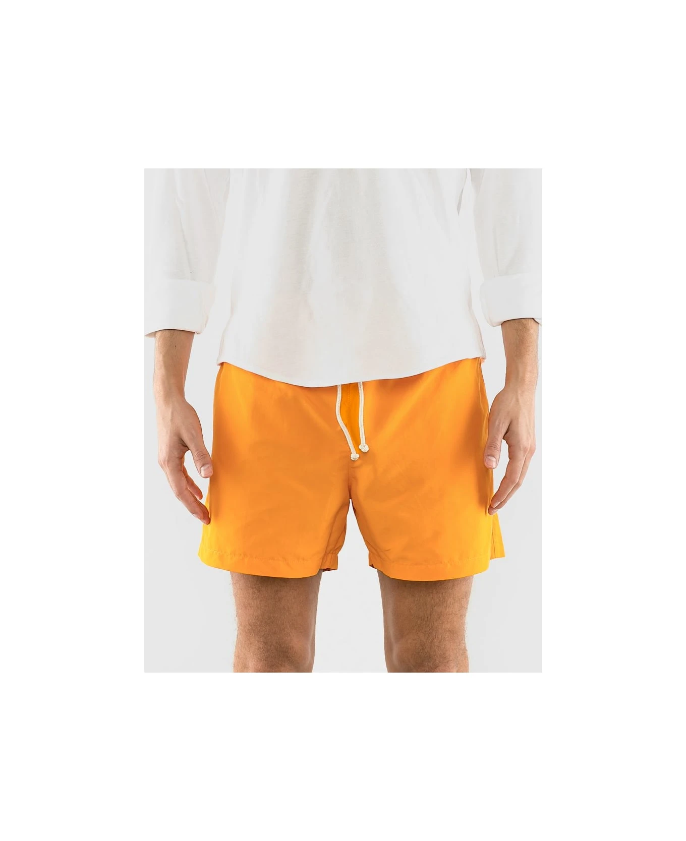 The classic swim shorts were redesigned for a more elegant, tailored look and a comfortable fit. Made from soft, brushed fabric that is quick-drying and has a distinctive cotton-feel. Tying-cord made from braided nautical rope in unbleached cotton. Made in Italy.