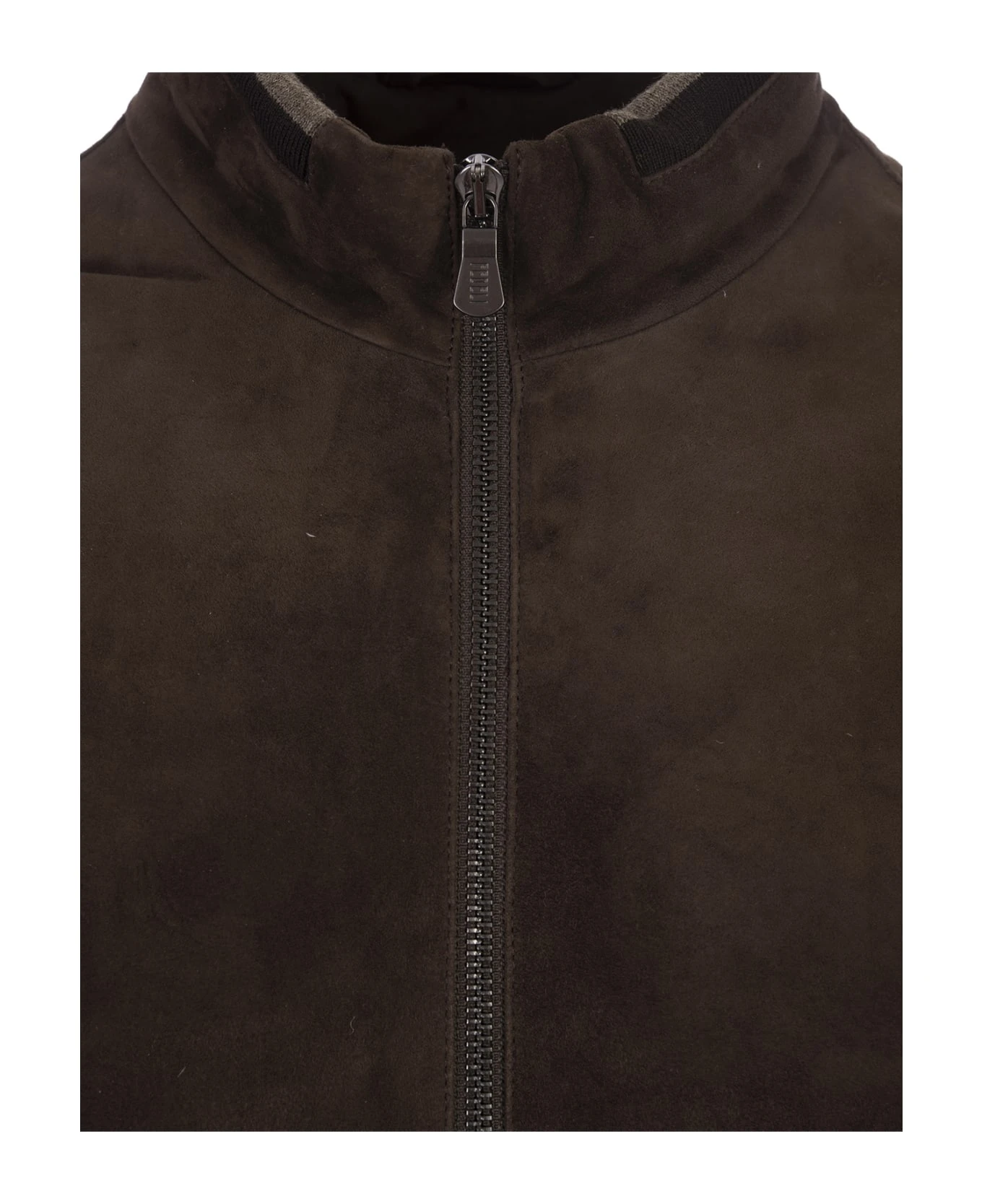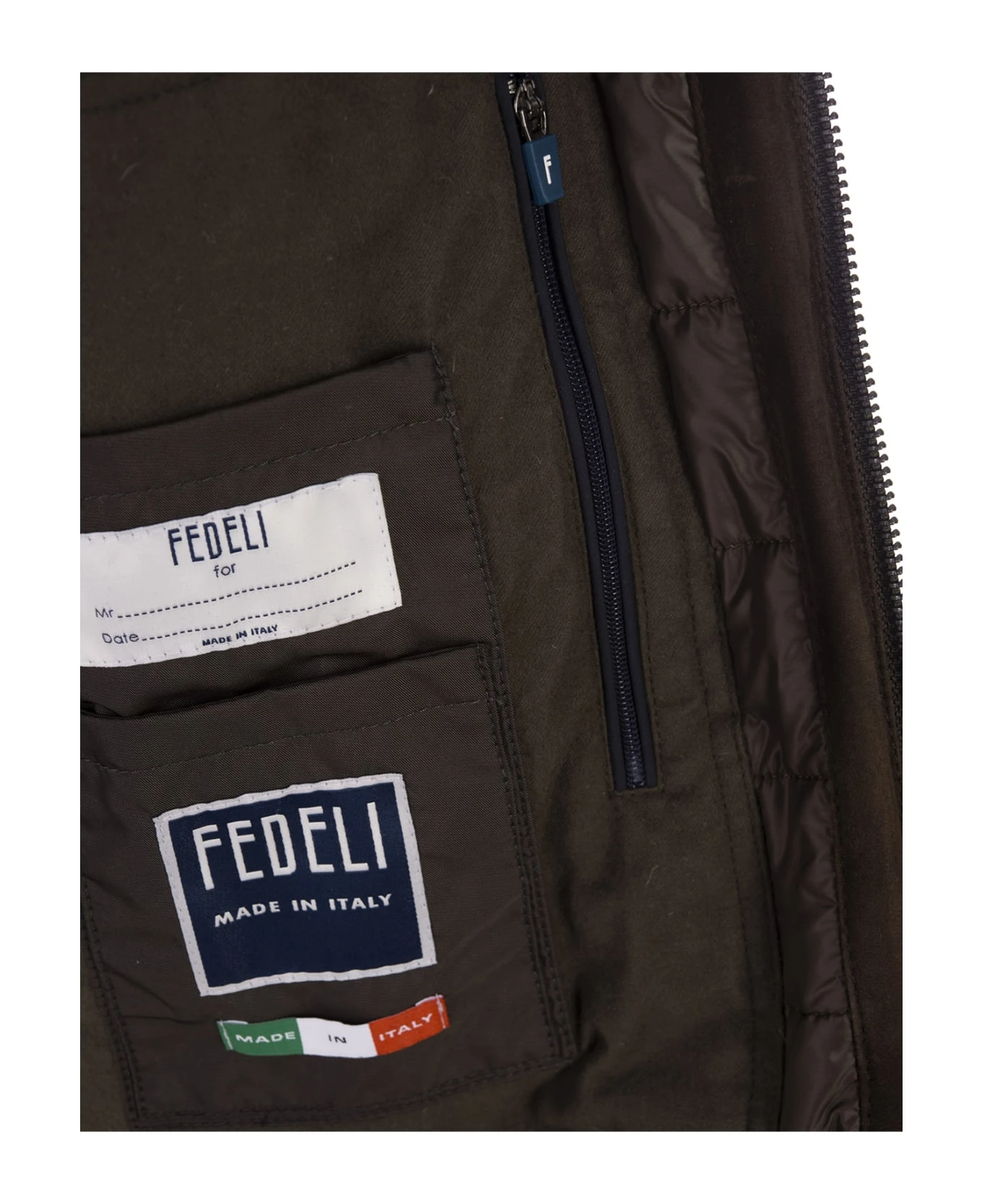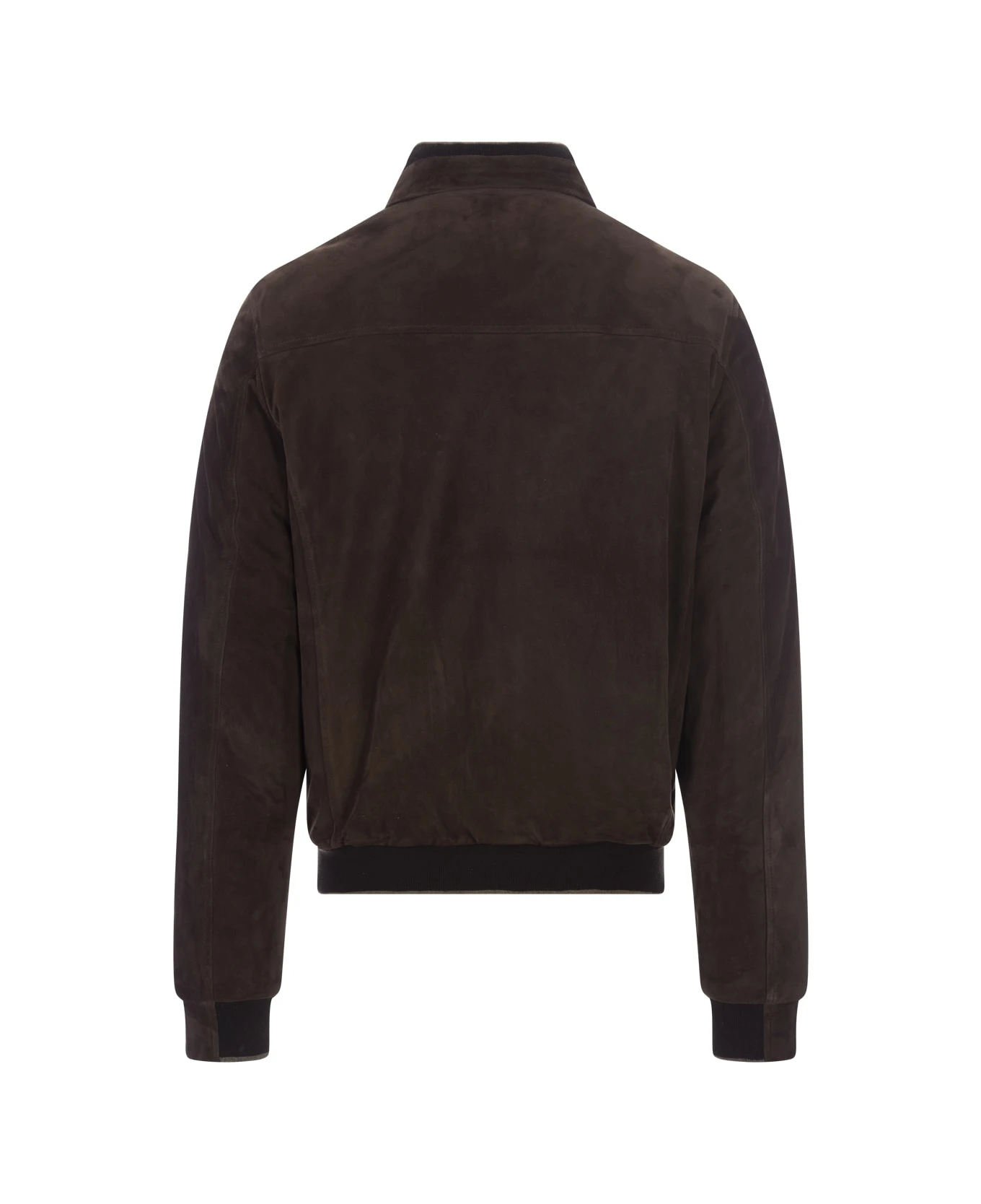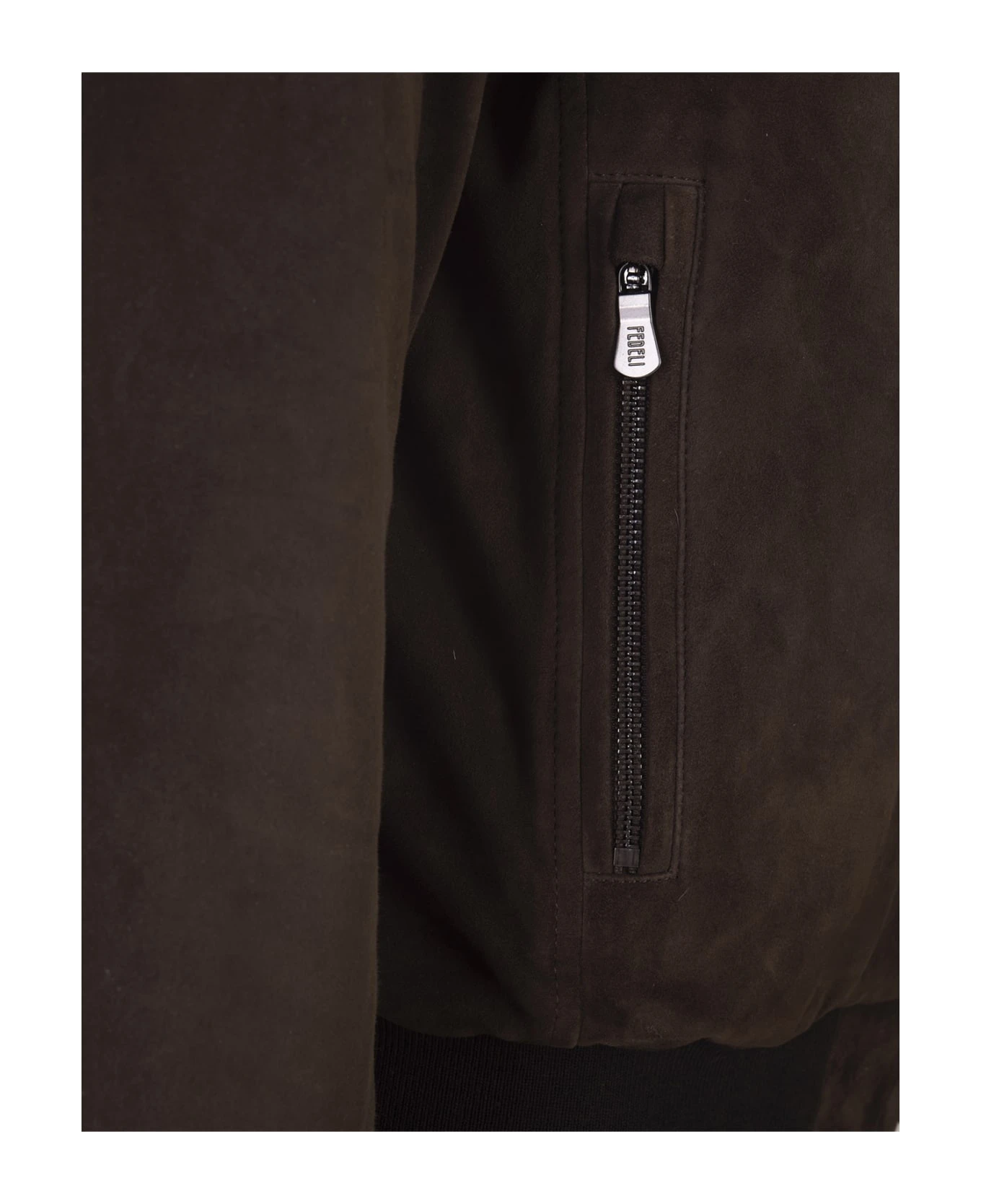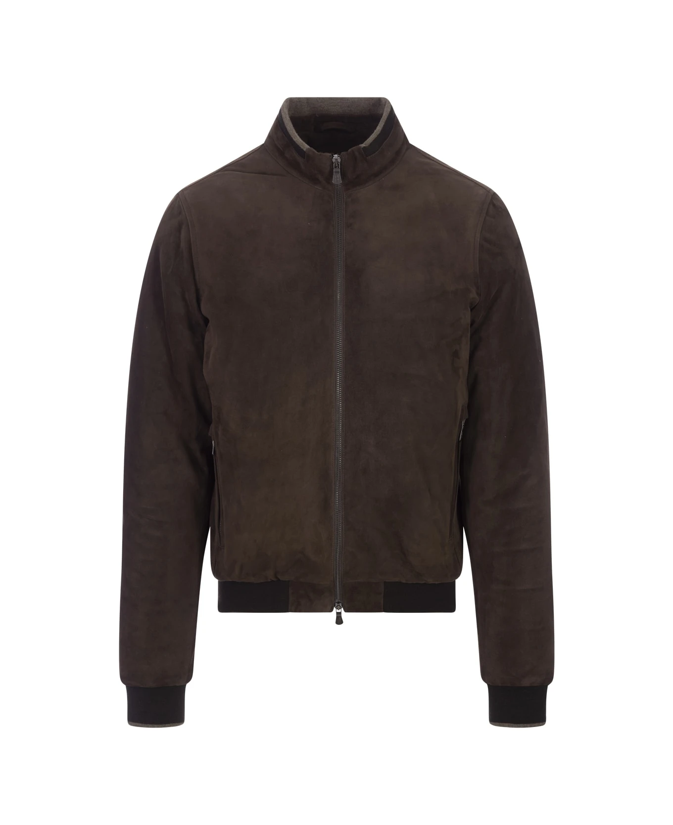 Fedeli bomber jacket for men made of soft brown suede with tone-on-tone nylon lining. Regular-fit model featuring a high collar with ribbed insert, ribbed knit hem and cuffs, zipped side pockets, inside pockets with logo labels, and a practical front fastening with a two-way zip.