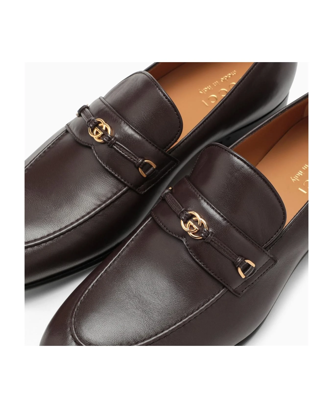 Loafers by Gucci in cocoa-coloured leather, featuring GG Crossing detail with a gold finish on the front and a leather sole.