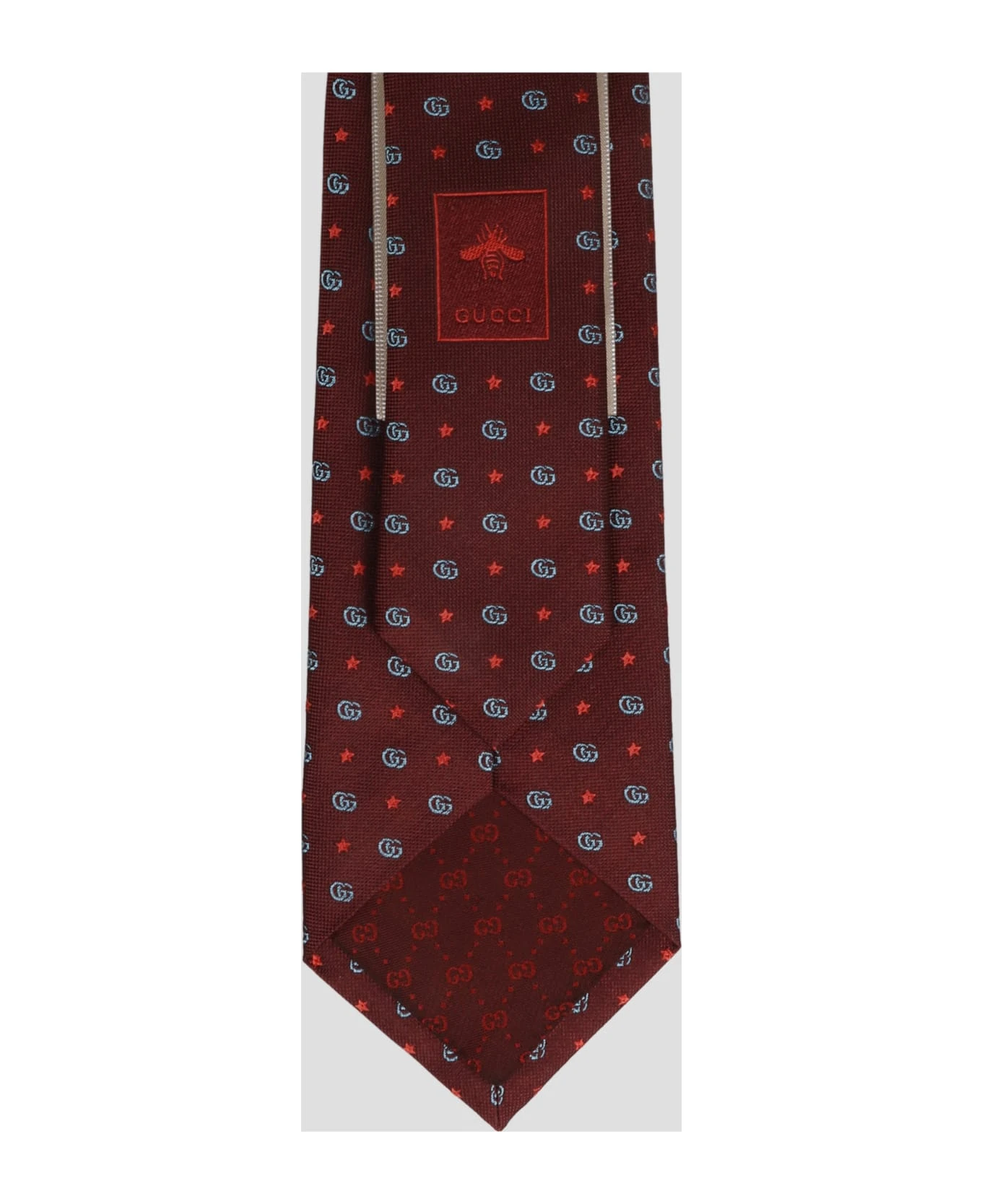 Silk tie by Gucci, with jacquard Double G and Stars motif. – Red Gucci bee label on the back