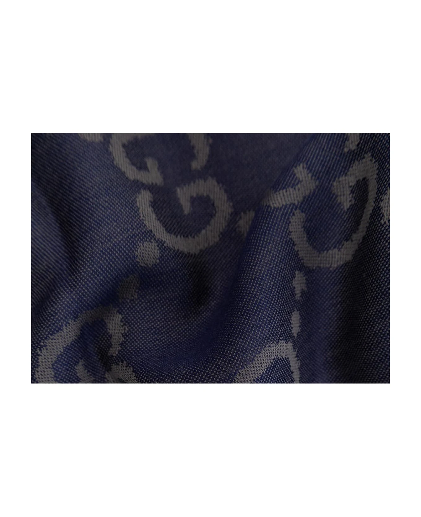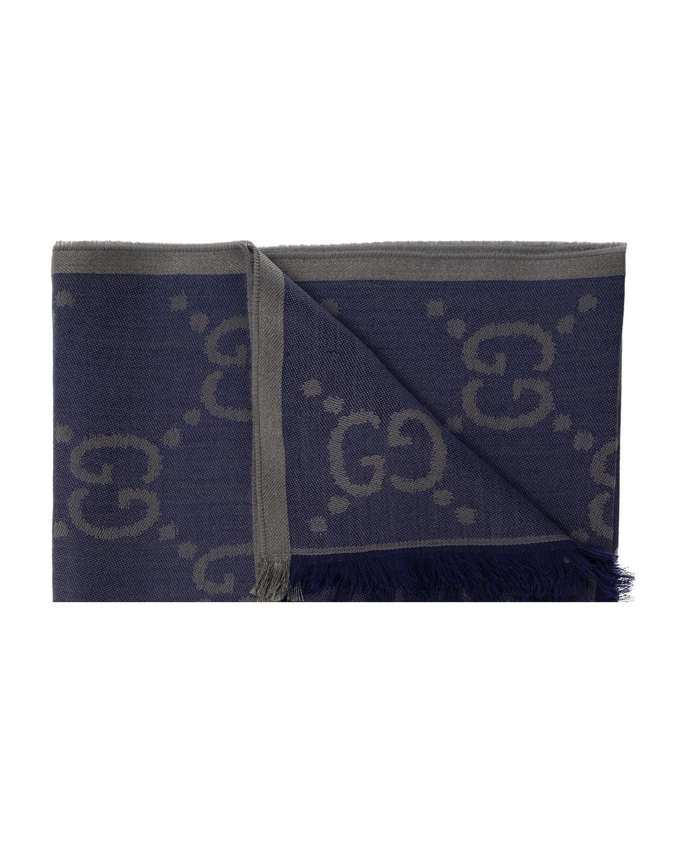 Navy blue and grey scarf from Gucci. Crafted from a wool and silk blend, this item showcases the ‘GG’ pattern and frayed edges.