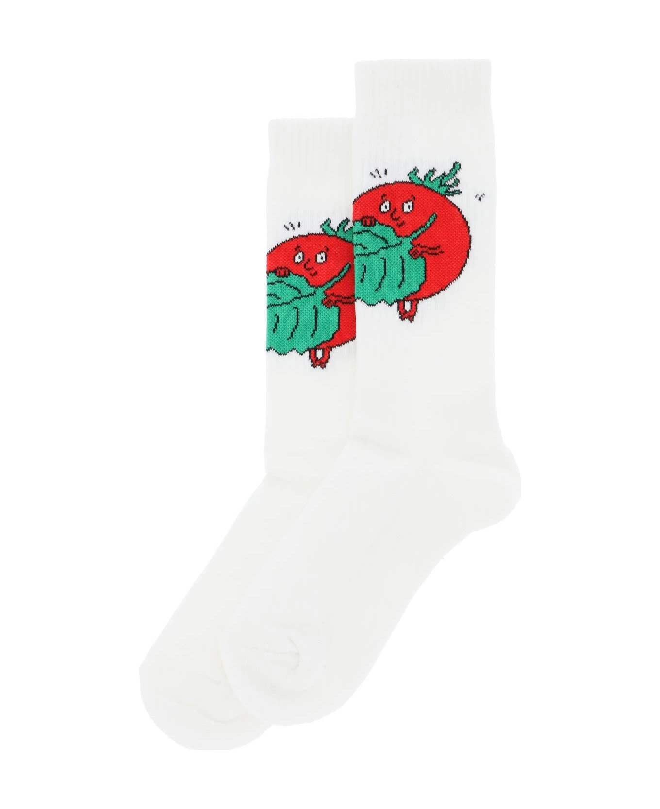 Unisex crew-length socks in stretch organic cotton-blend jersey, showcasing Sky High Farm’s “Happy Tomatoes” intarsia motif on the ribbed leg. Cushioned heel and sole for added comfort.