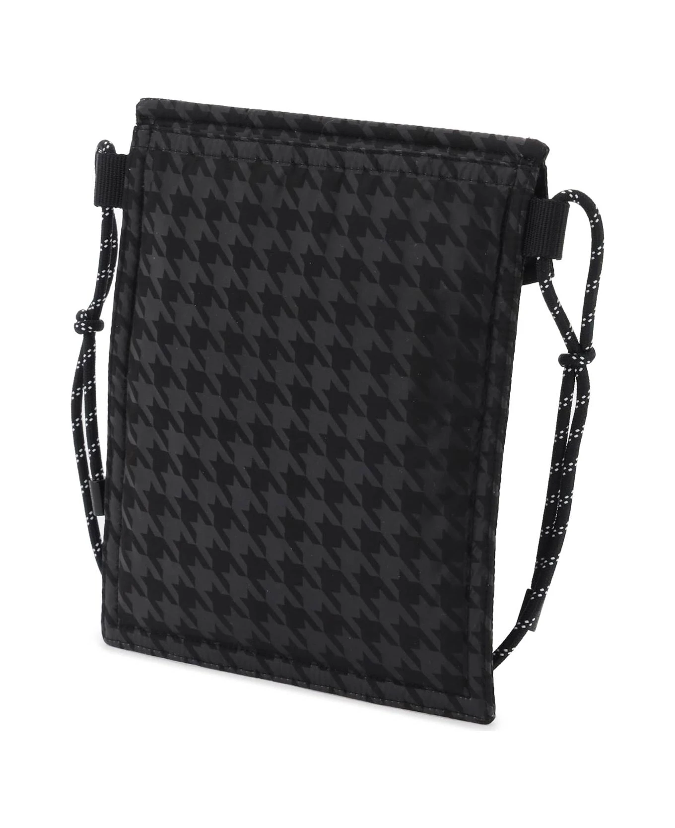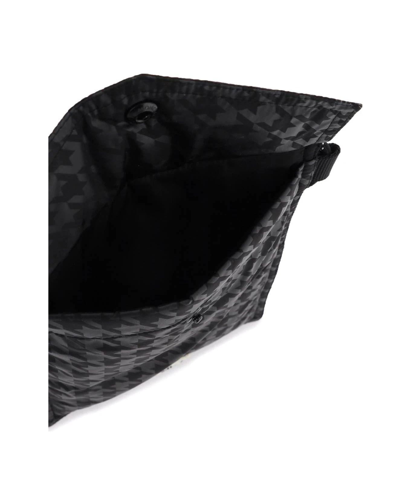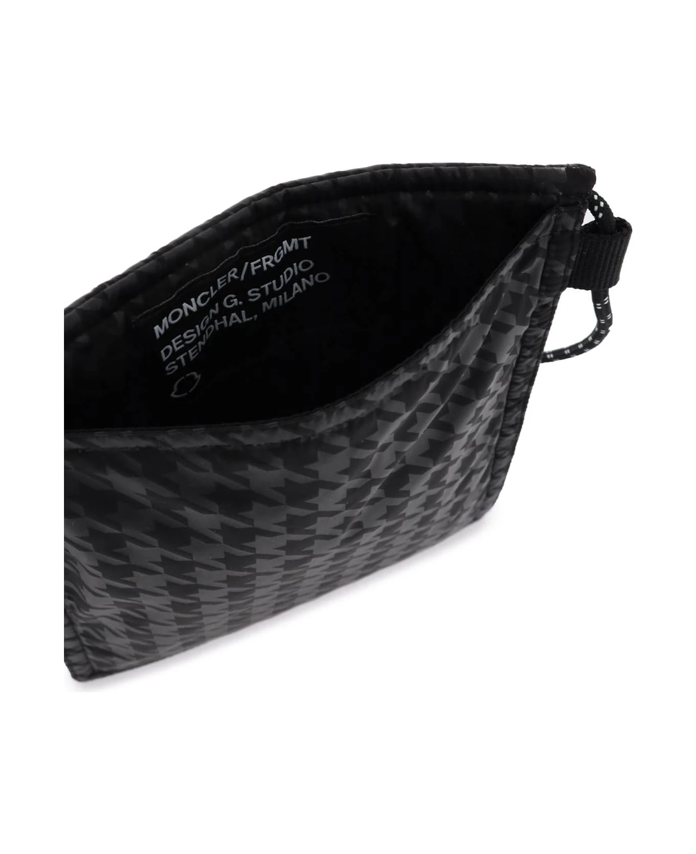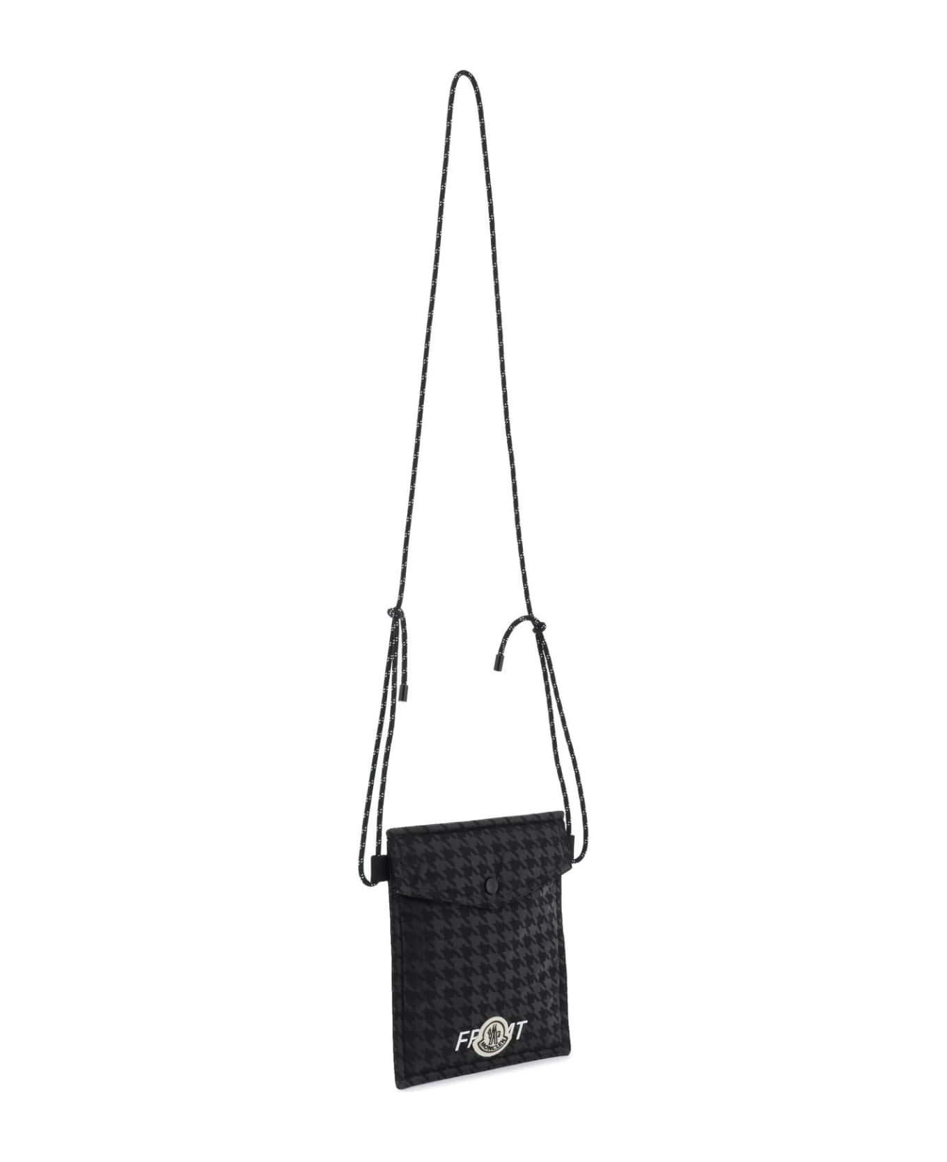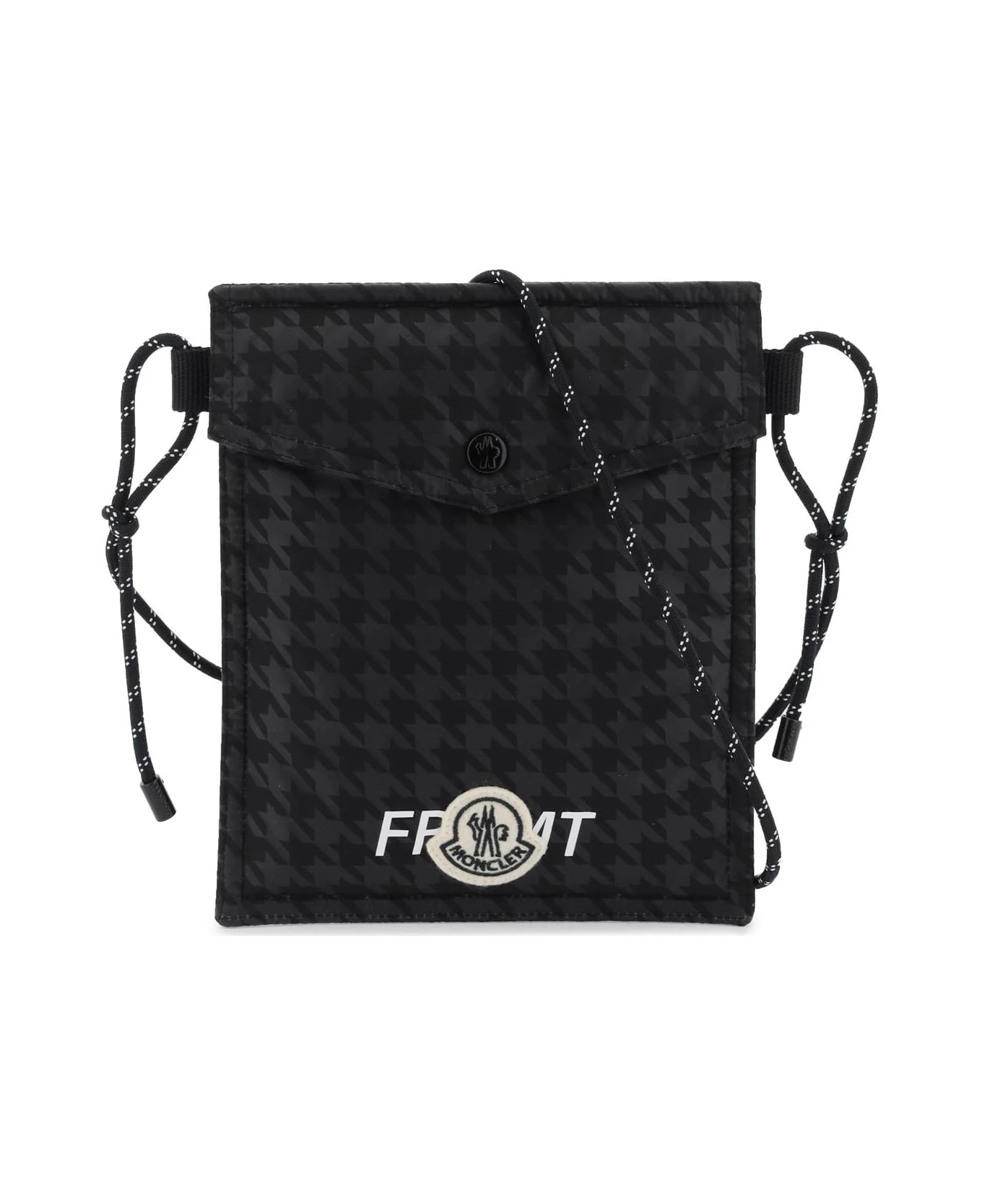 Moncler FRGMT Hiroshi Fujiwara 7 shoulder bag crafted of padded nylon with houndstooth print, snap button closure, rear slit pocket and adjustable trekking-style shoulder strap. Lettering logo and logo patch of both brands on the front.