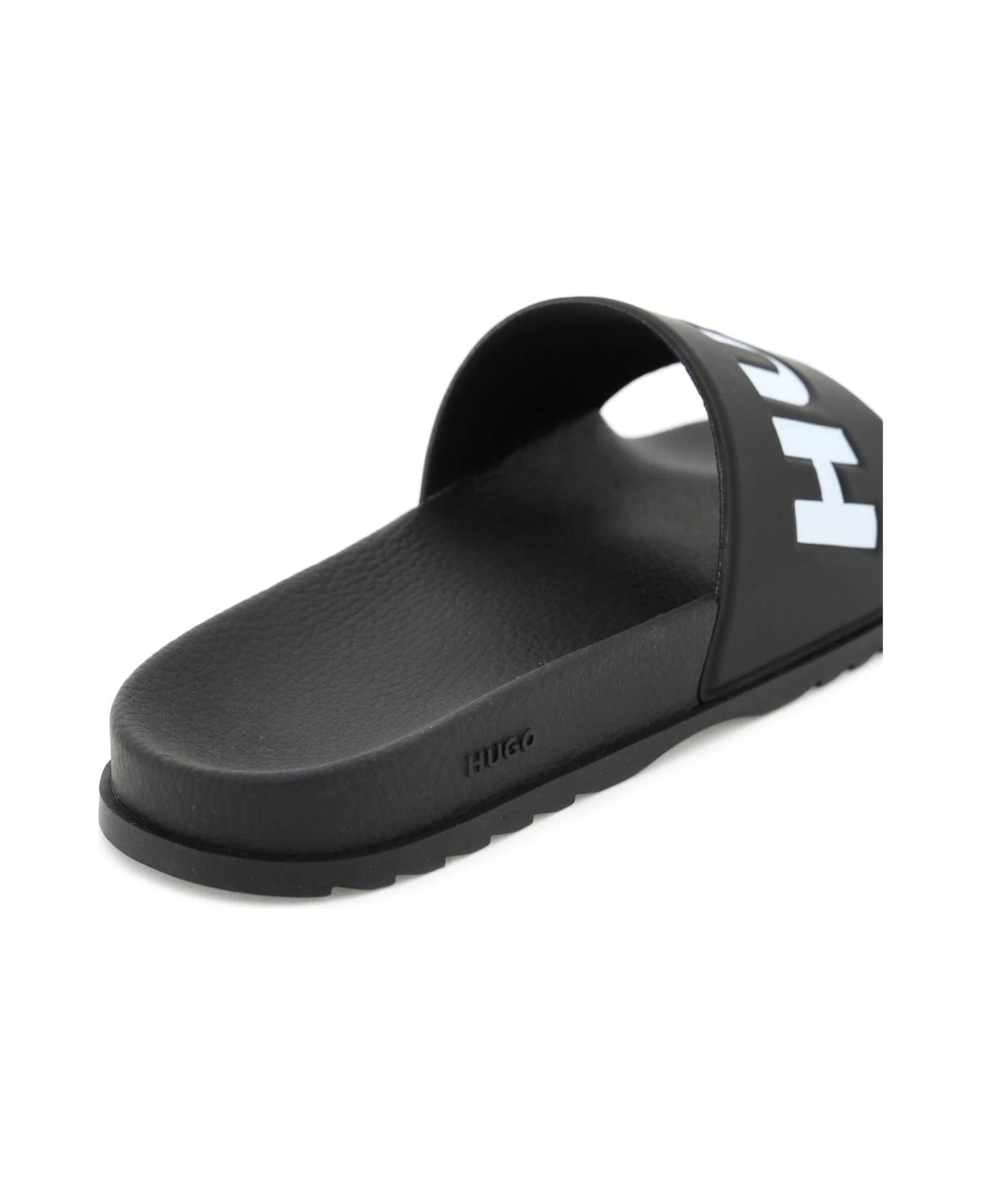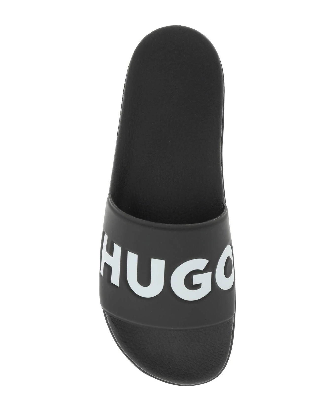 HUGO rubber slides characterized by embossed contrasting logo on the rubber band featuring fabric lining. Anatomical footbed, branded rubber sole, embossed lettering logo detail on the outer side.