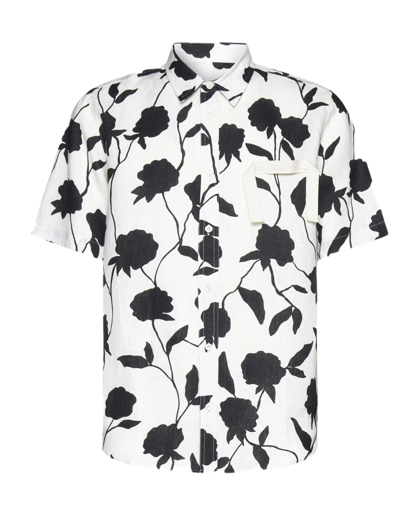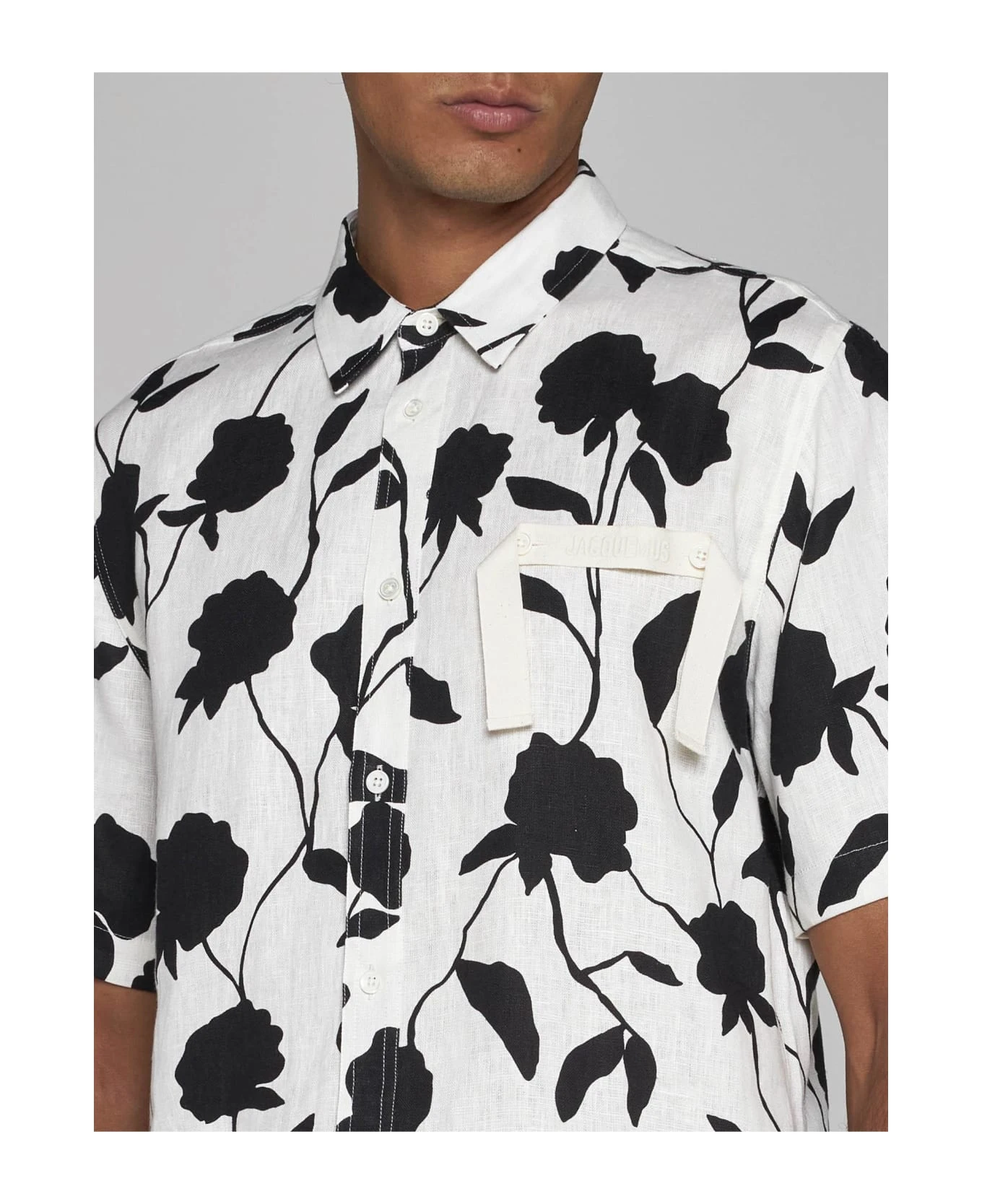 Jacquemus’ Melo linen shirt featuring black roses graphic print on a white background, pointed collar, front buttoning, ribbon on the chest with logo and buttons and rounded hem.