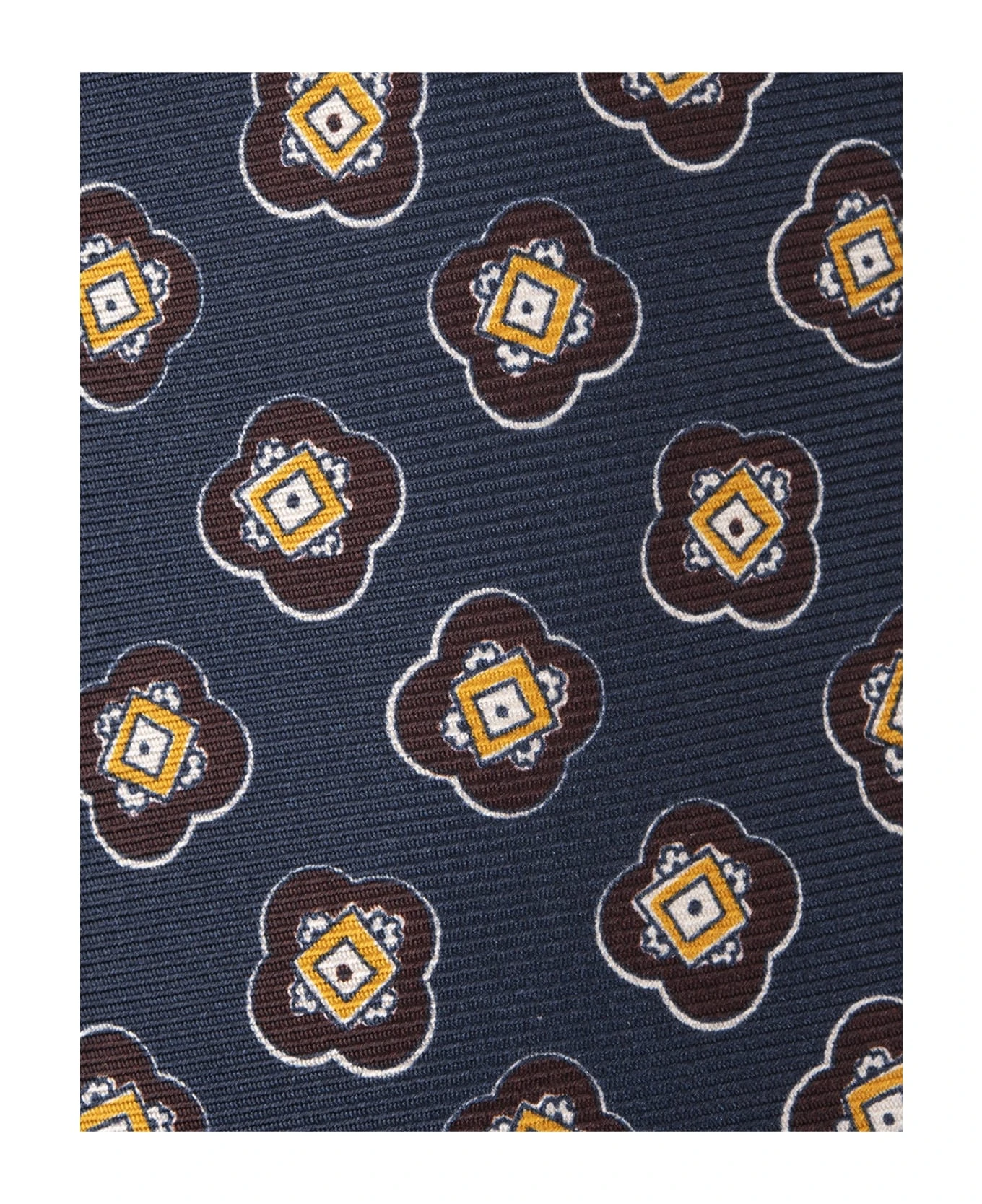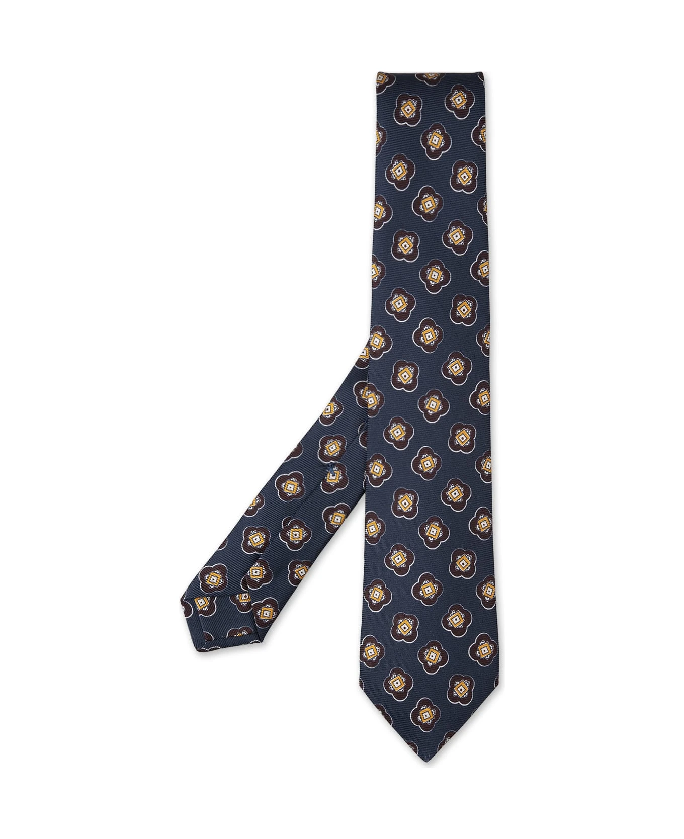 Kiton men’s tie made of fine dark blue silk with all-over multicolored pattern.