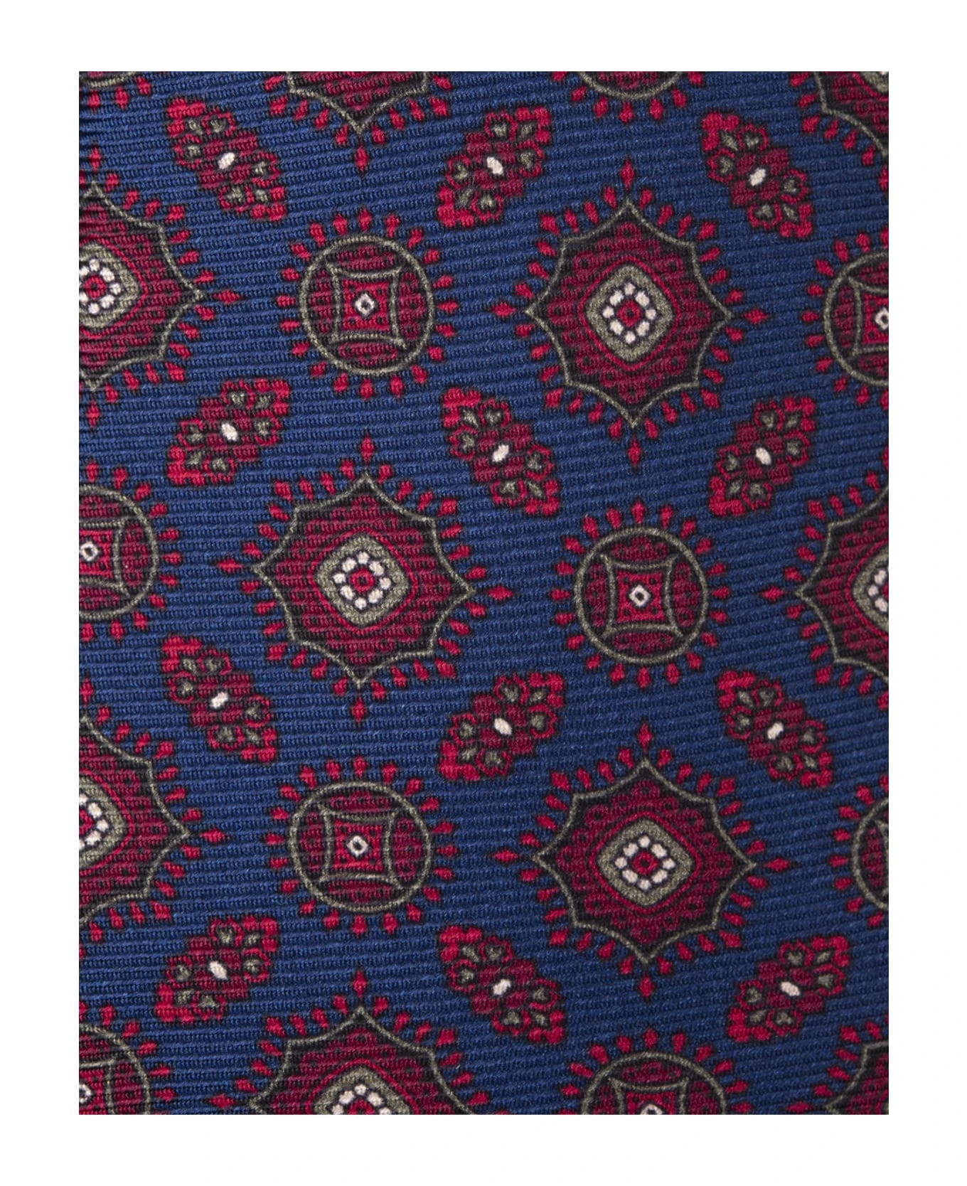 Kiton tie in dark blue silk with all-over red pattern.
