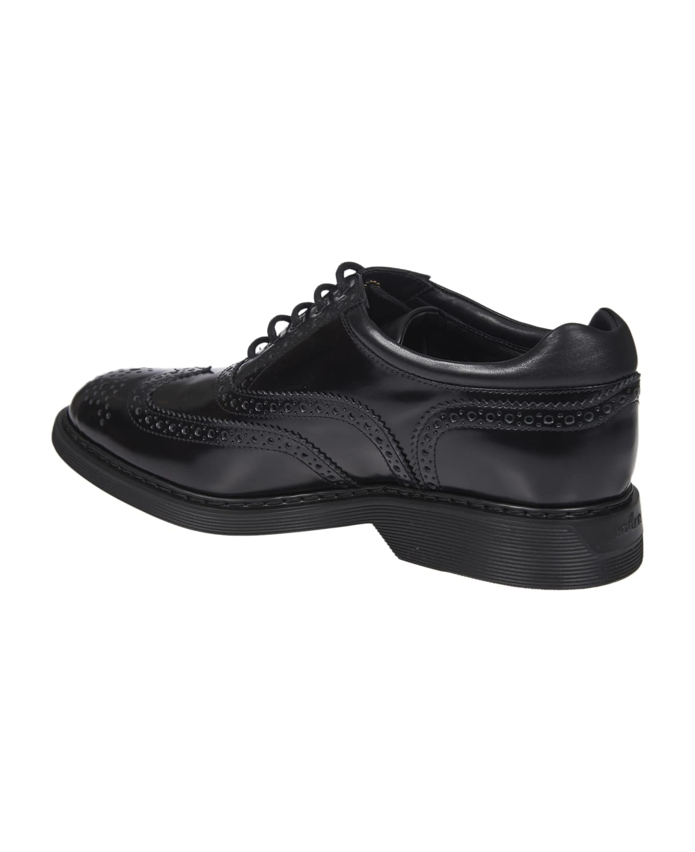 H567 perforated derby, black, English and dovetail perforations, embossed Hogan monogram, gurdolo with stitching, memory foam footbed, rubber sole. Composition: 100% leather. Made in Italy.