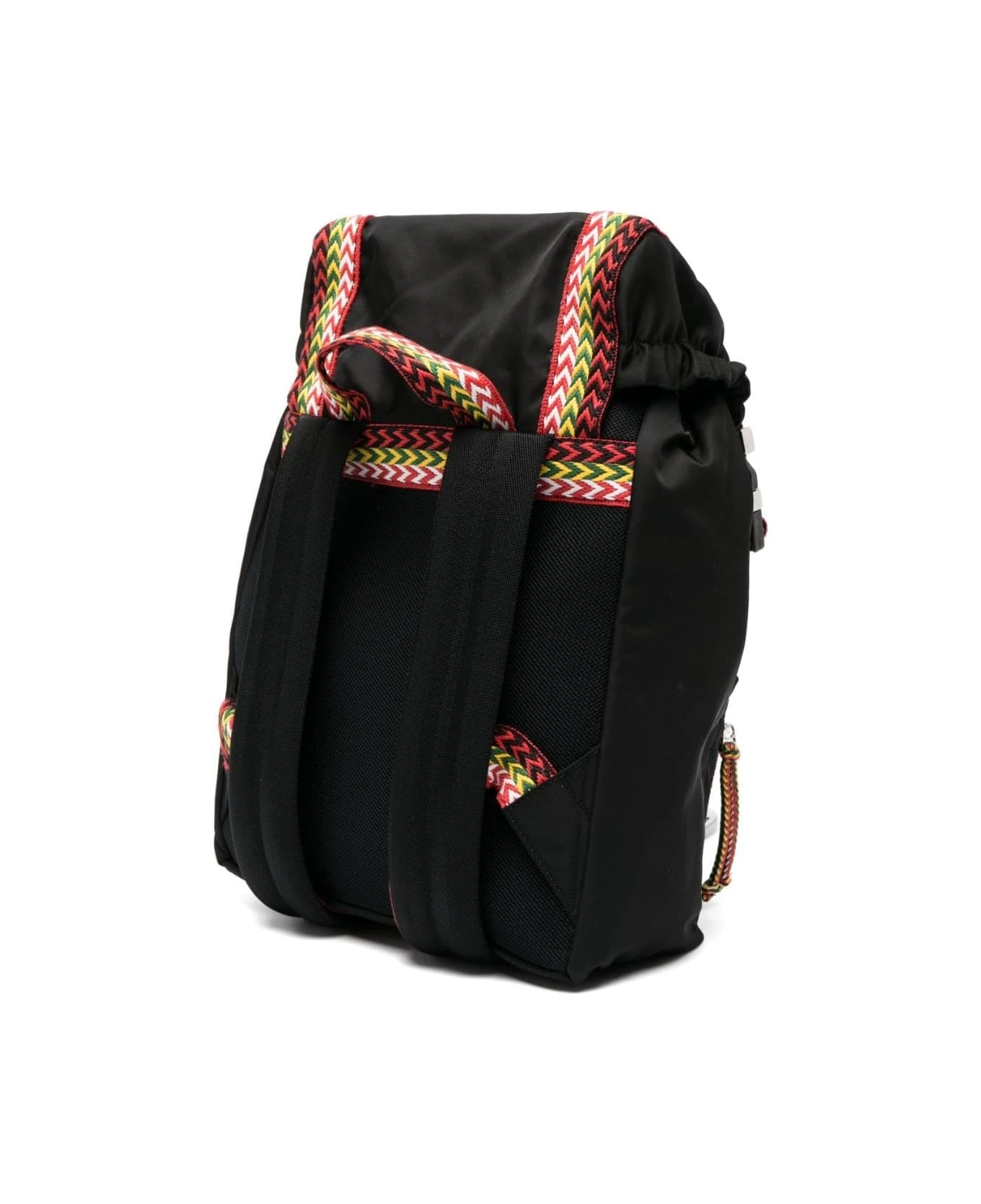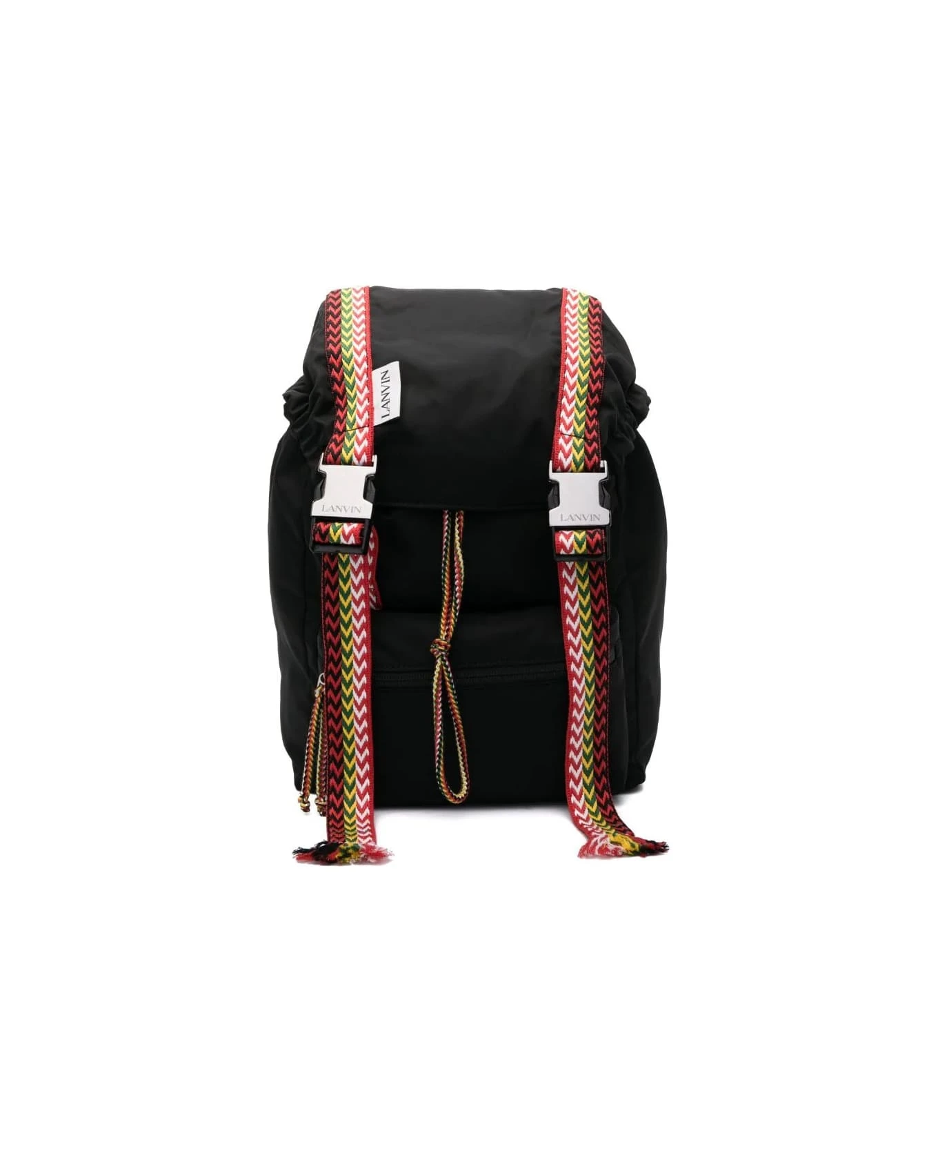 Lanvin backpack made of black nylon with flap, adjustable shoulder straps, elasticated flap at the sides, white logo label, single main compartment, drawstring and buckle clip fastening, one front zipped patch pocket and ribbons with iconic multi-coloured Curb chevron pattern.