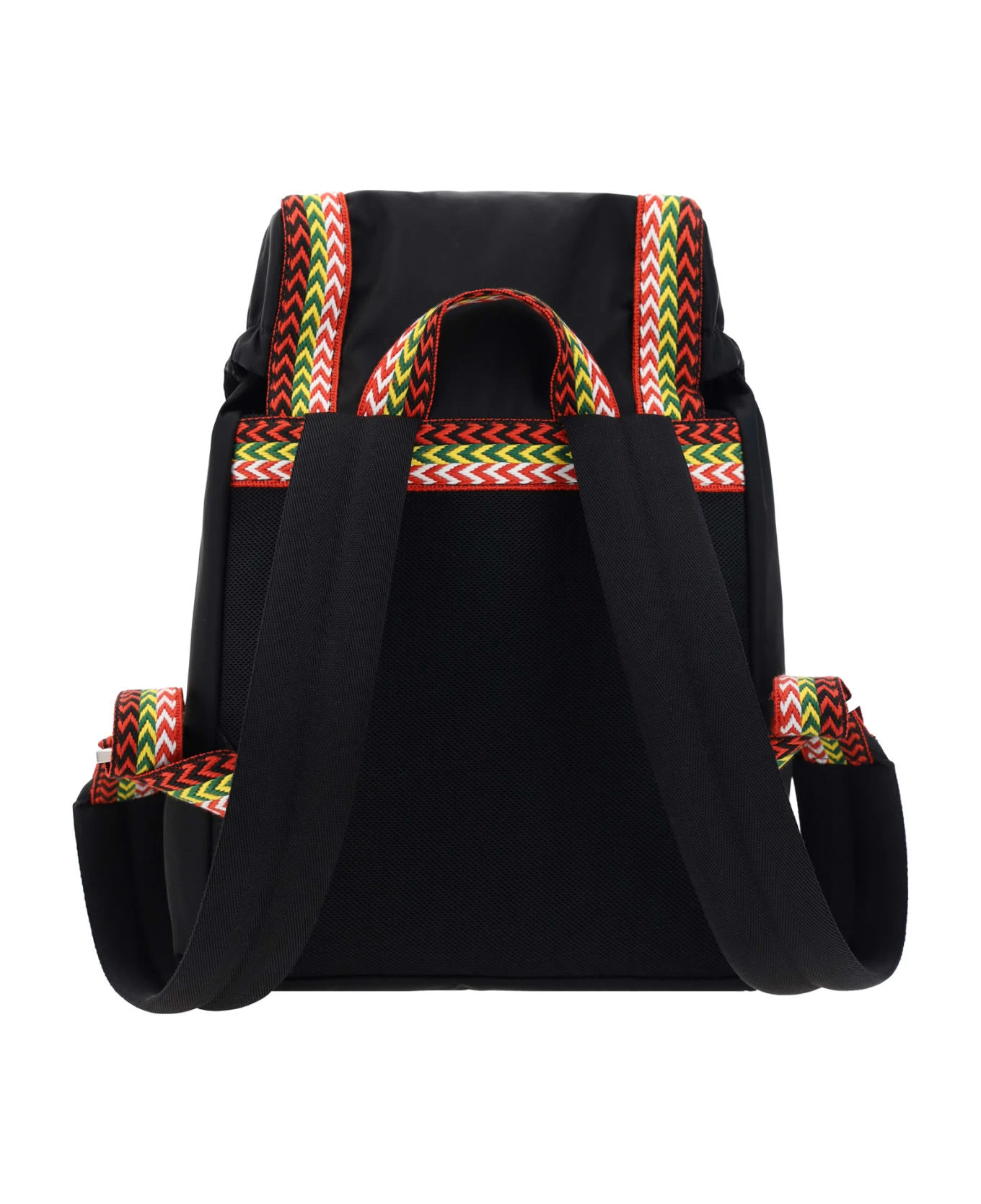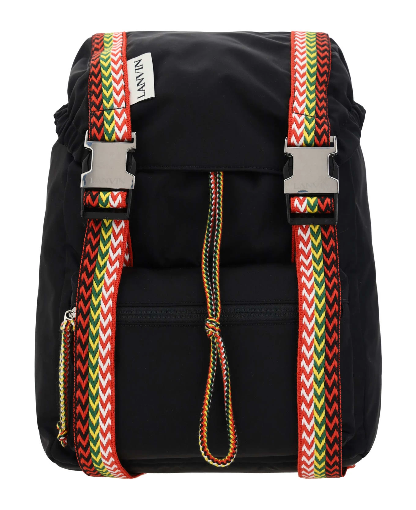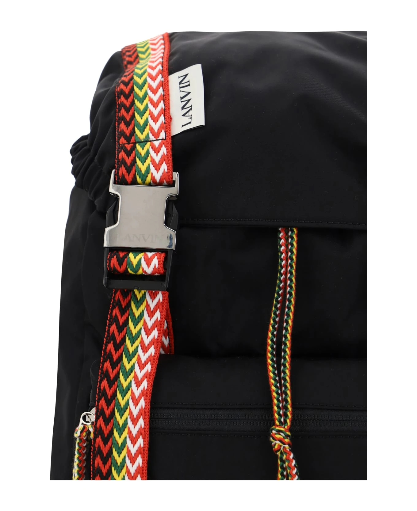 Nano curb backpack by lanvin, back handle, adjustable shoulder straps, interior drawstring closure, front closure by flap and double clips, contrasting iconic monogram band patch on front, slit pocket on front, iconic curb woven and multicolored el brand bands applied on front and back, drawstring and matching slider.