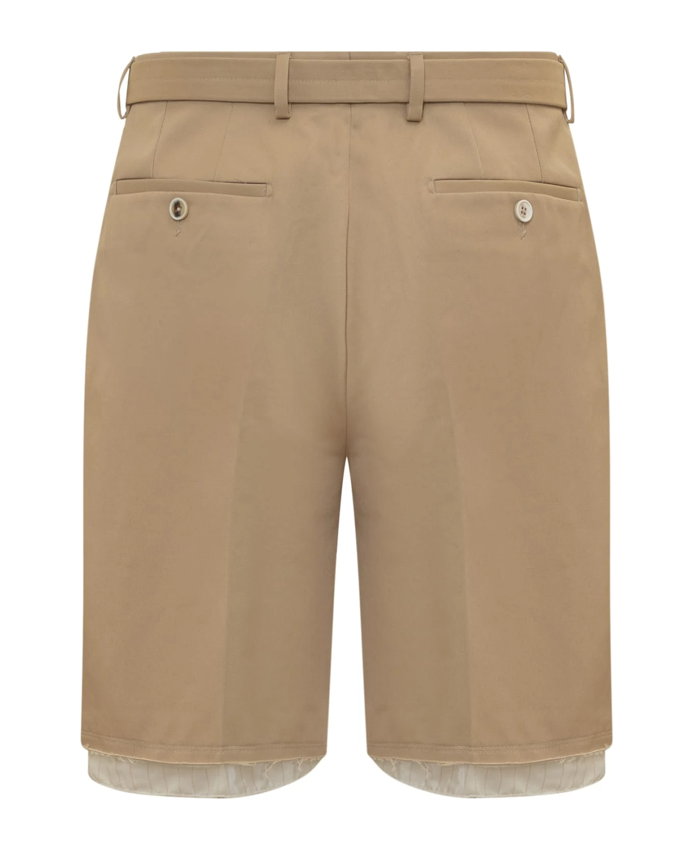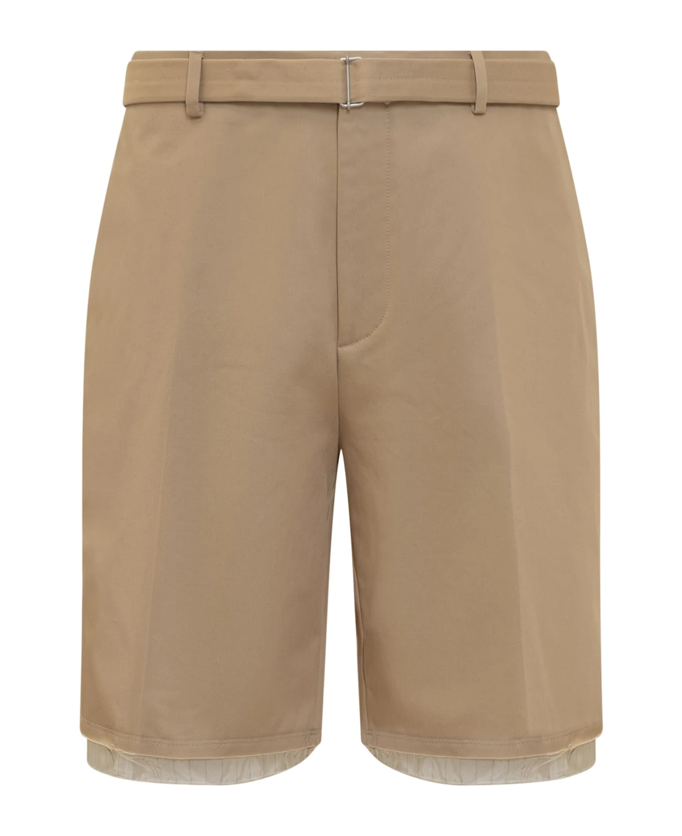 Tailored shorts. Zip and hook closure. Waist belt. Belt loops. Four pockets. Raw cut bottom.