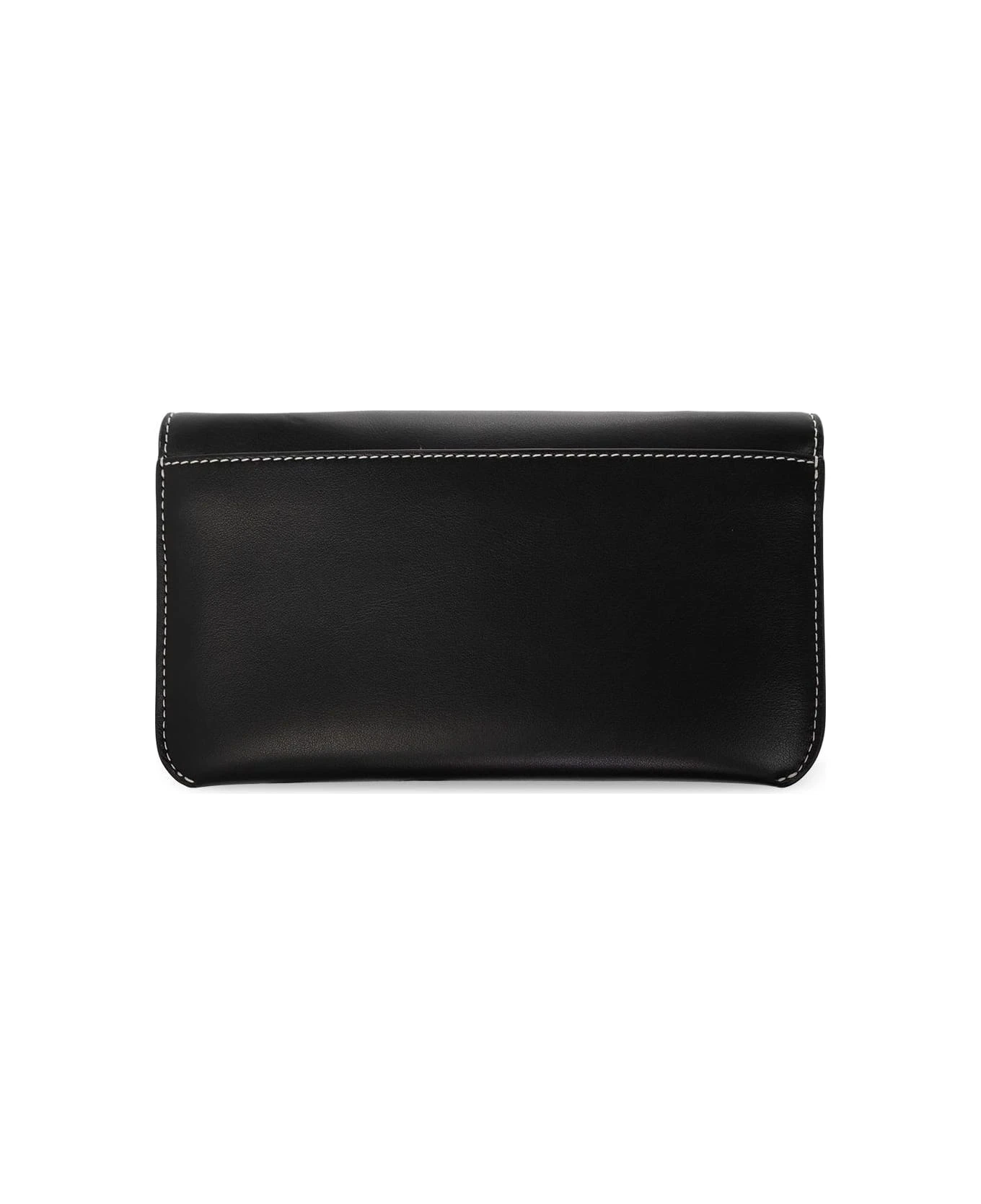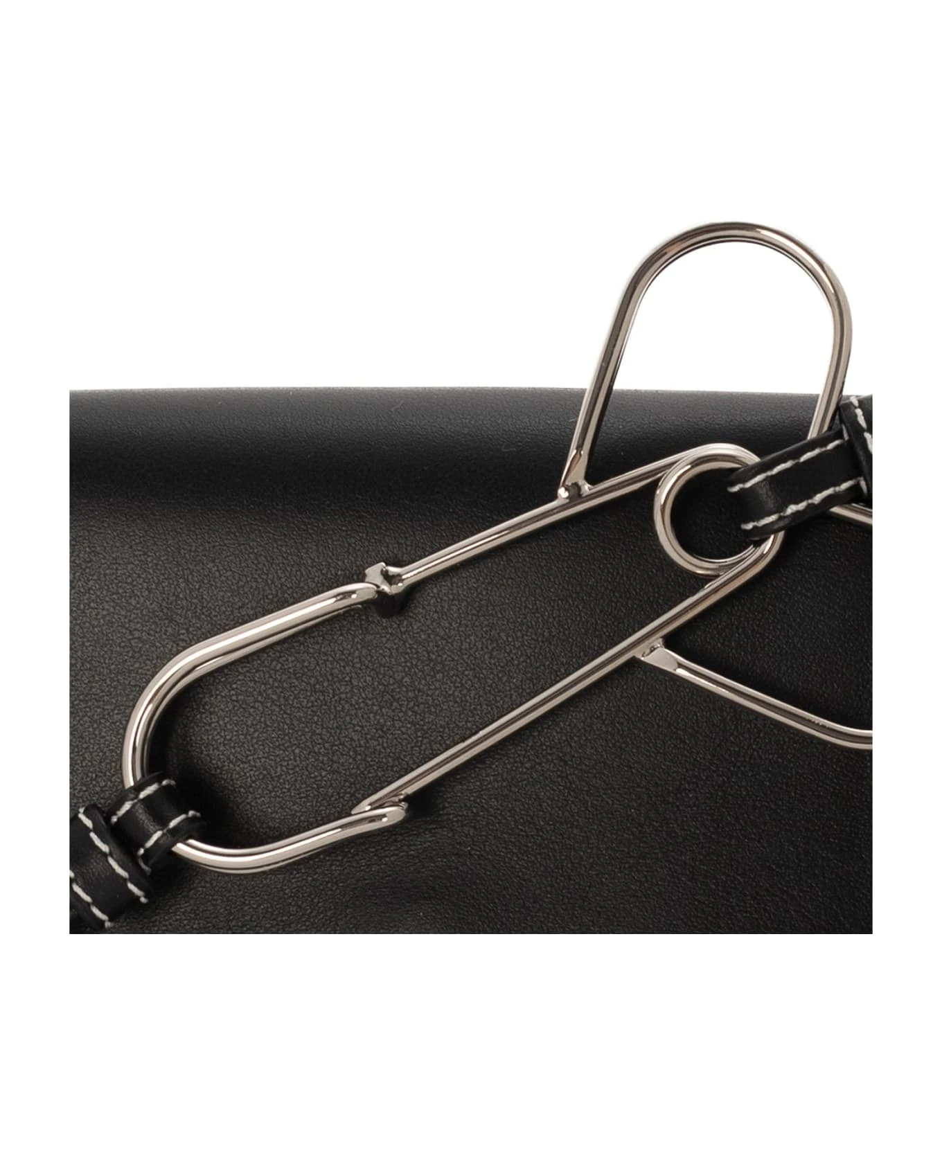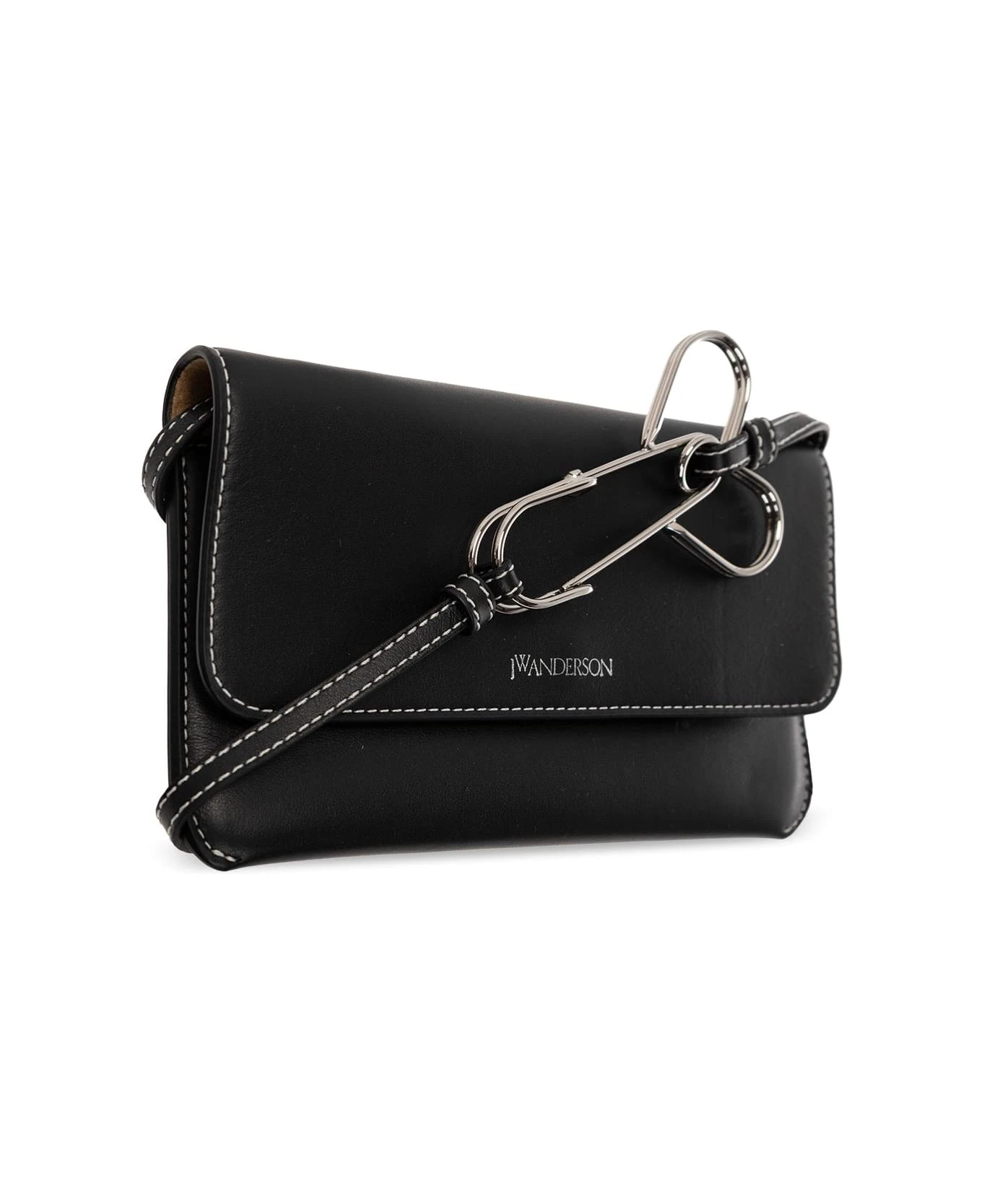 Black phone holder from JW Anderson. Made of calf leather, this design secures with a snap and showcases a printed logo on the front and contrasting white stitching details. It is complete with an adjustable shoulder strap accentuated with a metal applica