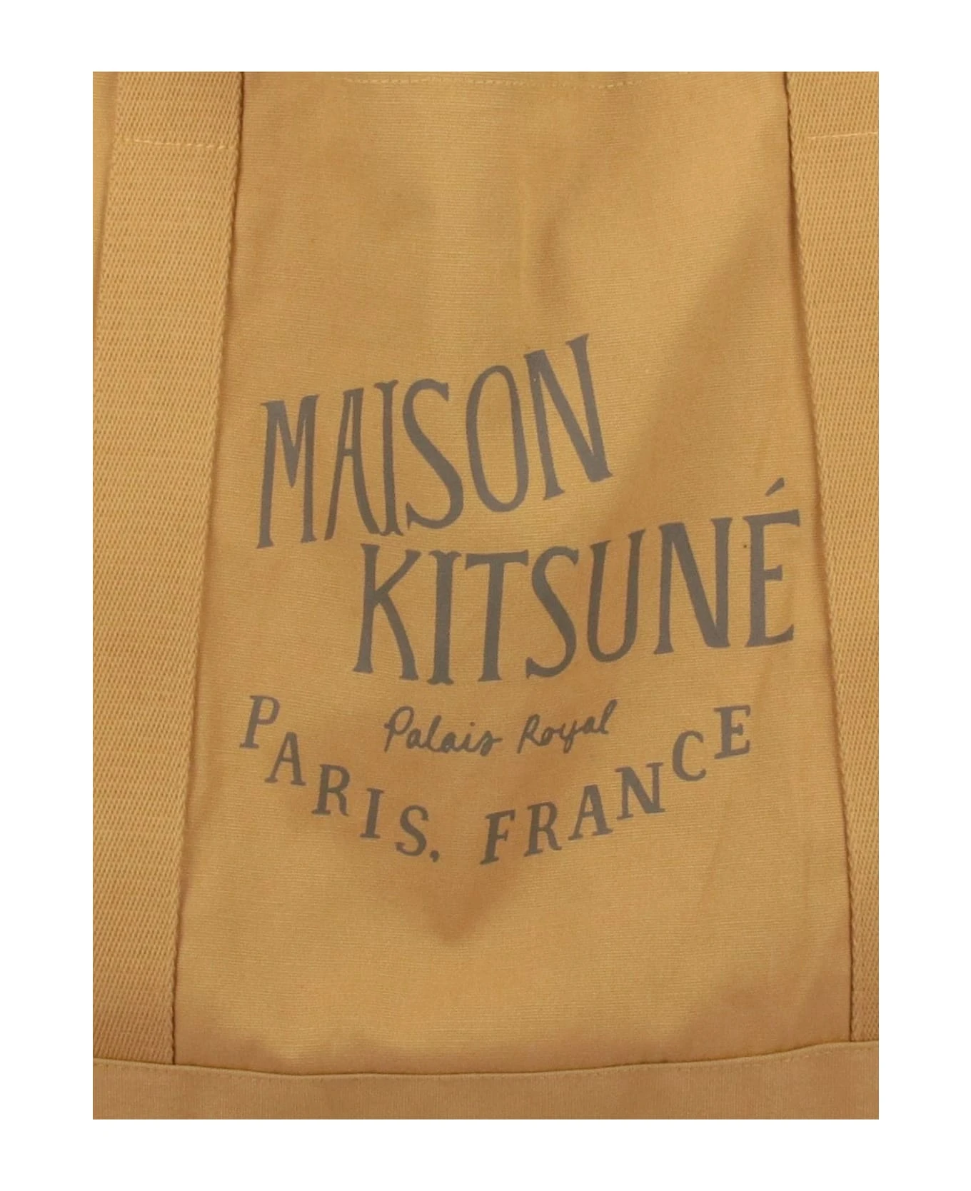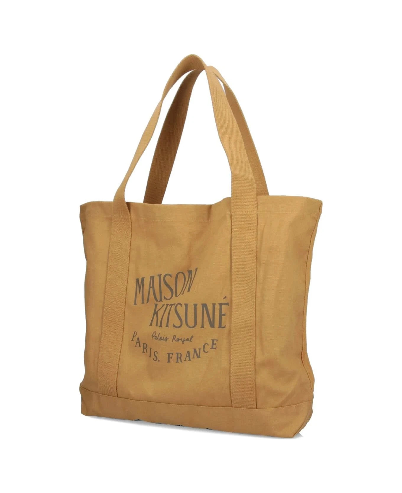 Maison Kitsun alais Royal tote bag in brown canvas, top handles, contrasting logo print on the front, and main inner compartment.