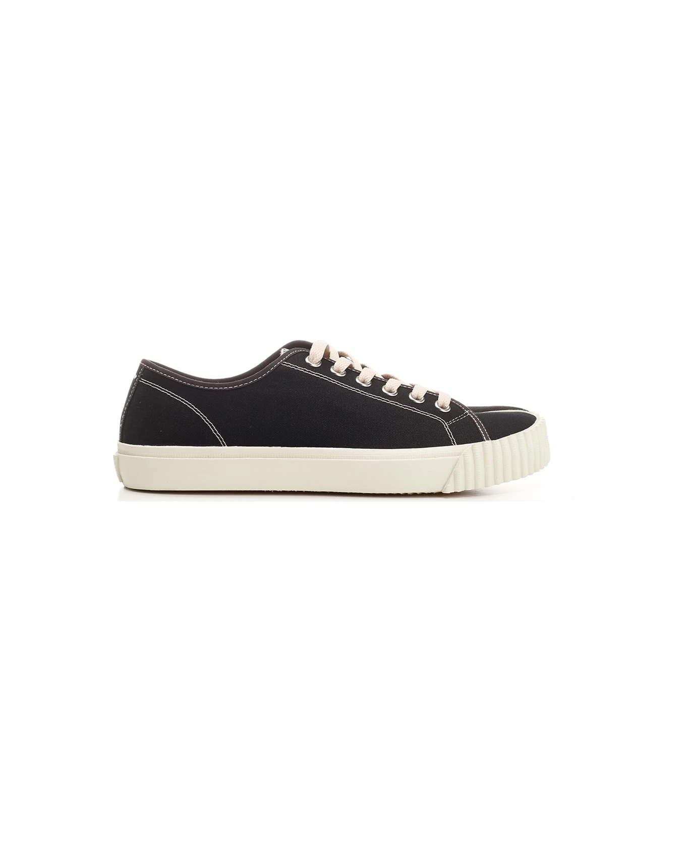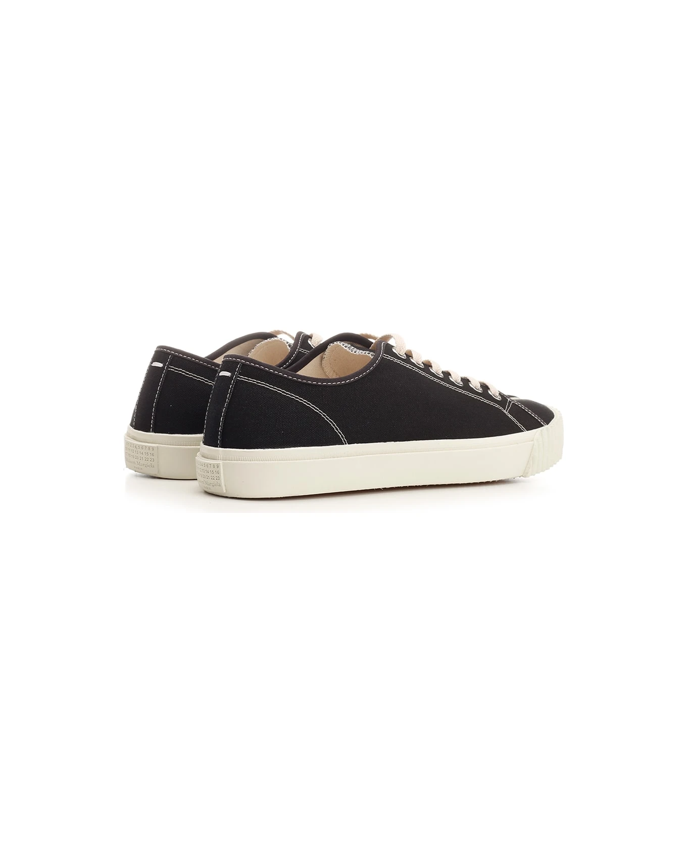 Black “Tabi” cotton canvas sneakers with cut out toe and white rubber sole from Maison Margiela.