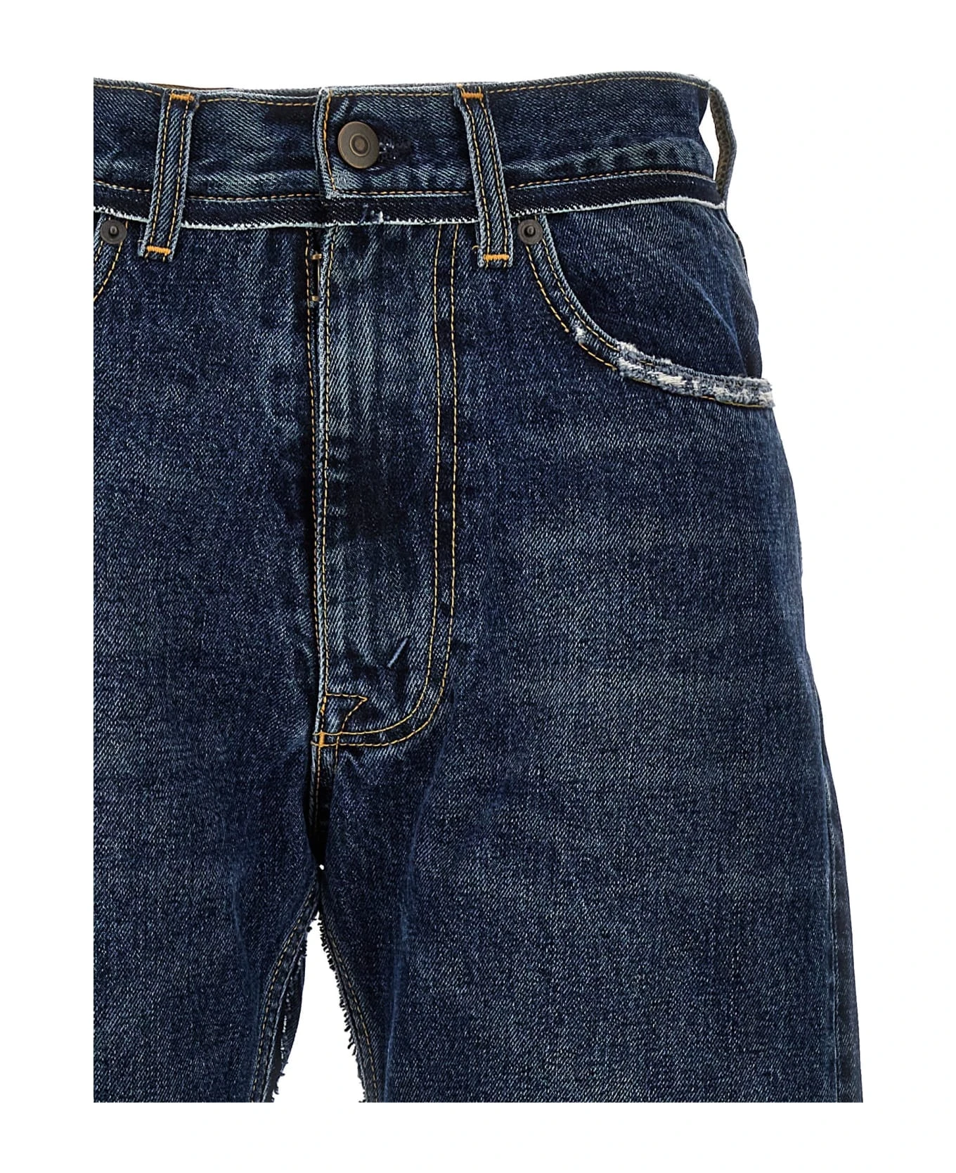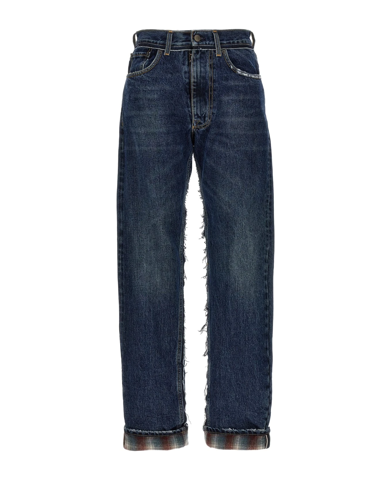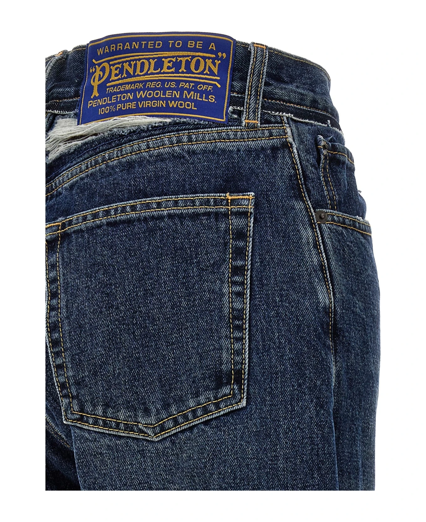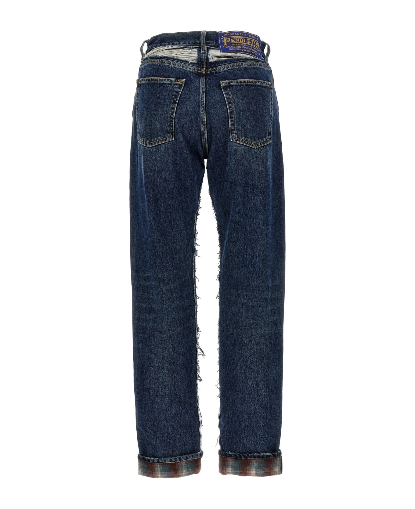 ‘Pendleton’ cotton denim jeans with used-effect details, turned-up hem detail with check wool inserts, a zip hook and button closure, and five pockets.