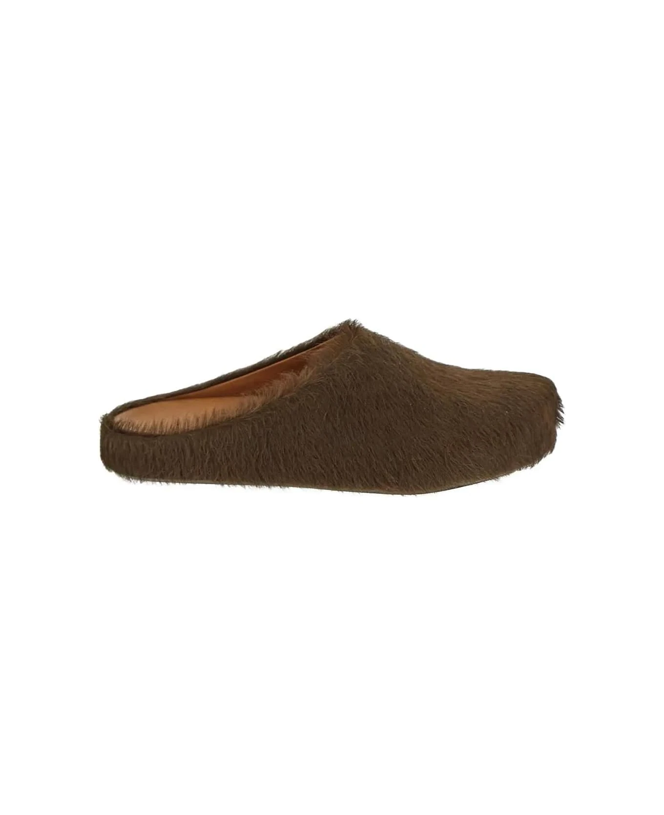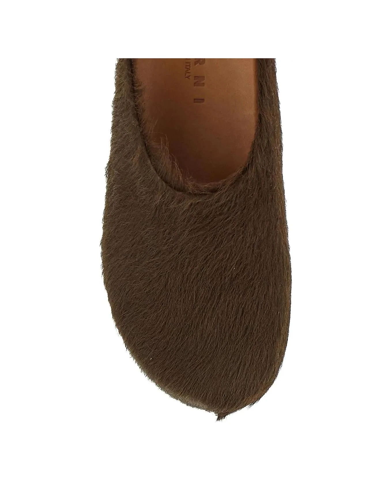 Marni sabot in brown leather covered by brown long calf hair featuring a round toe, rubber outsole and a debossed logo on the insole.