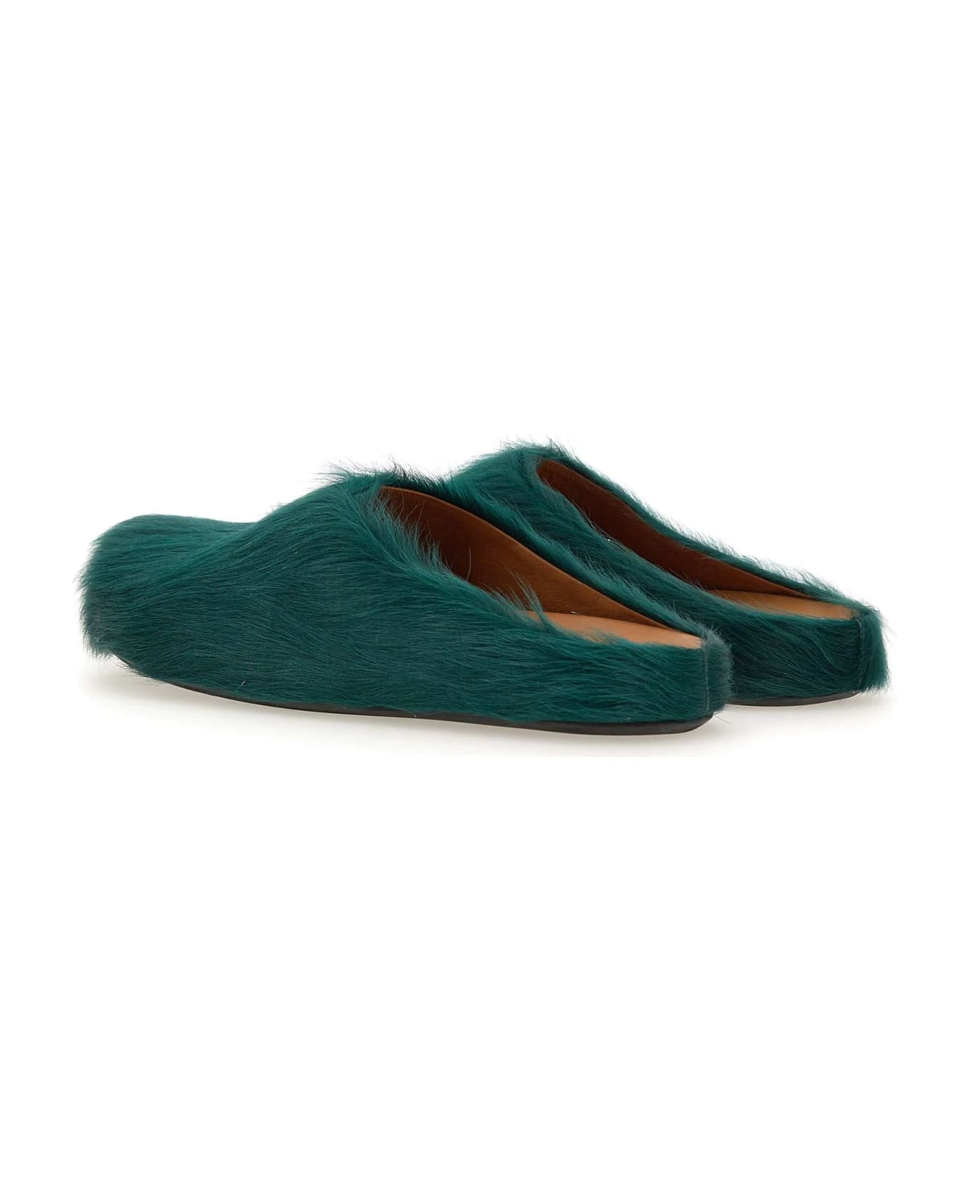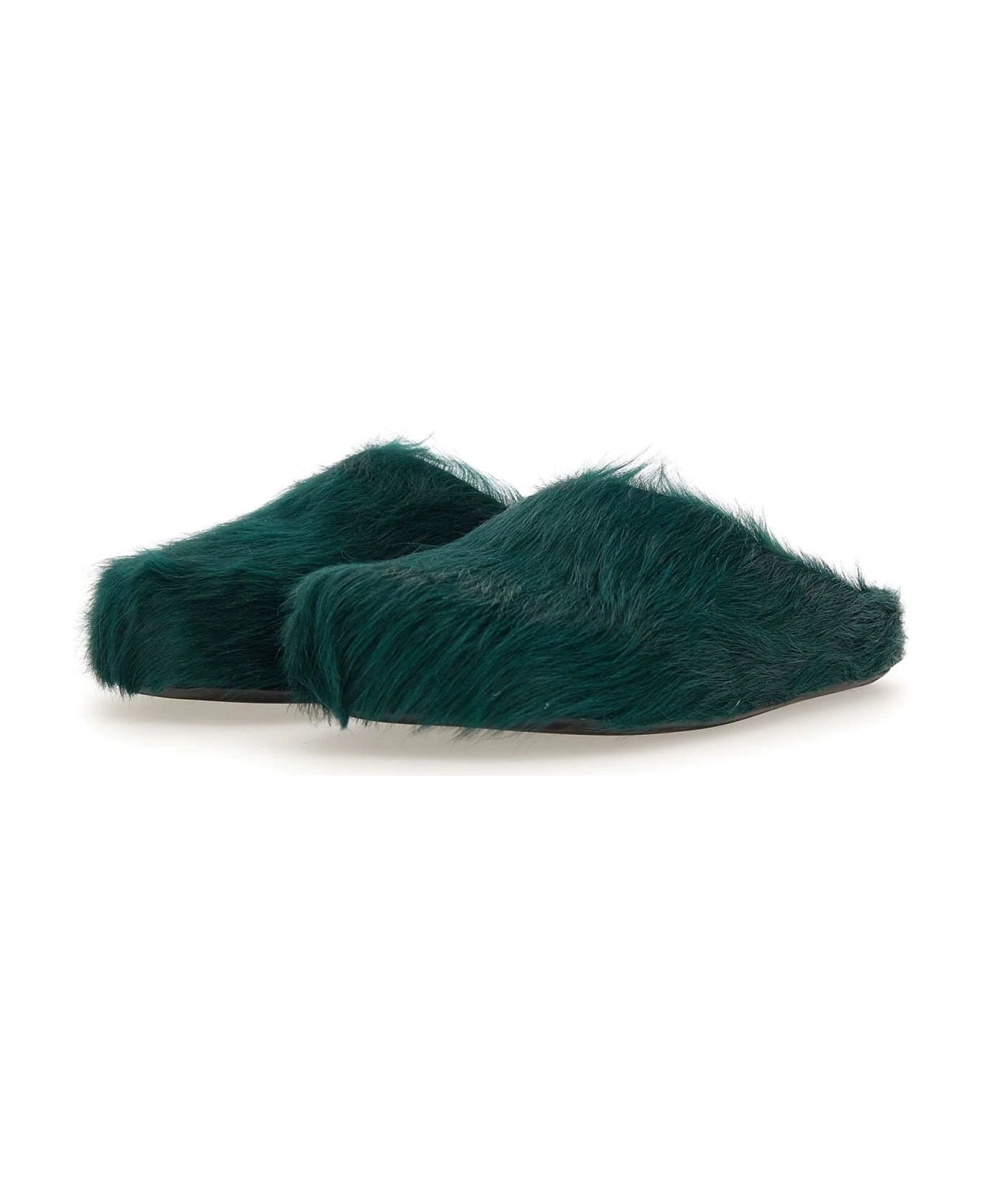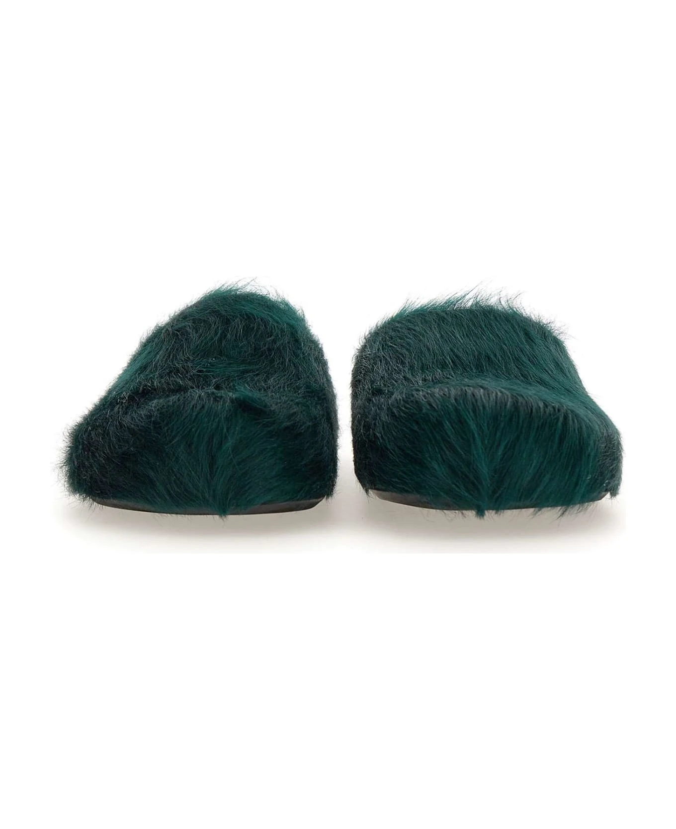 Marni men’s long-haired calfskin sabot, forest green, barefoot design, anatomic leather insole, ribbed rubber sole. Made in Italy.
