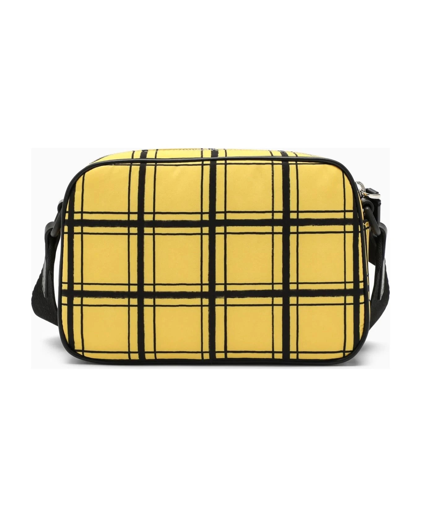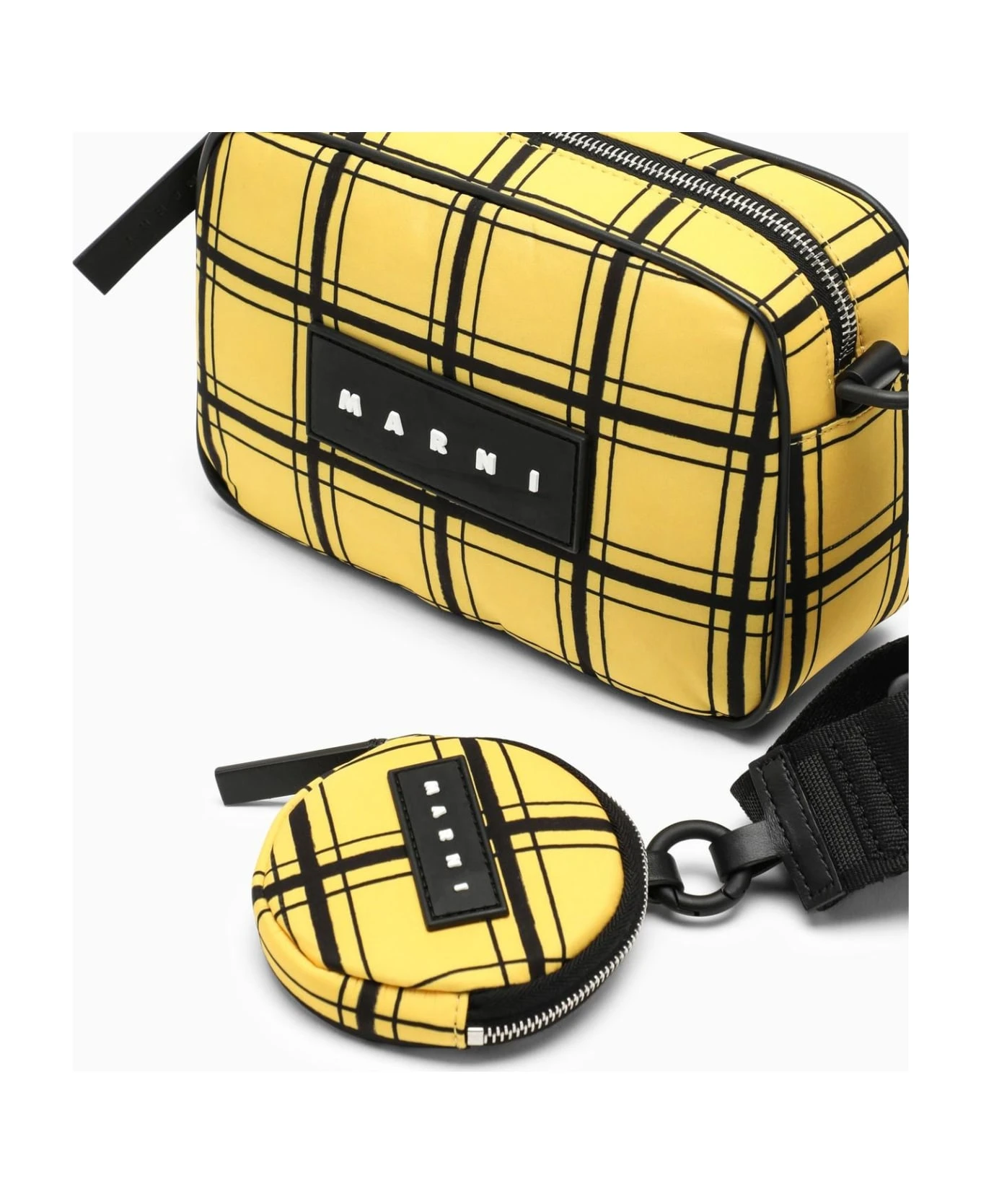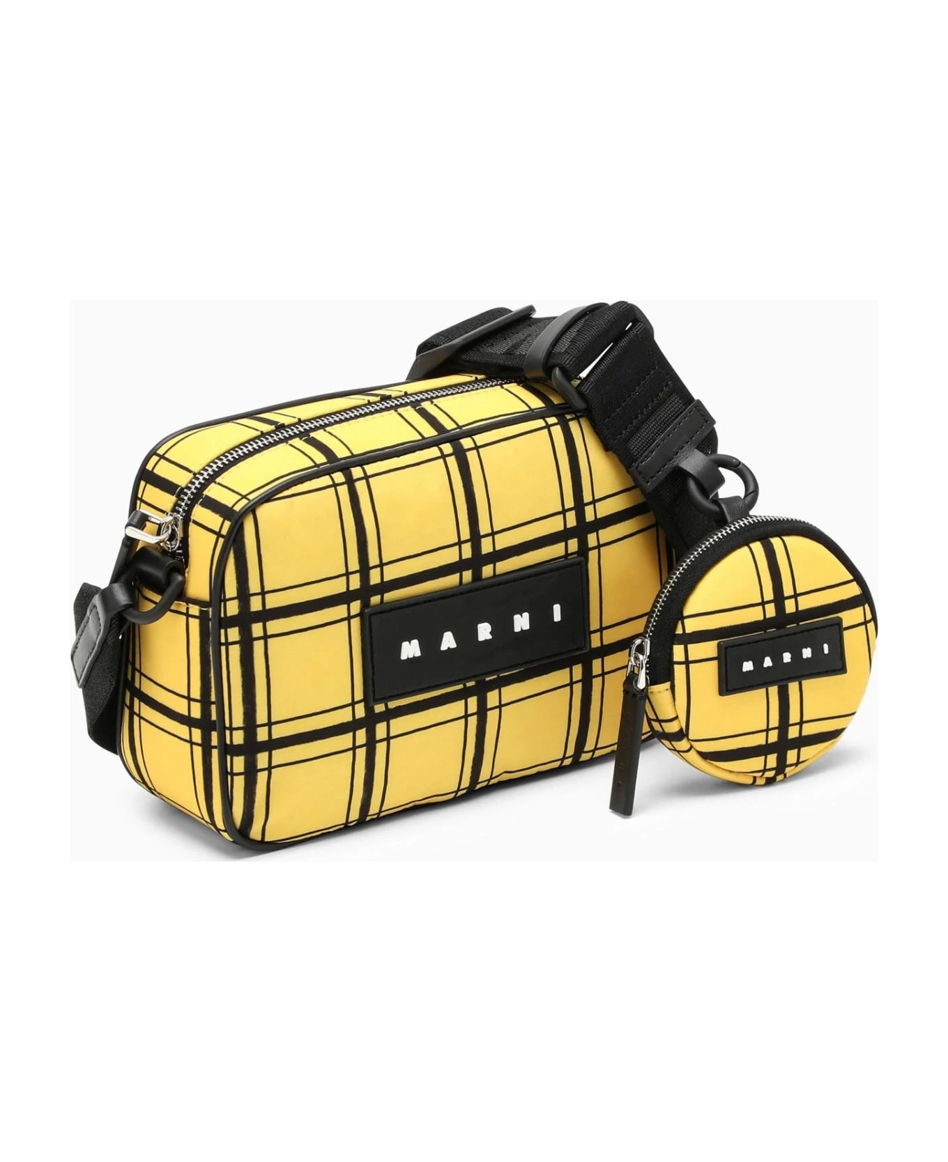 Yellow nylon messenger bag from Marni featuring a check pattern, removable external pouch with zip fastening, top zip closure and adjustable shoulder strap.