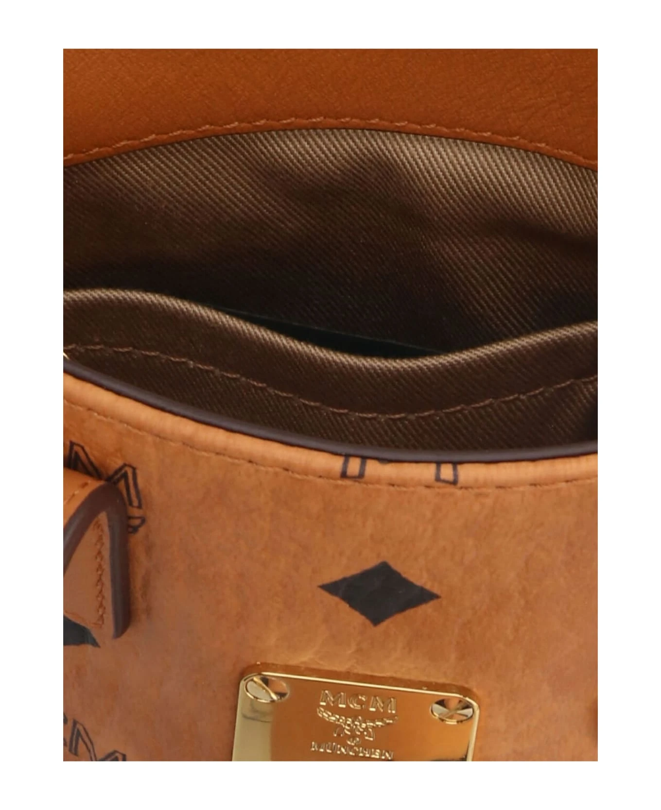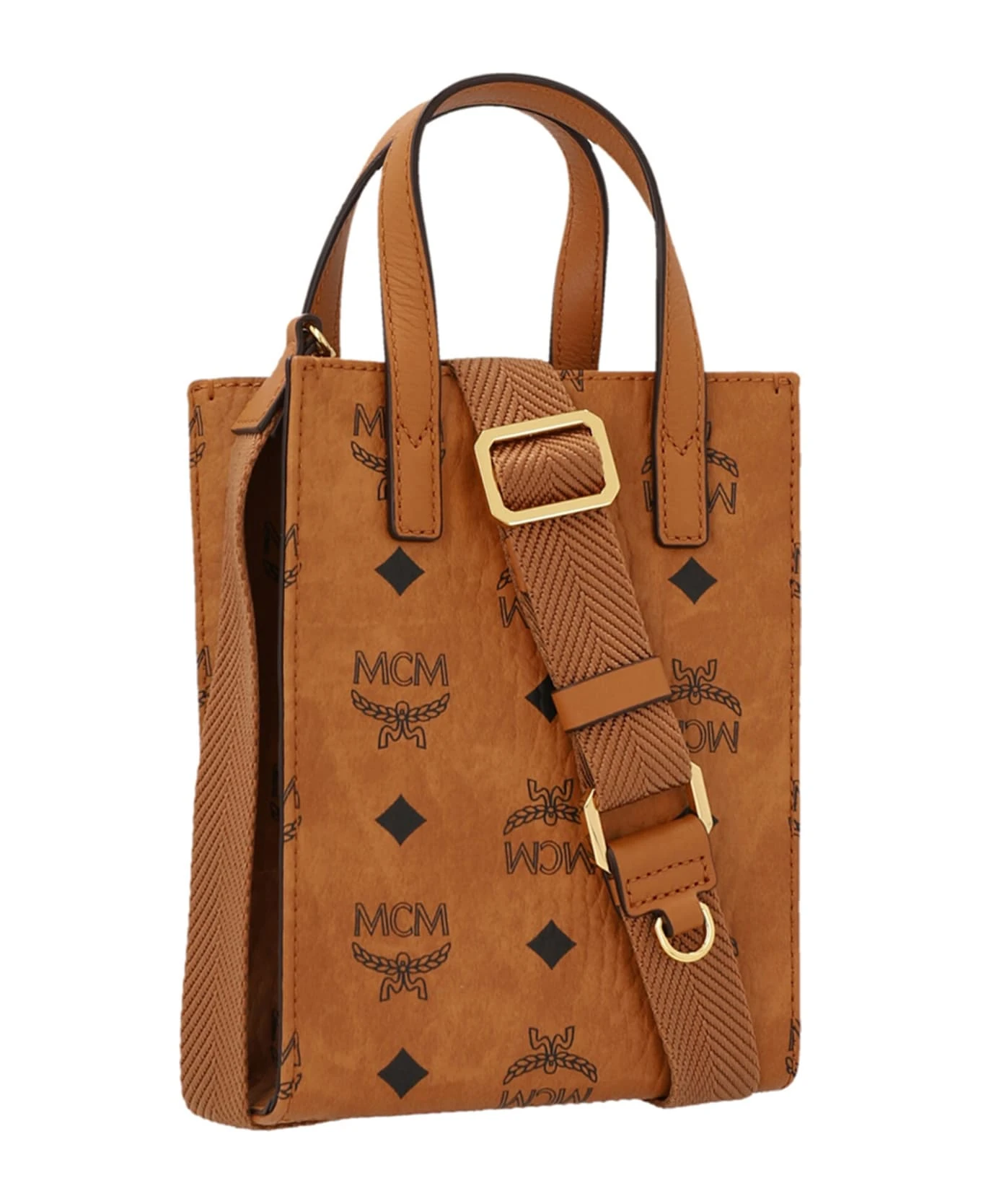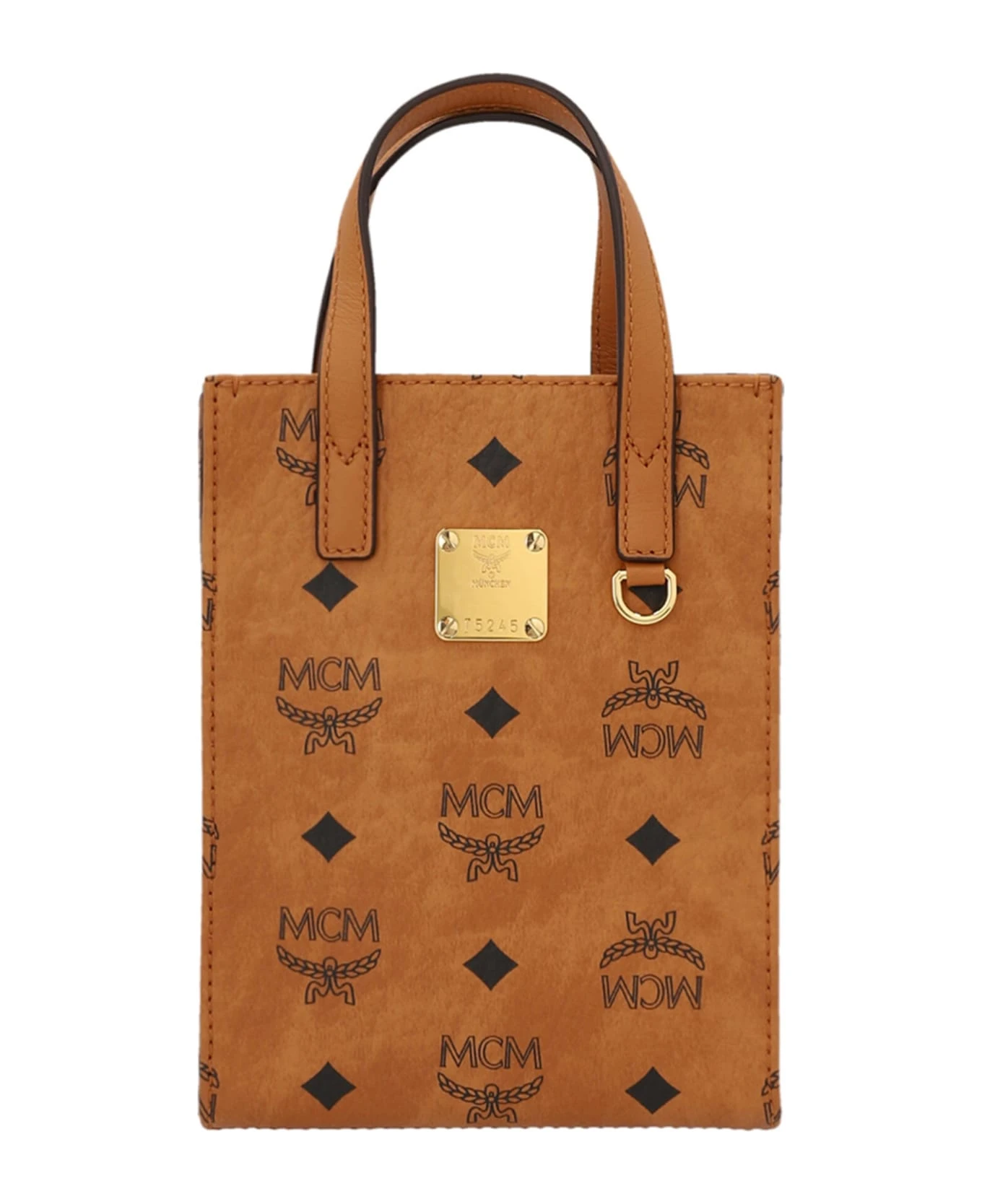 M Veritas Tote X Mini leather crossbody bag with all-over logo print, double handle, adjustable shoulder strap.