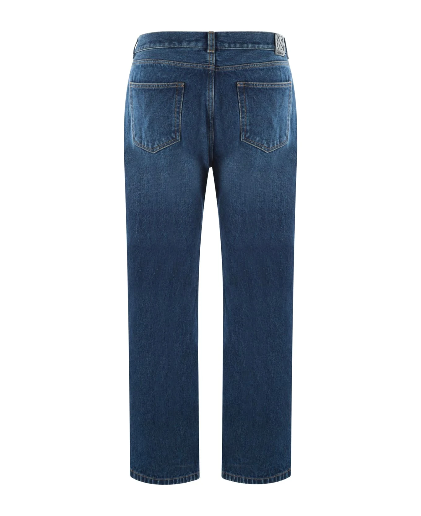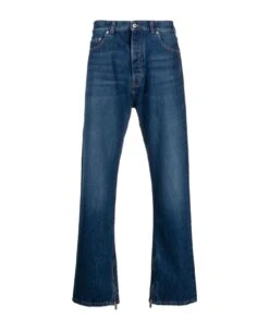 Blue cotton denim jeans, logo patch to the rear, high-waisted, belt loops, straight leg, front button fastening, classic five pockets, ankle zips
