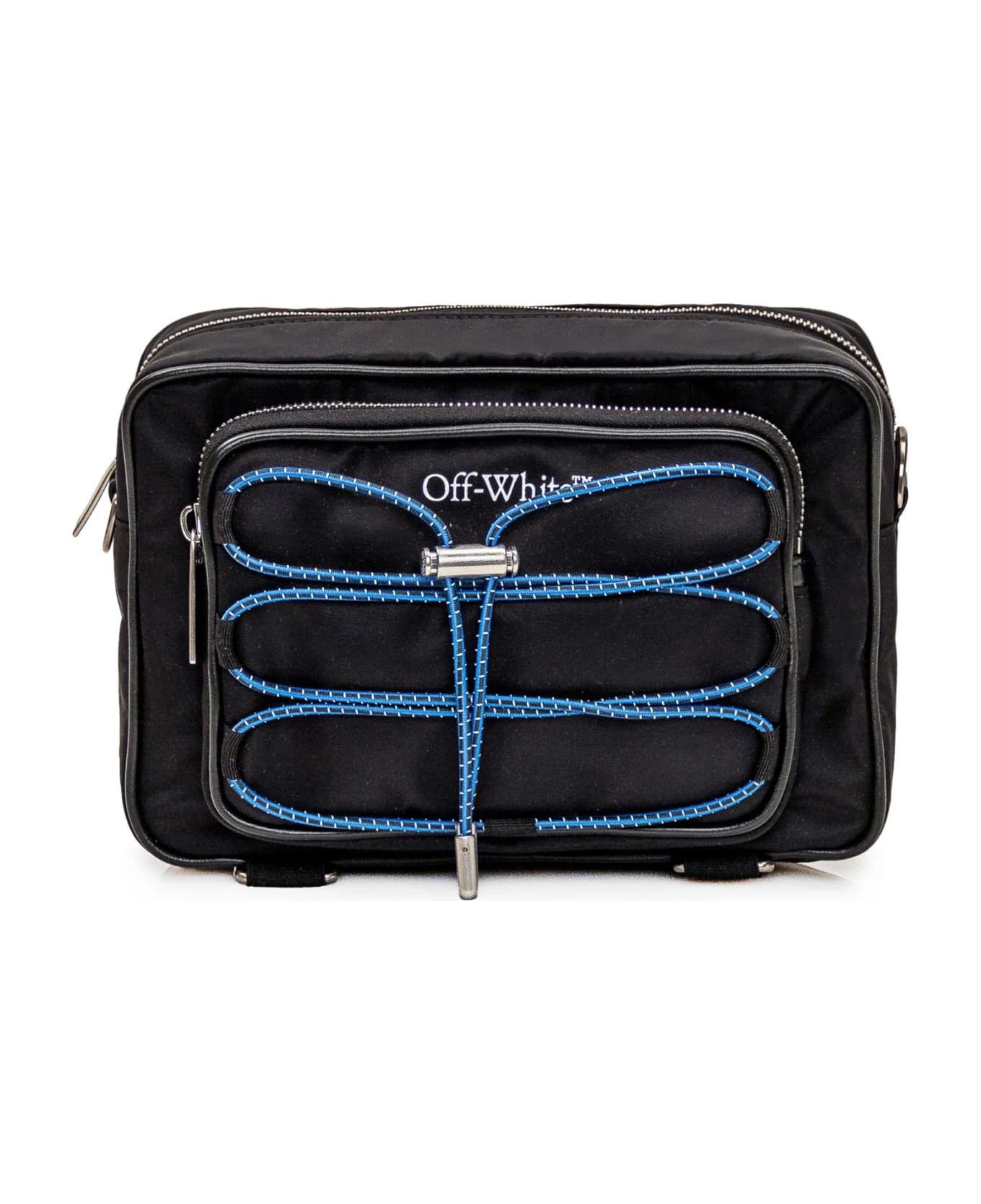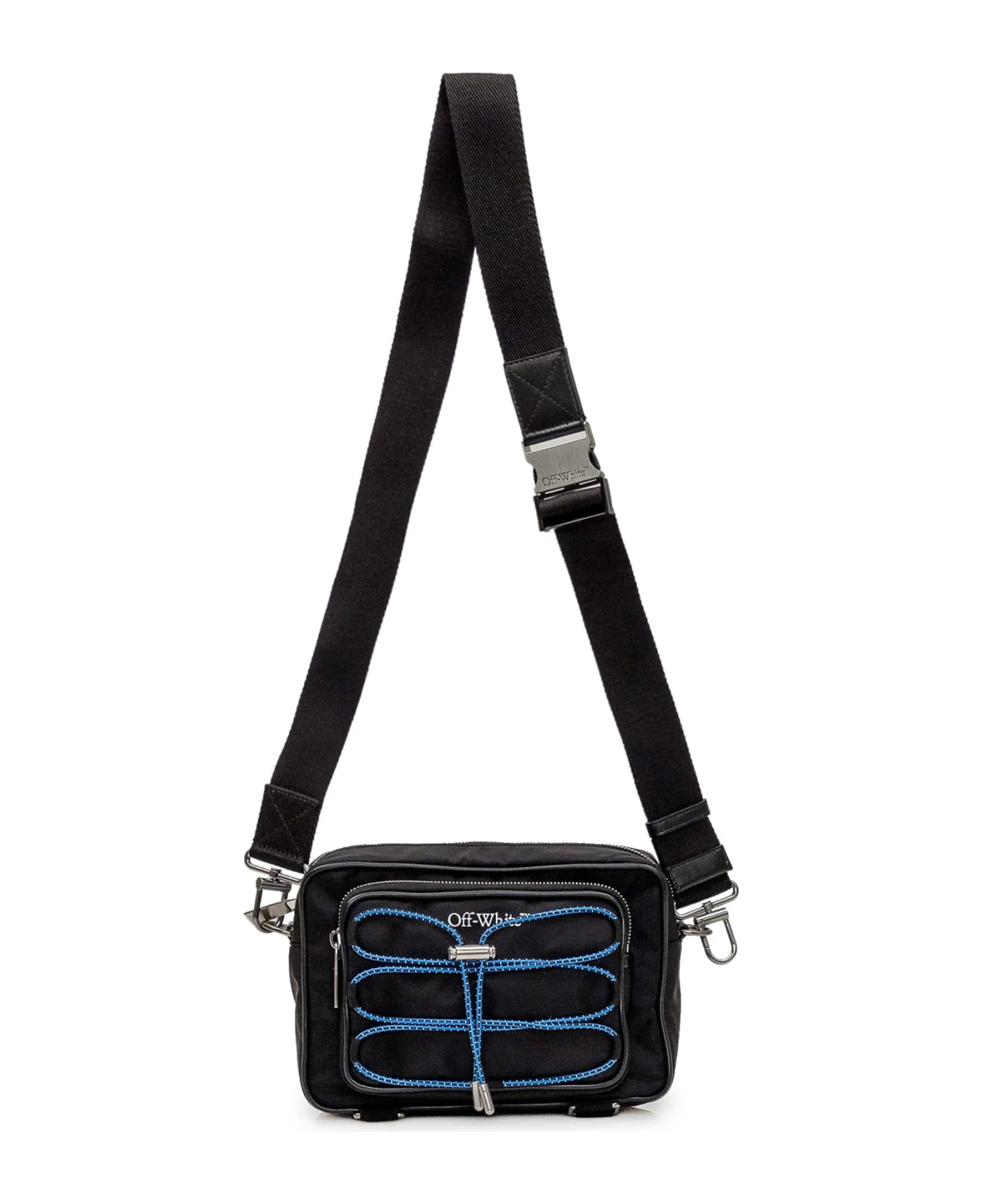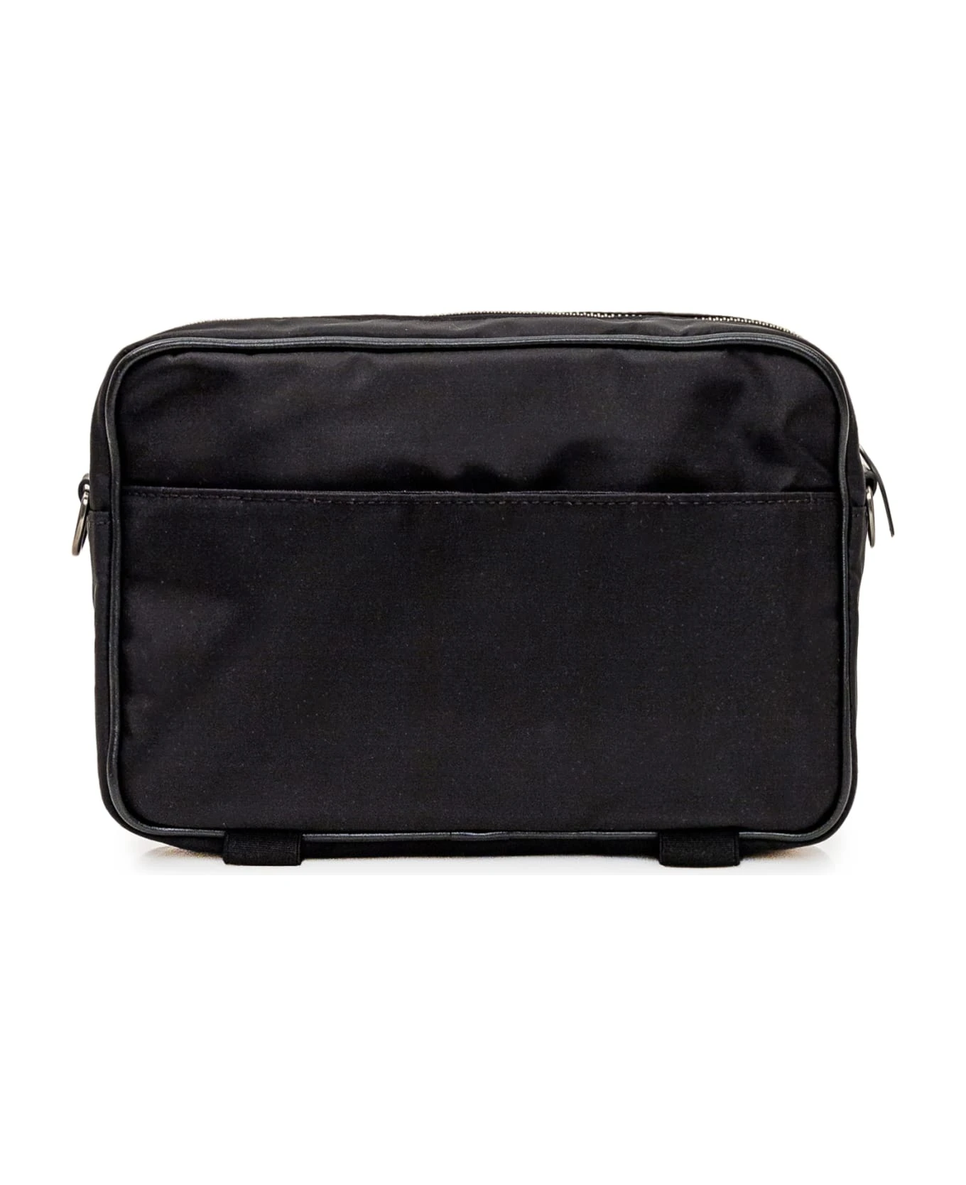 Black shoulder bag. Print with logo on the front. Top zip closure. Front zip pocket. Adjustable shoulder strap. Buckle closure and rope detail.