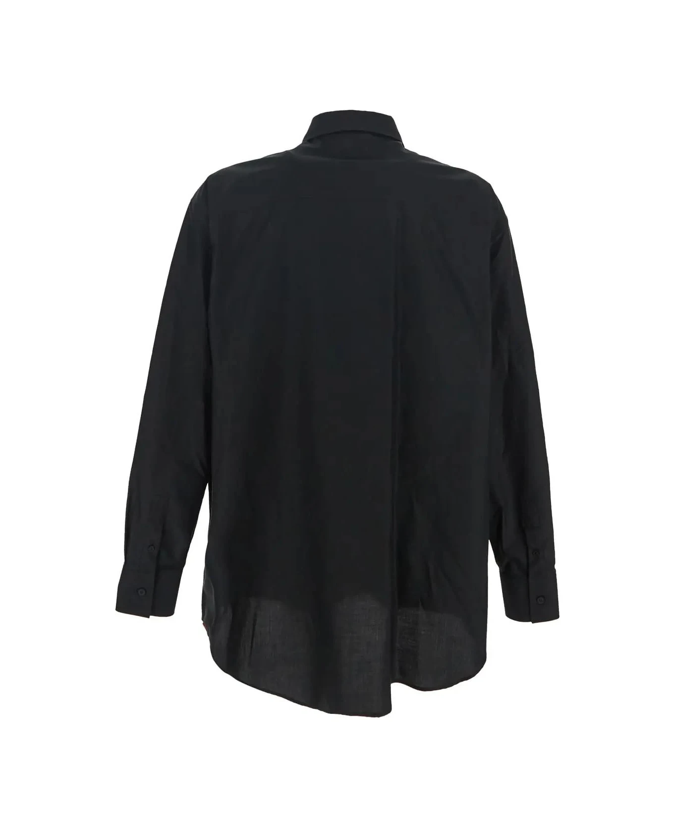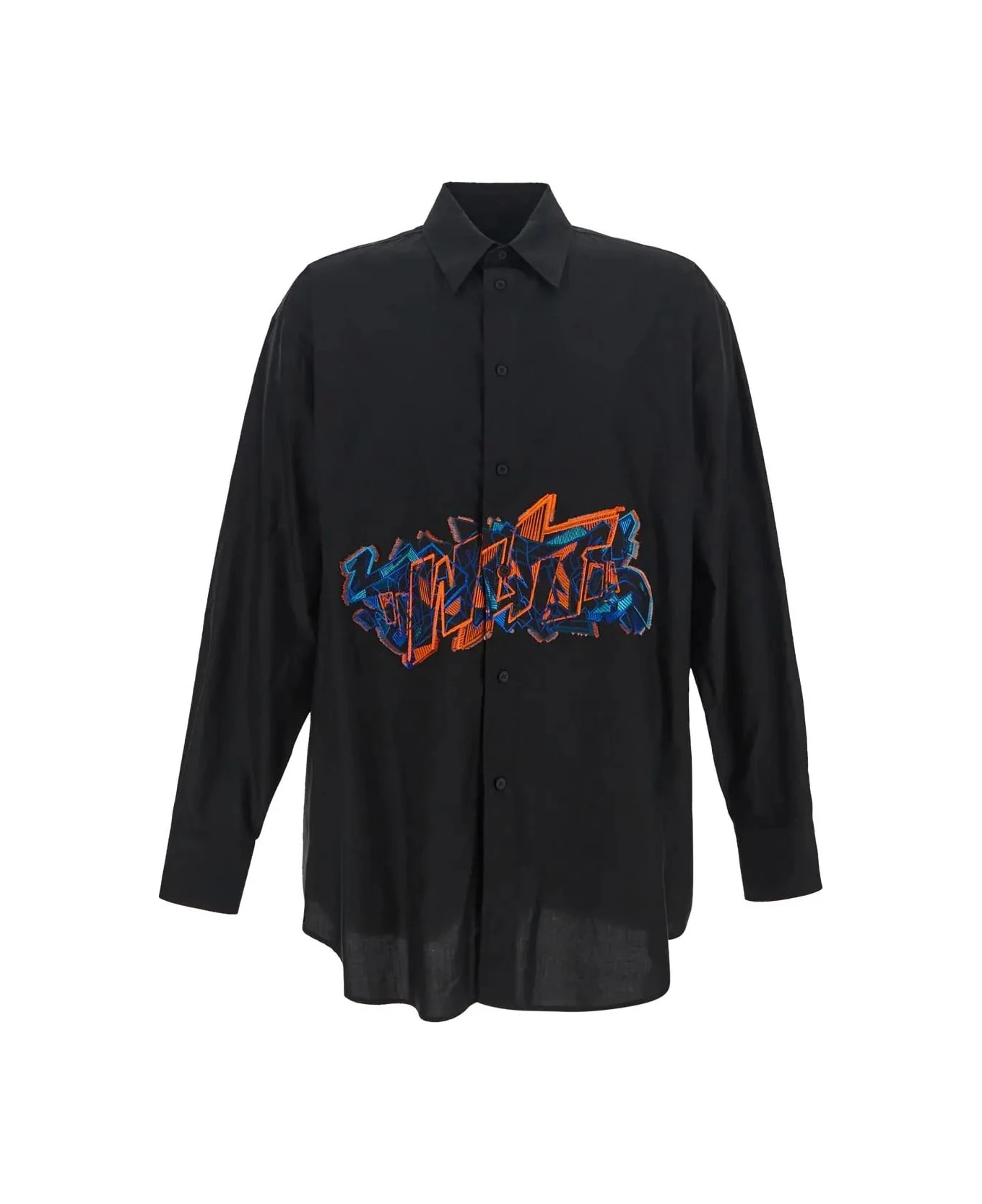 Off-White over shirt in black organic cotton with multicolor graffiti embroidery on the chest, pointed collar, long sleeves, buttoned cuffs, U-shape hems and button closure.