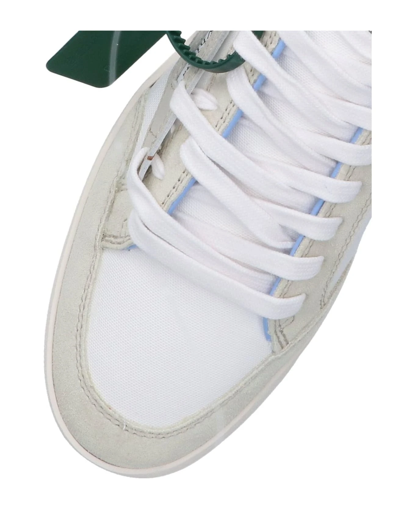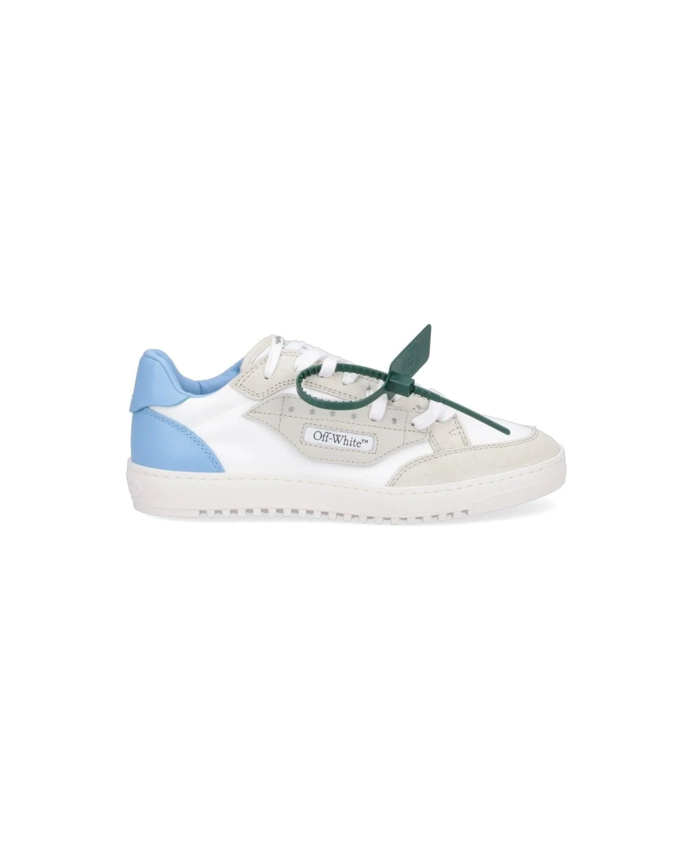 Off-White low Off Court sneakers in white leather with gray suede panels, round toe, laces, contrasting logo tongue, iconic green lace-up tag, black side logo, light blue back tab, rubber sole.
