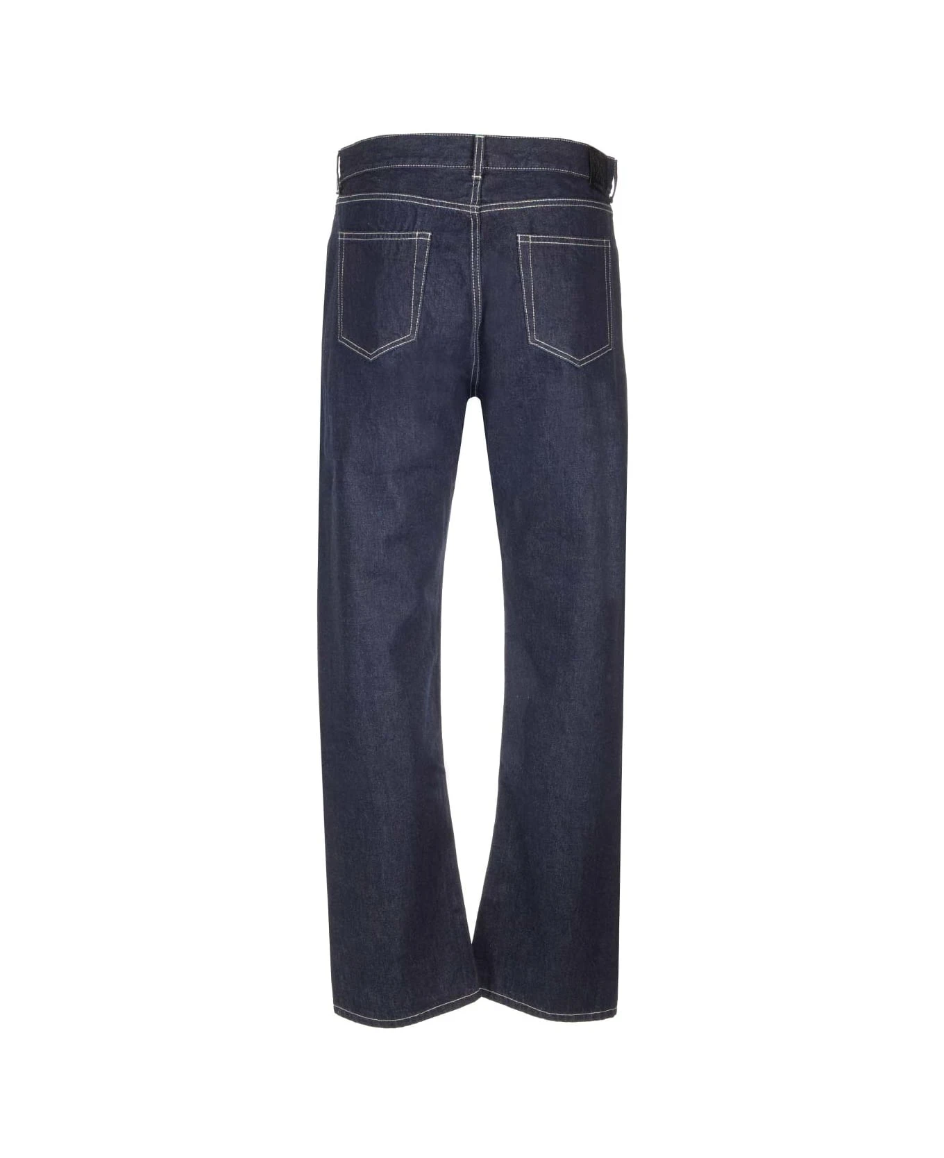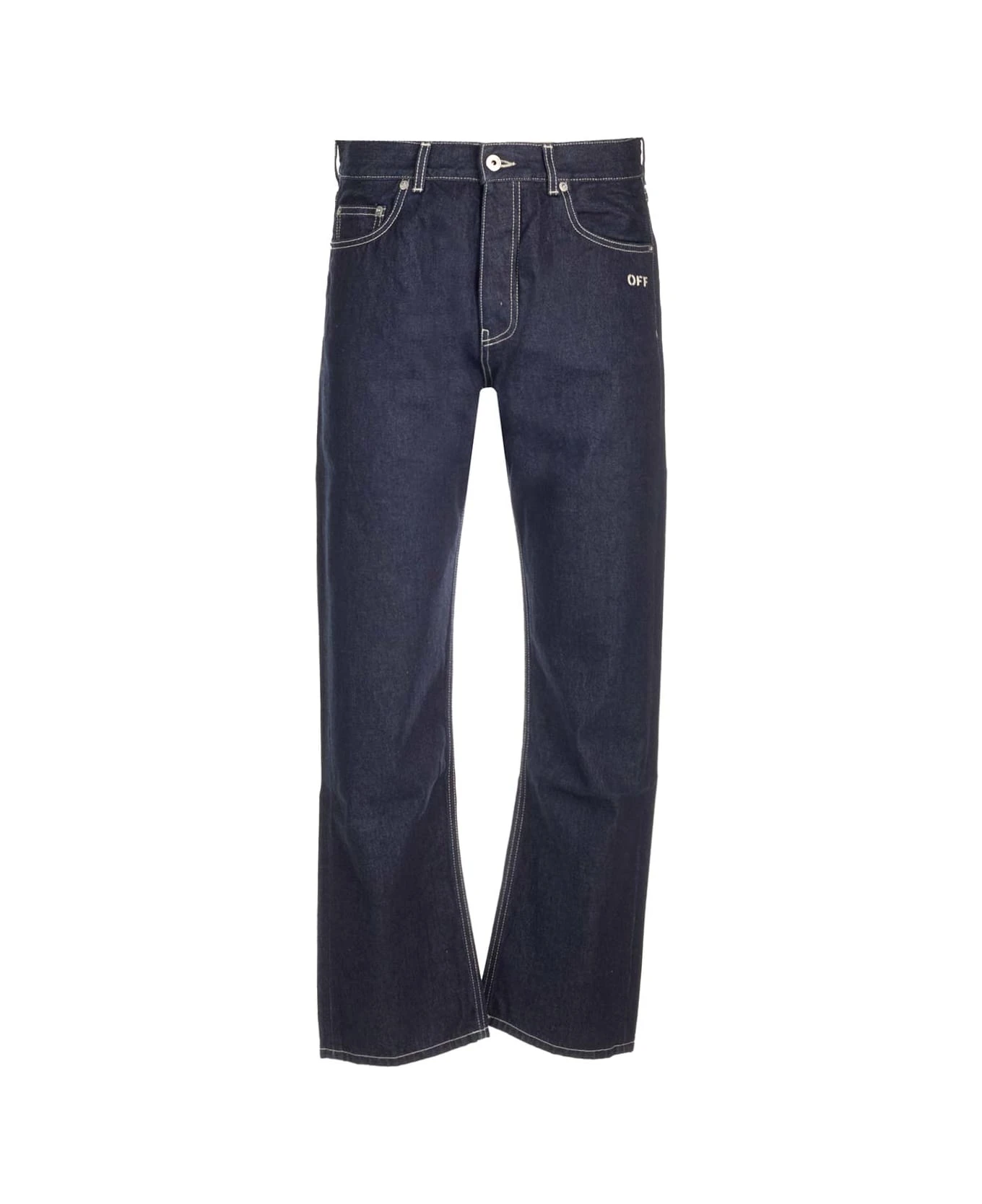 ‘Sierra Leone’ straight jeans in blue denim with white stitching from Off-White, featuring straight leg, medium waist, 5 pockets.
