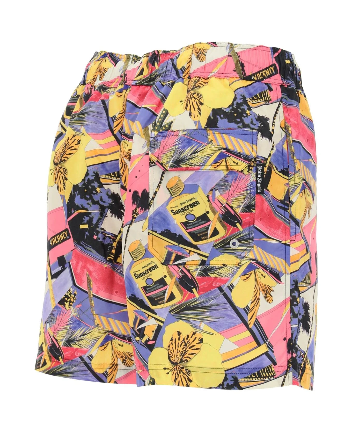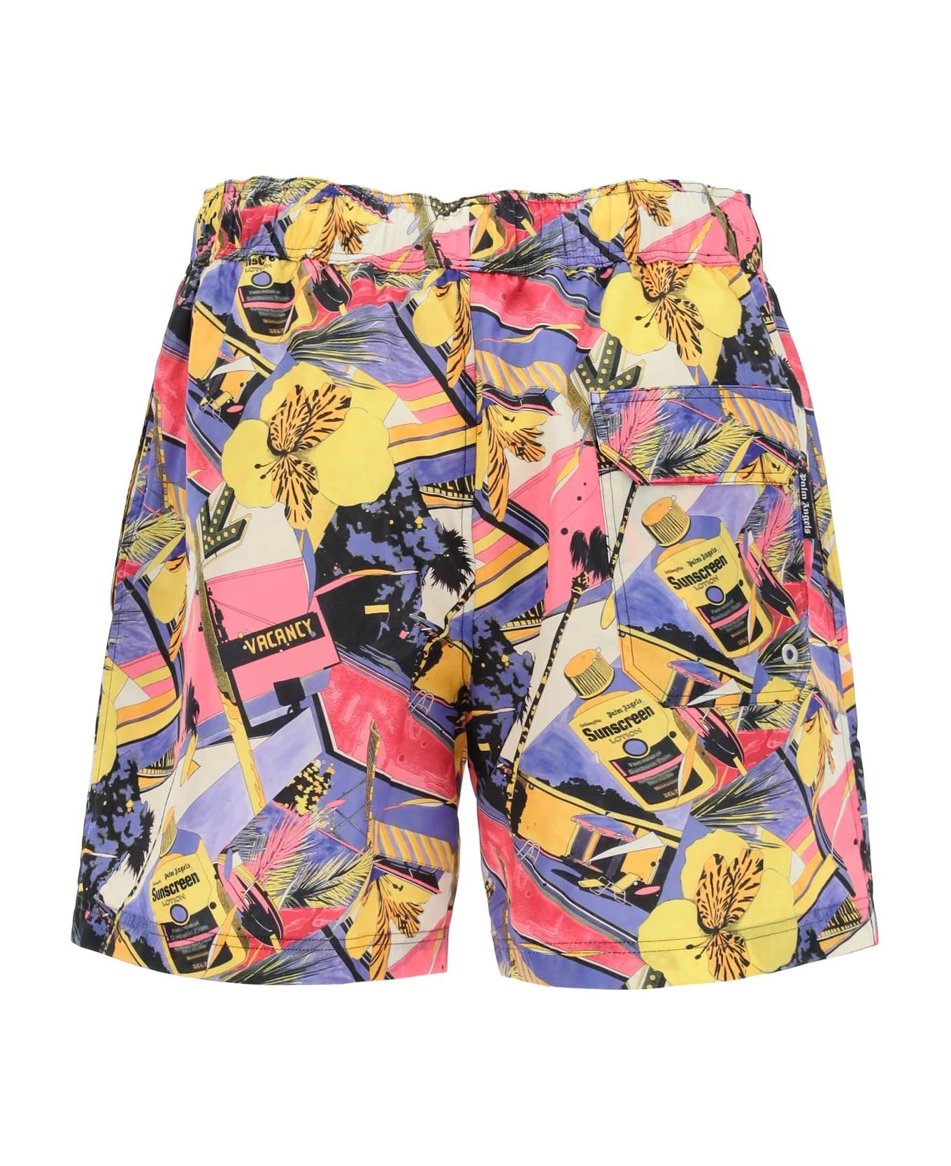 Palm Angels swimtrunks in technical fabric with ‘Miami Mix’ print. Elasticated waistband with drawstring, side welt pockets and one rear welt pocket. Stretch micro-mesh inner briefs.
