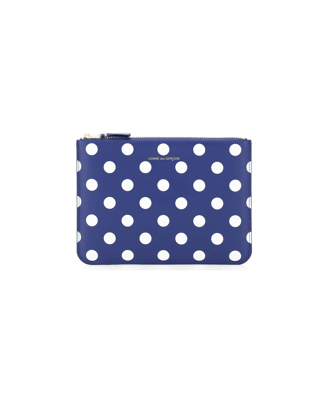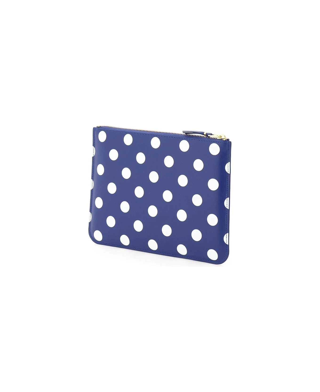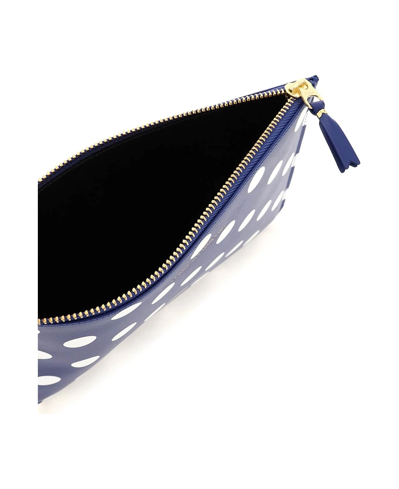 Comme des Garçons leather pouch with all-over printed dots. Zip closure, gold-printed logo, leather lining. Gold-tone metal hardware.