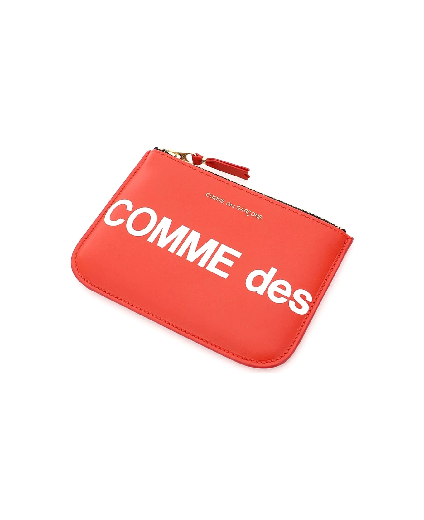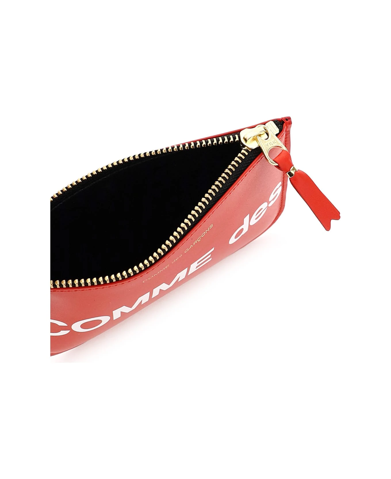 Comme des Garçons leather pouch with maxi logo print, zip closure and gold-tone logo print on the front. Leather-lined interior, gold-tone metalware.