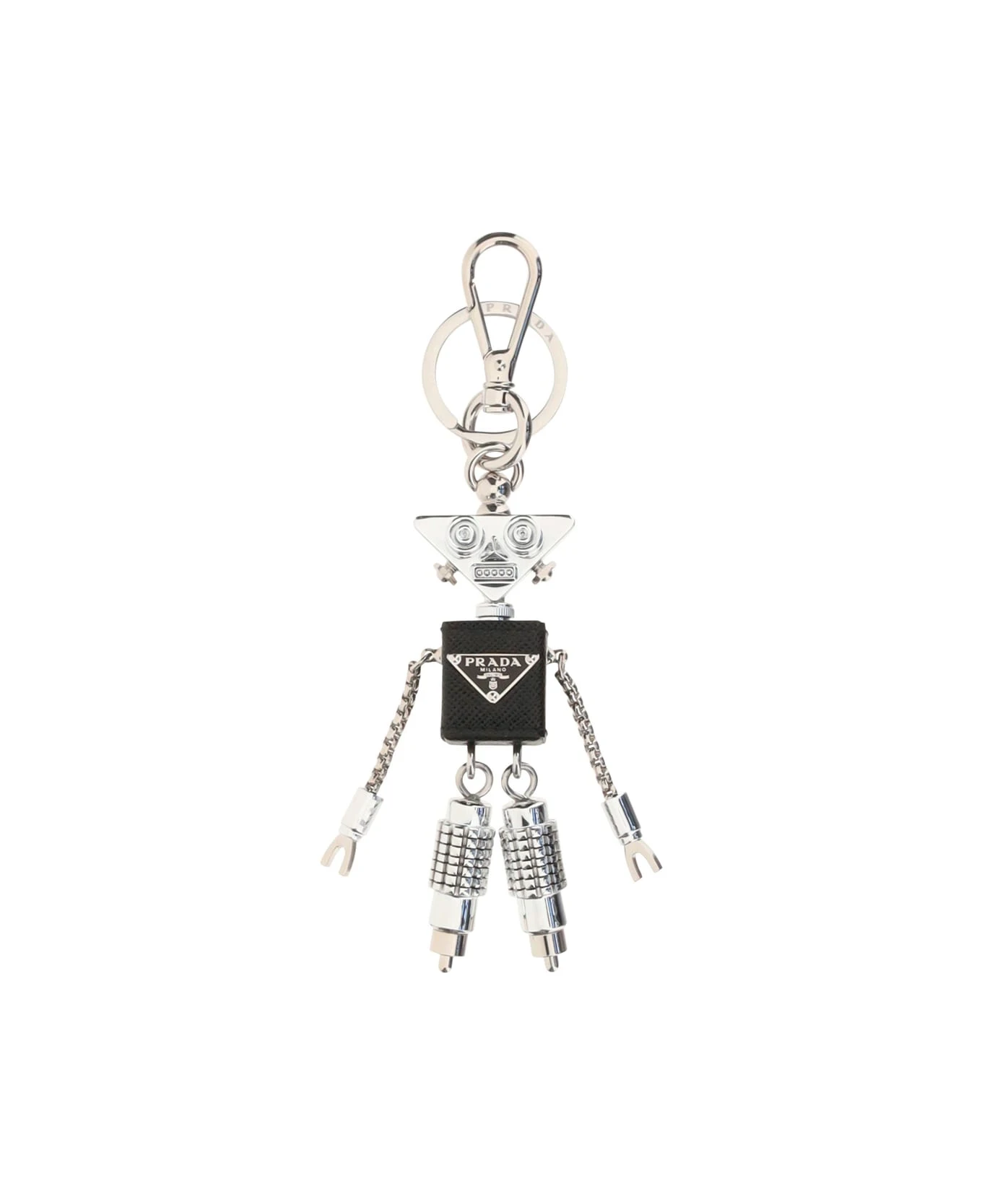 Jack keychain by prada, robot keychain, saffiano leather details, mix of details and applied electrical pins, ring hook with steel trim, iconic triangular brand logo with signature on front.