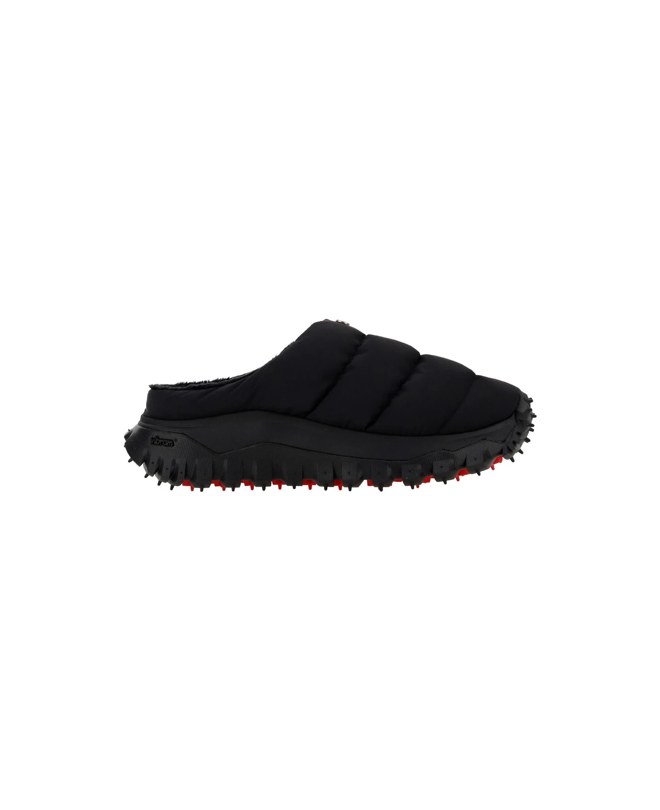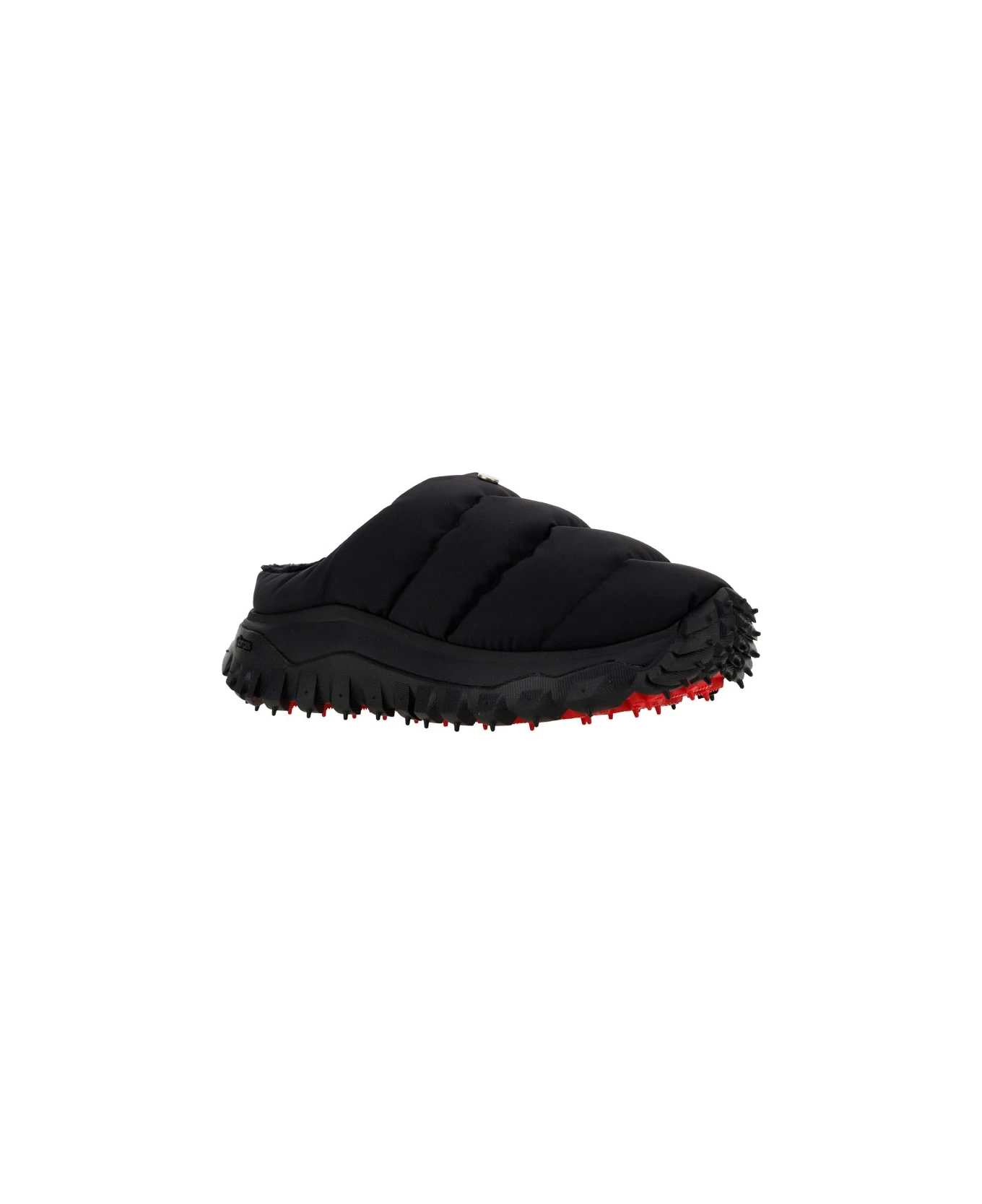 Puffer mule sandals by moncler alyx, slip-on style, padded and quilted design, rounded toe, vibram rubber sole with knurled details, matching faux fur lining.