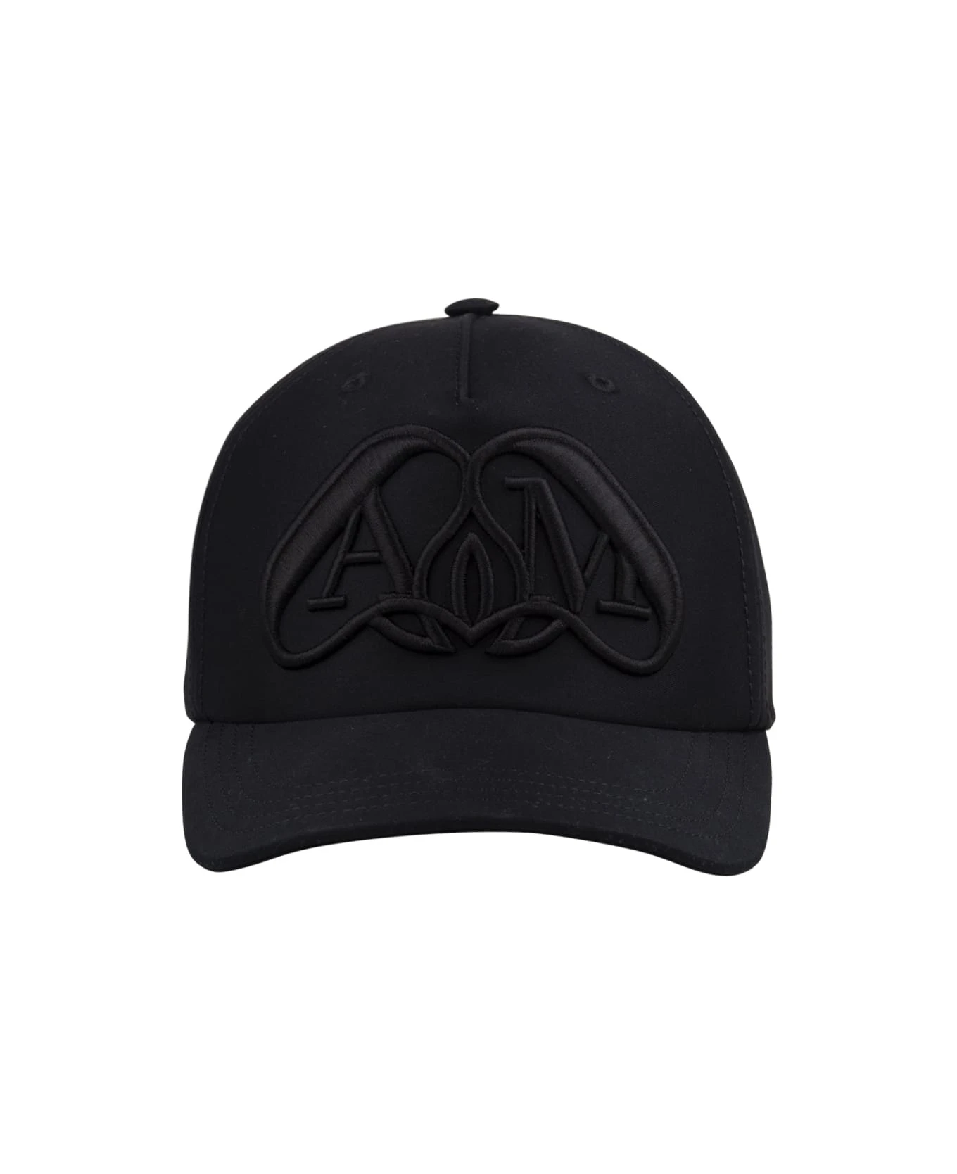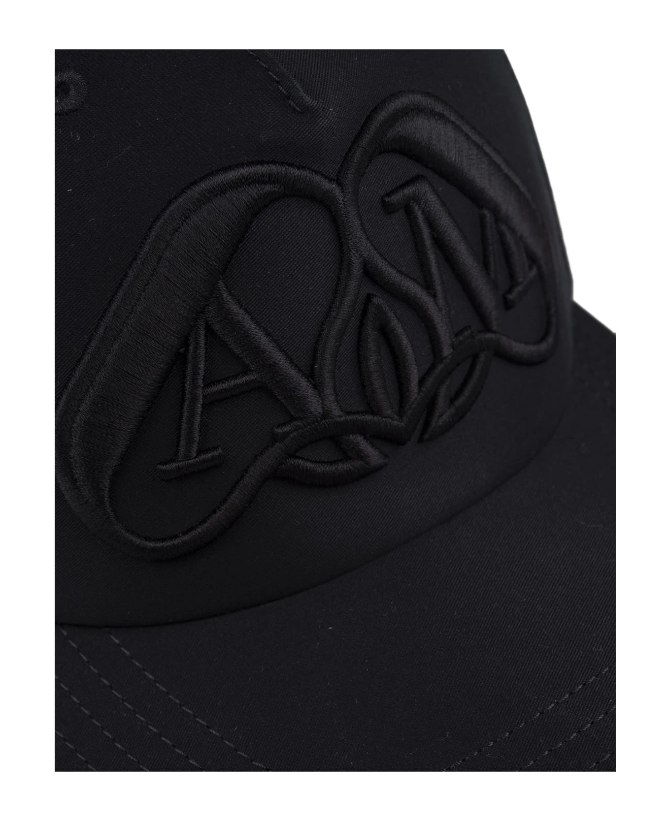 Alexander McQueen baseball cap made of black cotton and finished on the front with tone-on-tone Seal Alexander McQueen embroidery. Model with ventilation eyelets and metal buckle fastening on the back.