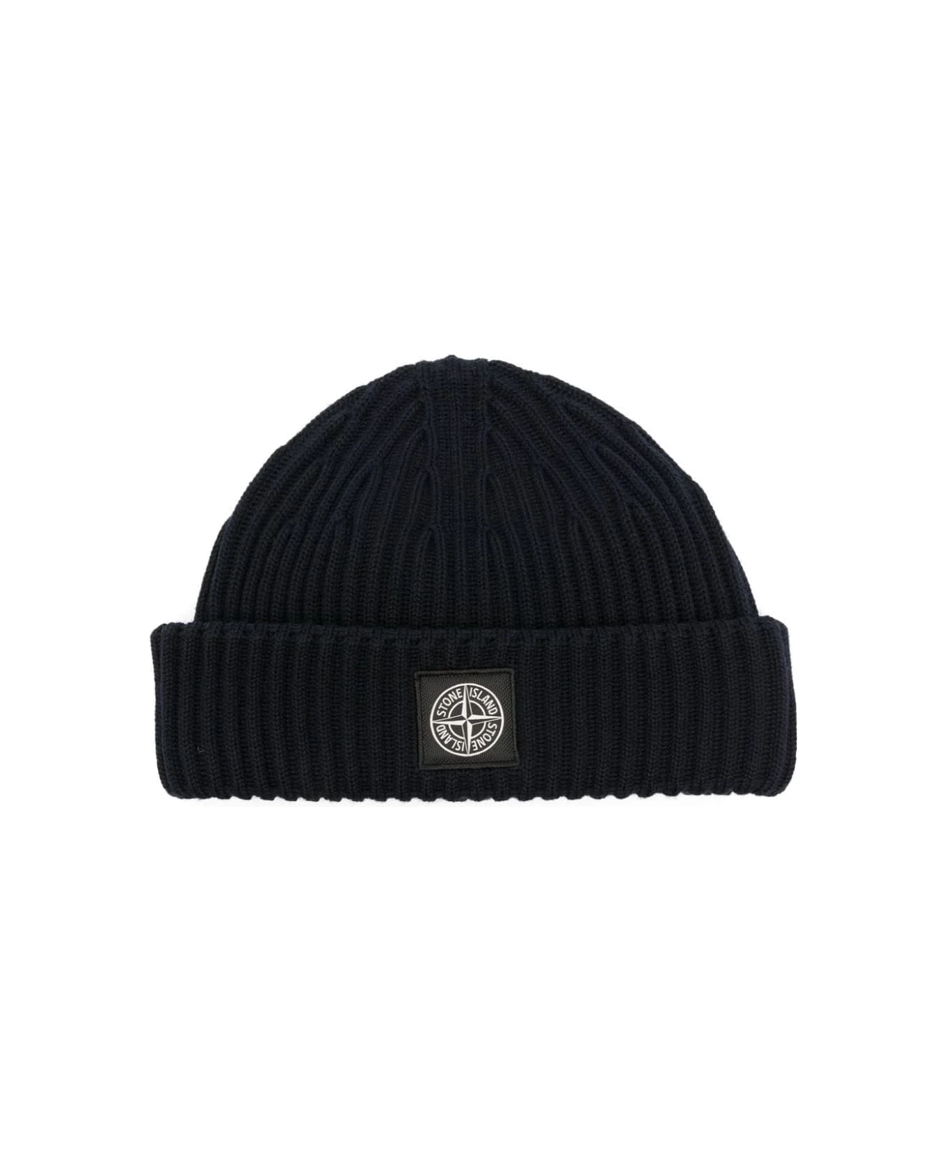 Stone Island beanie made of ribbed wool in navy blue with Stone Island Wind Rose logo applied to the lapel.