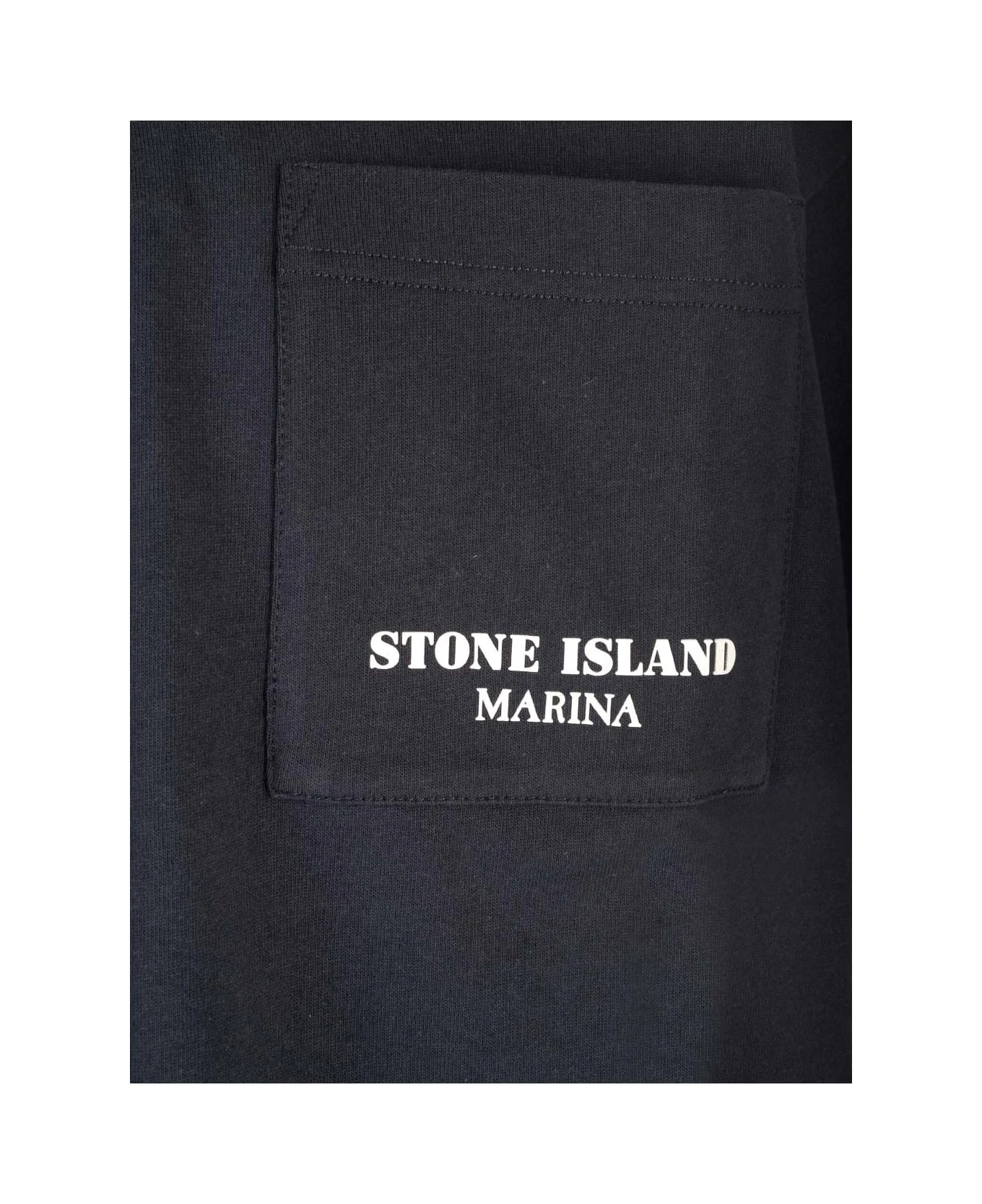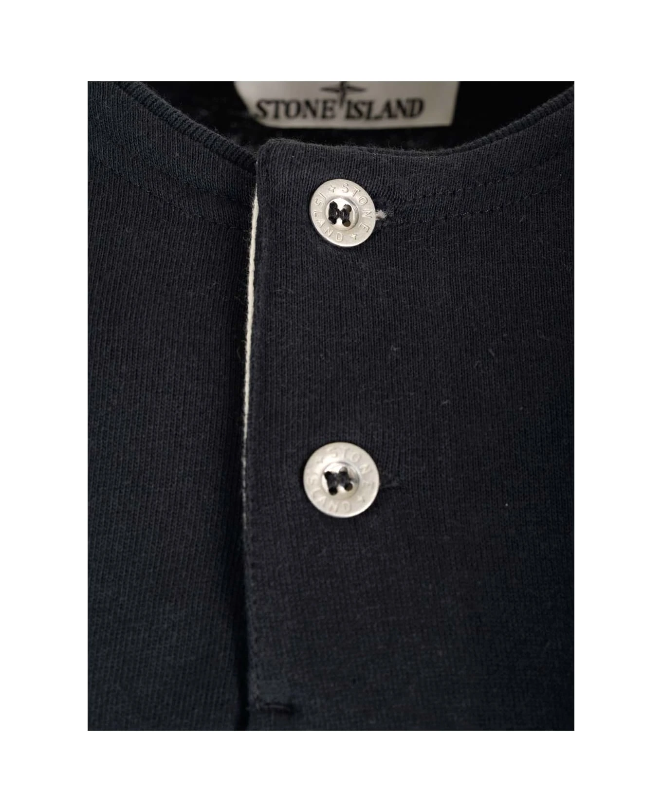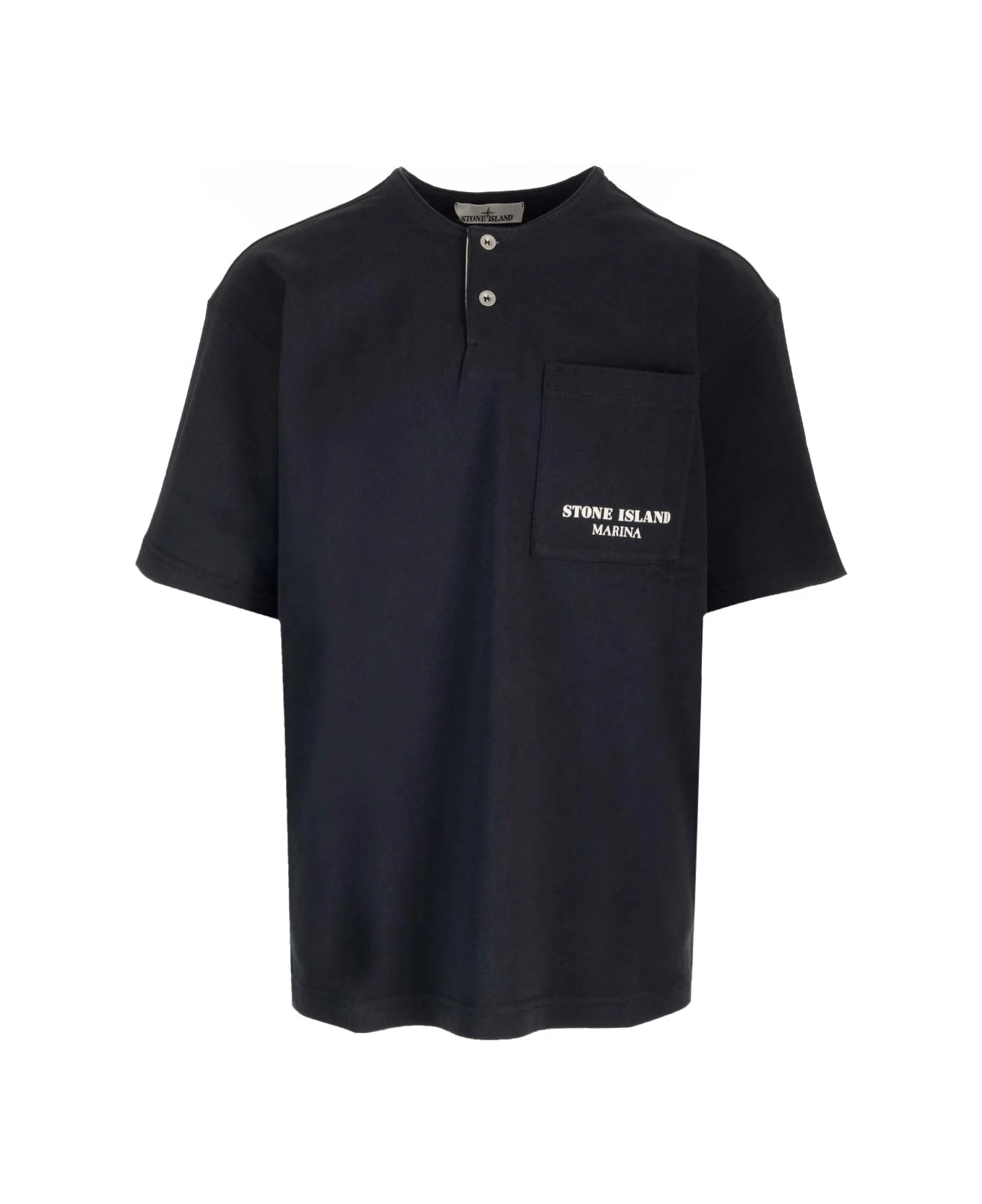Blue cotton t-shirt by Stone Island with buttons and patch pocket with white lettering logo.
